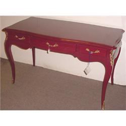 HIGH GLOSS BURGUNDY LACQUERED FRENCH STYLE THREE-DRAWER BRONZE MOUNTED WRITING TABLE, by Century…