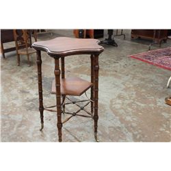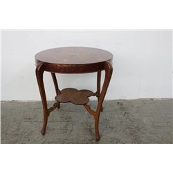 20" ROUND OAK DRUM TOP PARLOR STAND W/ BEADED SKIRT - 4 LEAF CLOVER UNDER SHELF - BOWED LEGS