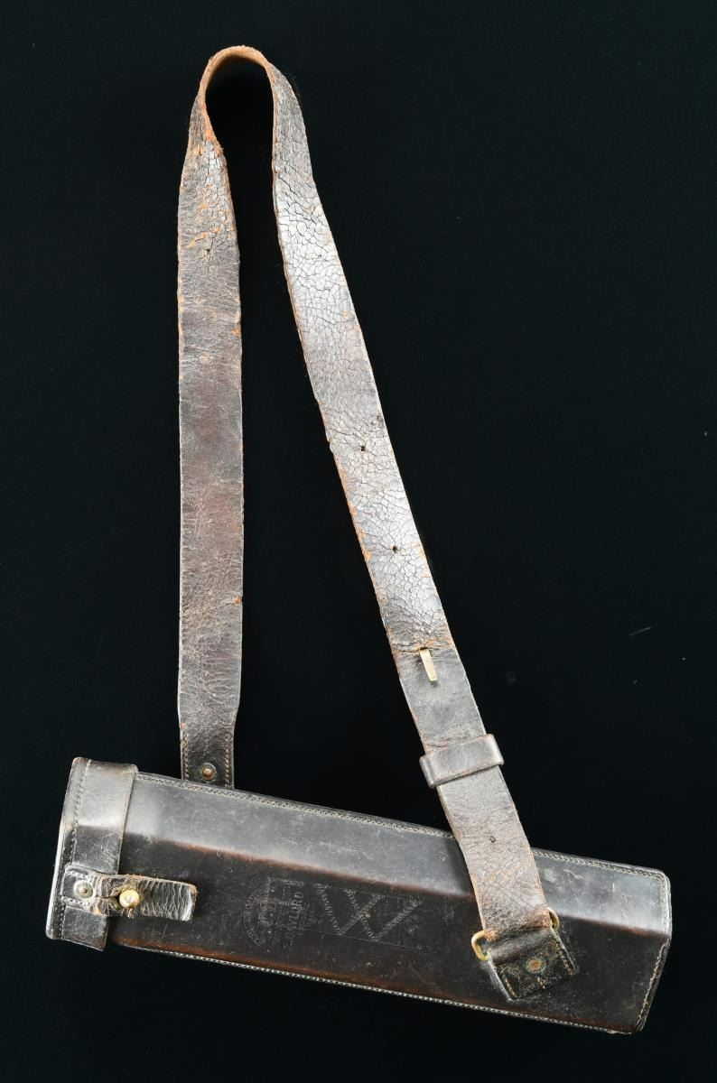 BOX. This 70 rd. Blakeslee cartridge box was invented by Col. Erastus Blakeslee who commanded the 1st Connecticut Cavalry during the Civil War. His unit was armed w/ 52 cal. Spencer carbines early in 1864. Blakeslee saw a need to increase the effectiveness of the Spencer carbine by increasing its rate of fire. This box allowed the soldier to load 7 rds. from a tin tube in roughly the time it took to load 1 rd. prior to his invention. The box can be found in 6, 10 & 13 tube variations allowing the soldier 42, 70 or 91 quick loading rds. enhancing the effectiveness & rate of fire. This box represents 1 of 32,000 produced by Emerson Gaylord in 1864-1865. The box is embossed on the front "BLAKESLEE'S CARTRIDGE BOX / U.S. / PAT'D DEC. 20.1864 / E. GAYLORD / CHICOPEE / MASS.". A soldier has carved his initials, "F. W. " on & below the Gaylord mark. The box is leather covered wood w/ 10 interior tin tubes. Seams are stitched. Closing tab is stitched & riveted. Suspension strap rings are also stitched & riveted. This example also boasts its original suspension sling. CONDITION: box shows very light wear overall w/ flexing noted on the closing tab & the suspension strap. This box likely rates as one of the finer examples known. PROVENANCE: From the Collection of James B. Taylor. (02-19870/BF). $4,000-5,000.