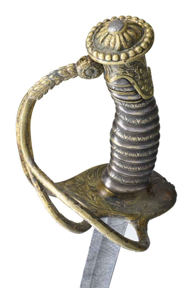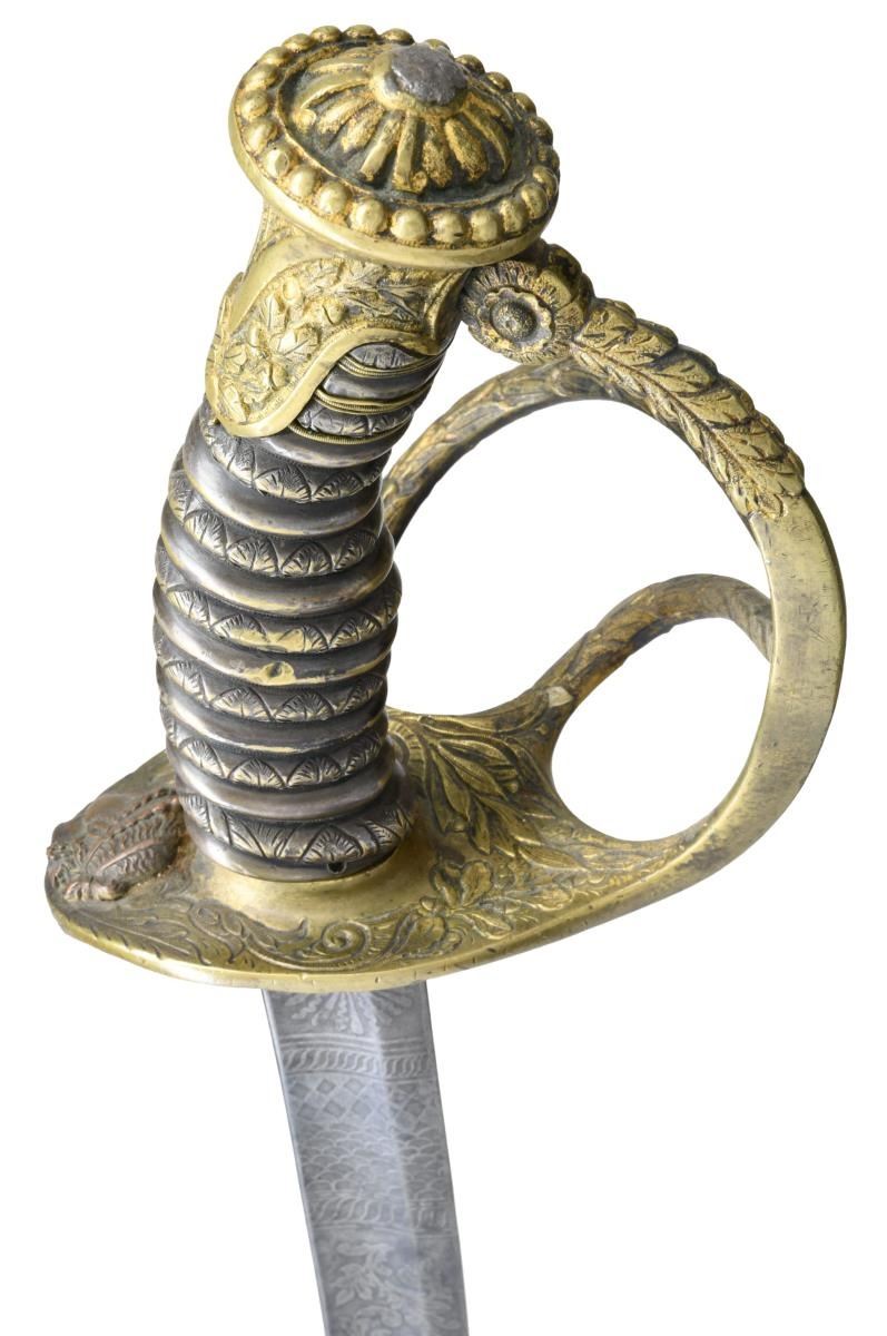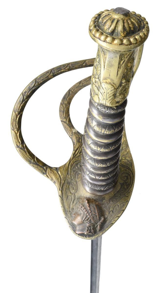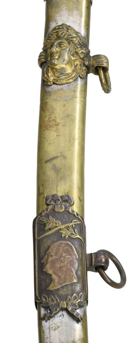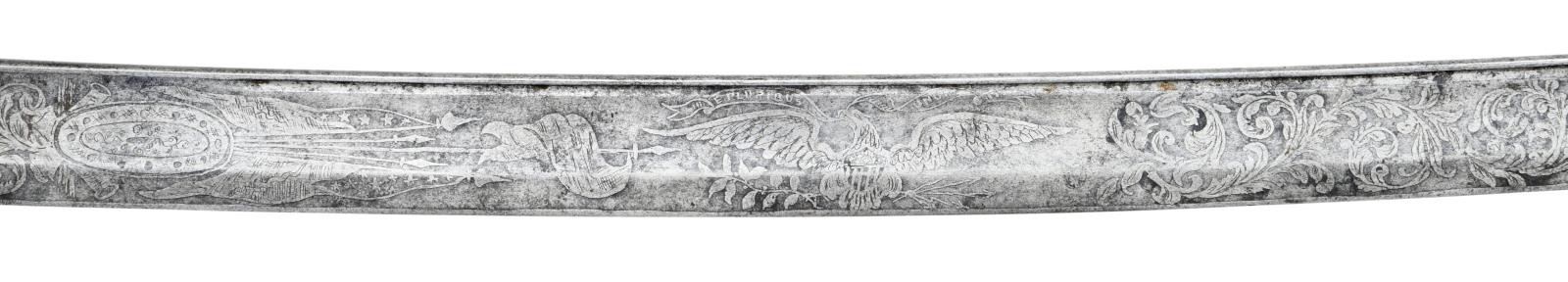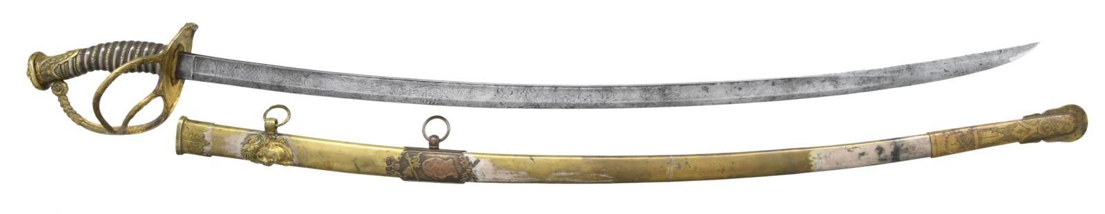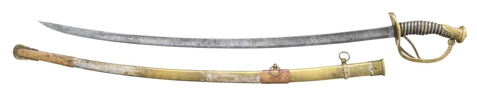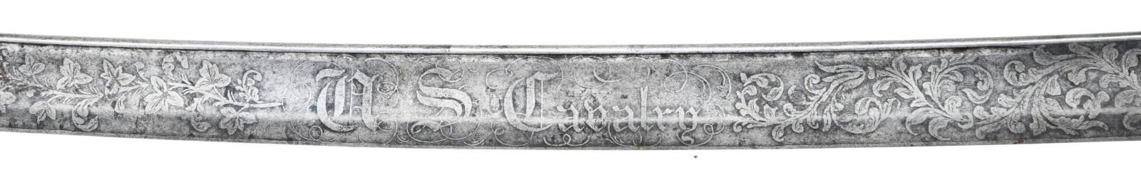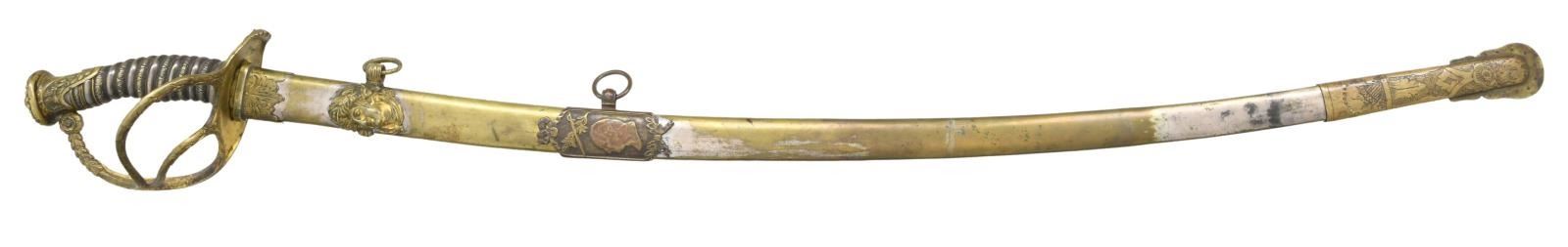 34" etched blade with patriotic panels including "US CAVALRY" in fancy script. Spiral silver plated metal grip, engraved hilt & pommel with raised relief "Liberty" head on quillon, a rare feature. The silver plated brass scabbard has as top mount raised relief head of "Lady Liberty", the middle mount has bust of George Washington and drag is engraved. The middle mount and drag are added from another manufacturer and not original to this sword. Very attractive sword once in collection of Don Ball. CONDITION: very good overall, saber appears original and complete other than missing most of its twisted wire grip wrap. The scabbard appears original to saber with additions of middle mount & drag as noted, both mounts are original from Civil War. (02-19259/JS). $1,500-2,500.