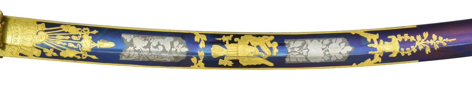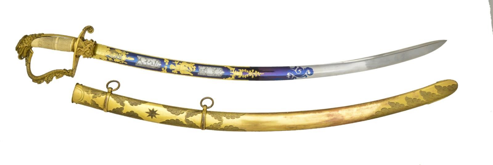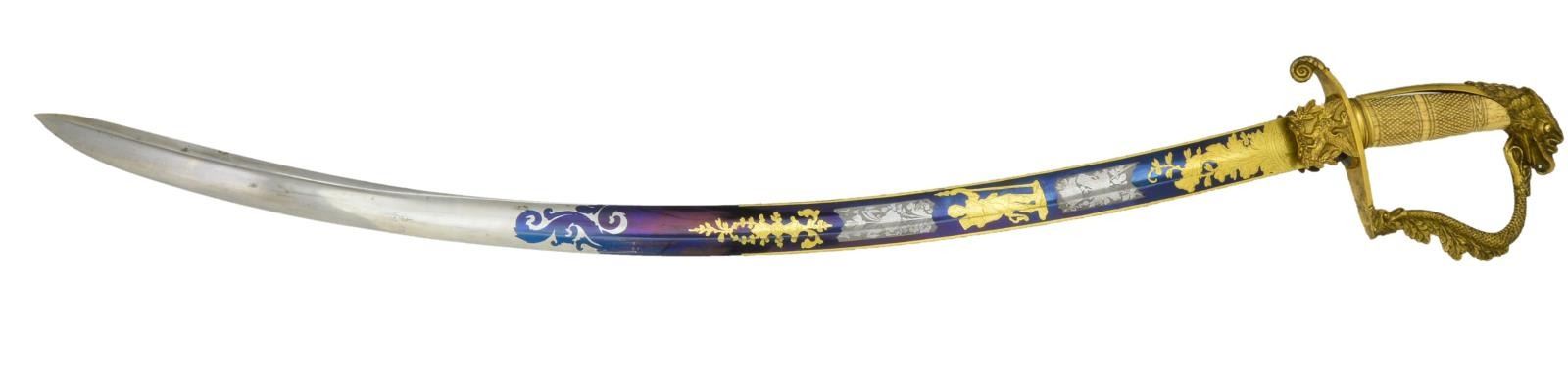 SABER WITH SERPENT GUARD & EXQUISITE TRI COLOR BLADE LIKELY ASSOCIATED WITH THE STATE OF VIRGINIA. Overall length: 36". Blade length: 29 3/4". Incredibly, the single fullered blade has virtually 100% of the original gilded engraving, over fire blue, with white panels over 2/3 of the blade. The gilded engraving includes a large spray of arms, raised wing American eagle, Indian head & various foliate motifs. Also, on one side of the blade between the 2 patriotic and foliate white panels, is a gilded rendition of what appears to be Virtus, the Goddess of bravery and military strength. The inclusion of the Virtus rendition indicates a possible association with the State of Virginia. Gilded brass hilt with finely executed raised wing eagles on each languet. The guard terminates with a swirled quillon on 1 end and connects to a gracefully articulated serpent knuckle bow with oak leaves and acorns. The head of the serpent joins with the detailed eagle head pommel forming a very impressive hilt. Carved and crosshatched certifiably antique ivory grip with horizontal banding. Heavily gilded scabbard with deeply engraved oak leaves extending 7 1/2" from the tip and 14" from the throat. There is a central 8 pointed star between the scabbard bands. CONDITION: blade is truly like new with substantial original factory polish present. The engraving, combined with the blued and gilded decoration, visually jumps right off the blade. Hilt retains the majority of the original gilded finish. Grip shows only tiny age cracks. Scabbard retains nearly all of its original gilded finish with vibrant engraving. (02-17714/BF). $5,000-7,000.