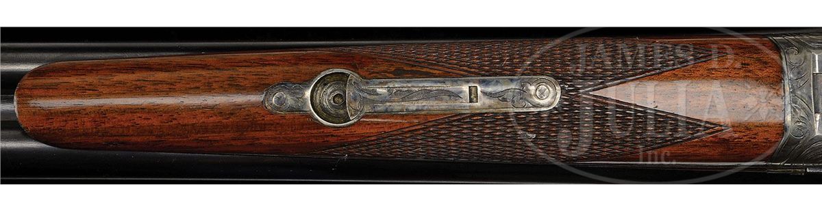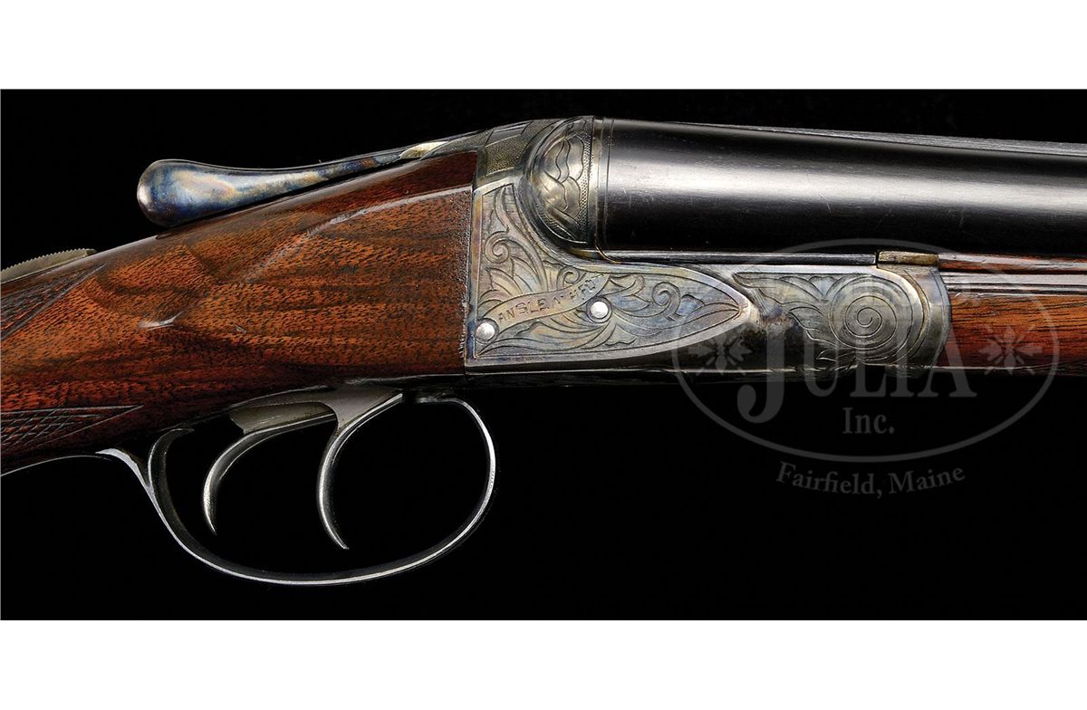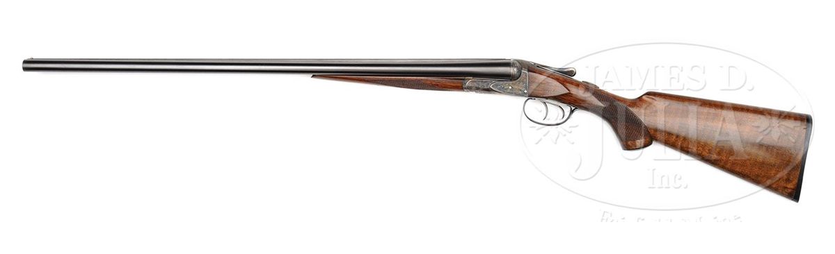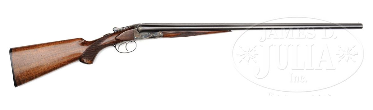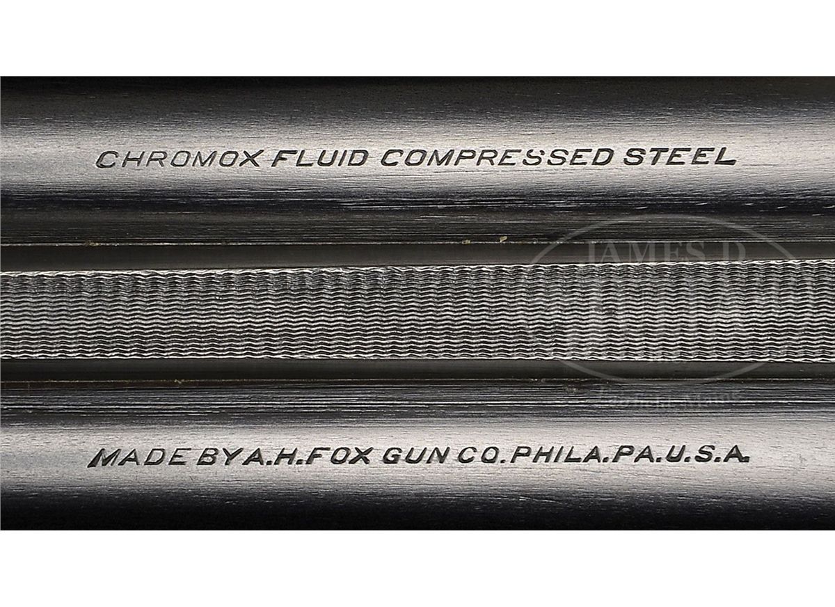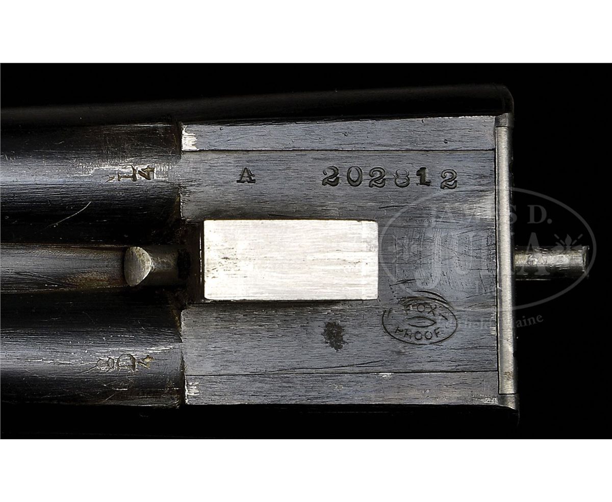 SN 202812. (1916) Cal. 20 ga. 2-1/2" Chambers. 26" Bbls with slightly raised, narrow, matted, concave rib, are marked with "Chromox Steel", and Fox Philadelphia address on tops. Bbl flats are stamped with SN, "A", and Fox proof. Typical A grade action engraved with large foliate motifs and "Ansley H. Fox" on ribands on each side, features automatic safety and double triggers. Blued trigger guard has SN at grip. Lightly fiddle figured American walnut capped pistol grip buttstock measures 13-3/4" over orig ribbed composition buttplate. Coarse point pattern checkering is at grip and on splinter forend with Deeley type release. Bore diameter: left-.616, right -.616. Bore restrictions: left -.027 (Full), right -.005 (IC). Wall thickness: left -.025, right -.027. Drop at heel: 2-7/8", drop at comb: 1-5/8". Weight: 5 lbs. 10 oz. LOP: 13-3/4". PROVENANCE: Woody Frey Collection. CONDITION: Exceptionally fine. Bbls retain nearly all of their orig blue with only a few light scratches, and minor marks. Action retains nearly all of its orig case hardening color, only slightly silvered and thinned on sharp edges and around bottom. Forend iron and latch retain nearly all of their orig color. Trigger guard is exceptional with only the slightest bit of silvering on sharp edges of bow. Stocks have only a few minor marks and light scratches in their orig varnish, which is lightly crazed overall. Bores are excellent. Action is tight. An exceptional lightweight small bore Fox. 4-48476 MGM141