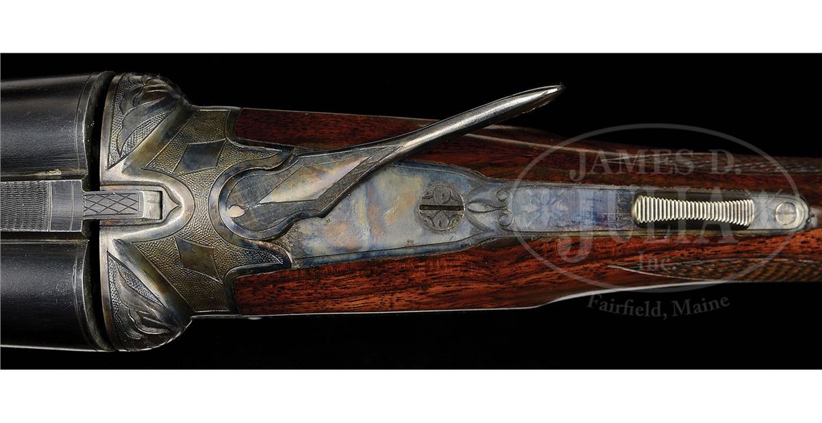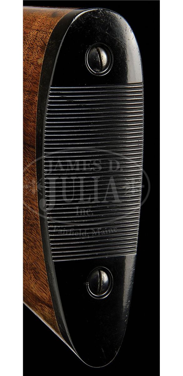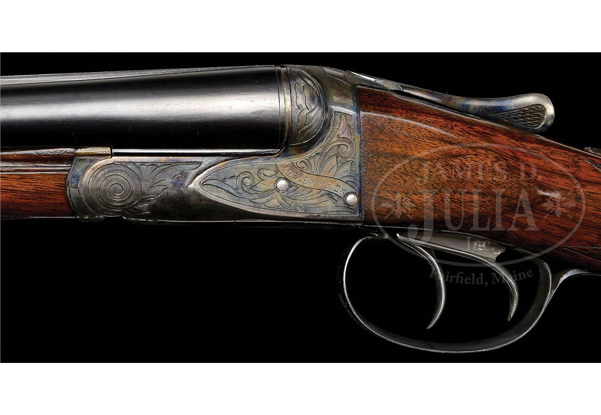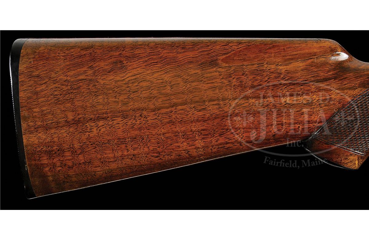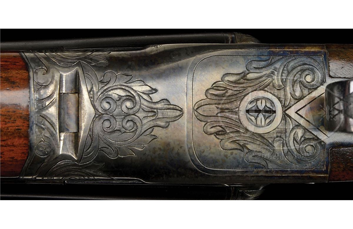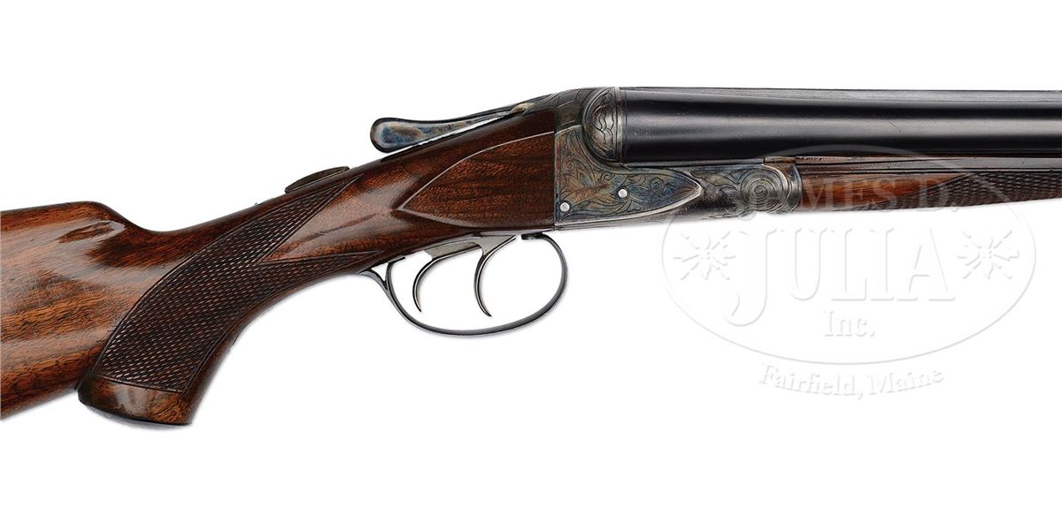 SN 202812. (1916) Cal. 20 ga. 2-1/2" Chambers. 26" Bbls with slightly raised, narrow, matted, concave rib, are marked with "Chromox Steel", and Fox Philadelphia address on tops. Bbl flats are stamped with SN, "A", and Fox proof. Typical A grade action engraved with large foliate motifs and "Ansley H. Fox" on ribands on each side, features automatic safety and double triggers. Blued trigger guard has SN at grip. Lightly fiddle figured American walnut capped pistol grip buttstock measures 13-3/4" over orig ribbed composition buttplate. Coarse point pattern checkering is at grip and on splinter forend with Deeley type release. Bore diameter: left-.616, right -.616. Bore restrictions: left -.027 (Full), right -.005 (IC). Wall thickness: left -.025, right -.027. Drop at heel: 2-7/8", drop at comb: 1-5/8". Weight: 5 lbs. 10 oz. LOP: 13-3/4". PROVENANCE: Woody Frey Collection. CONDITION: Exceptionally fine. Bbls retain nearly all of their orig blue with only a few light scratches, and minor marks. Action retains nearly all of its orig case hardening color, only slightly silvered and thinned on sharp edges and around bottom. Forend iron and latch retain nearly all of their orig color. Trigger guard is exceptional with only the slightest bit of silvering on sharp edges of bow. Stocks have only a few minor marks and light scratches in their orig varnish, which is lightly crazed overall. Bores are excellent. Action is tight. An exceptional lightweight small bore Fox. 4-48476 MGM141