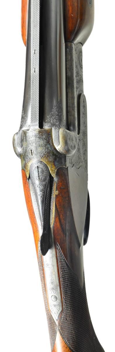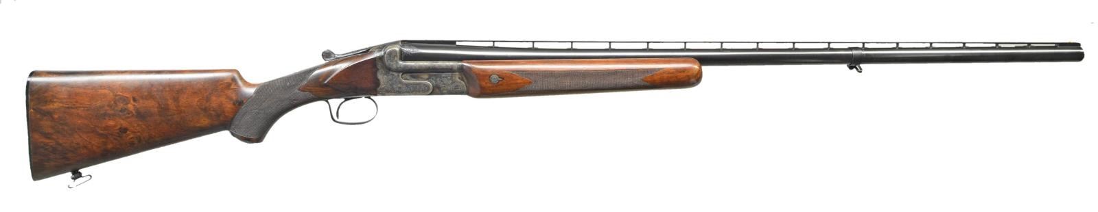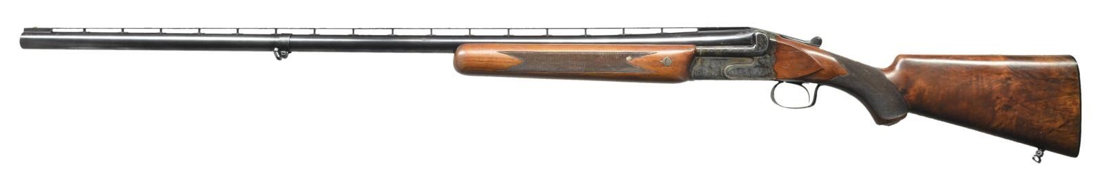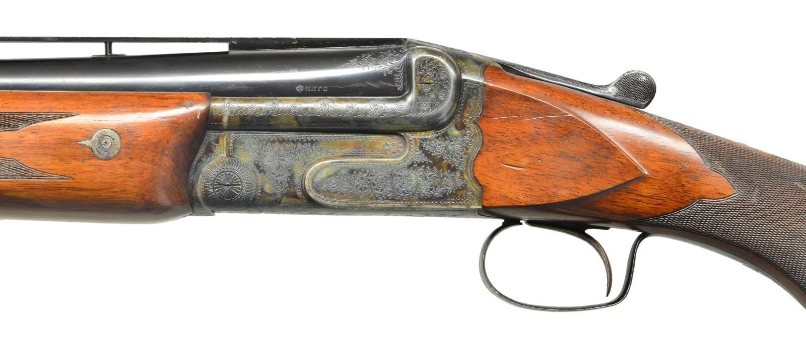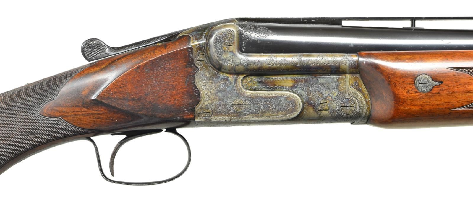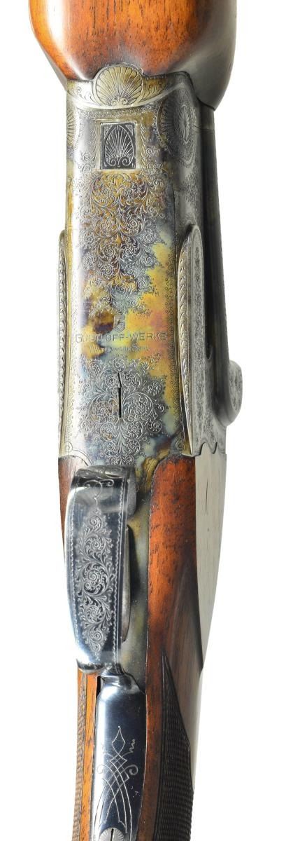 TRAP GUN GUSTLOFF WERKE (SIMSON) OF SUHL. Cal. 12 Ga., 2 3/4". S# 29016. The 34" tapered rnd. bbl. is fitted with raised ventilated rib holding 2 white beads. Milled out portion of rib is engraved "Simson & Co. Suhl Waffenfabriken". There are 1" triangles of scroll engraving at breech end. Bottom of bbl. is stamped with December 1925 Imperial German Nitro proofs. Simson mountains logo and serial number on left side of rear lump. Case hardened double Kirsten ogee backed blitz action does not have safety. Action is engraved with near full coverage well cut varying size scroll with some scroll and geometric borders. Triggerplate is marked "G" "GUSTLOFF-WERKE" "Waffenwerke Suhl". Blued trigger guard and top lever are also scroll engraved. Steel capped pistol grip buttstock of somewhat burl figured European walnut measures 14 1/4" over ribbed horn buttplate. Semi-fancy pattern, closely spaced checkering is at grip. A sling loop is on toeline. Matching beavertail ejector forend has Deeley release. MEASUREMENTS: BBL: Bore Diameter: .729". Restriction: .036" (FULL). Min. Wall Thickness: .060". STOCK: DAH: 1 1/2". DAC: 1 7/16". LOP: 14 1/4". CAST: neutral. WEIGHT: 8 lb. 6 oz. UNATTACHED ACCESSORIES: comes with black plastic case. CONDITION: exceptionally fine. Bbl. retaining over 95% original blue with some scattered speckling. Lumps and breech face of bbl. still retain original damascening. Action retains about 90% original case hardening color, silvered on beads and edges of fences. Stocks retain nearly all of their original hand rubbed oil finish with some scatterd marks, mostly on left side of butt. Checkering shows some compressions and has slightly darkened. Bore is considerably pitted and has been polished. Action is tight. Ejector works intermittently. A very high quality gun which has had no alteration of stock, which is unusual for a trap gun. (22-4984/MGM). CURIO. $1,500-2,200.