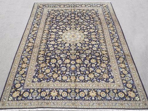 HIGH QUALITY PIECE OF ART PERSIAN KASHAN RUG 9.0 X 13.1 feet. MADE OF FINE QUALITY LAMB'S WOOL PILE ON COTTON FOUNDATION, ALL NATURAL VEGETABLE DYE, THE BEAUTIFUL RUG INCORPORATES A DETAILED FLORAL DESIGN ON A NAVY BACKGROUND AND A CENTRAL MEDALLION BY AN INTRICATELY DONE FLORAL MULTILAYERED BORDER.