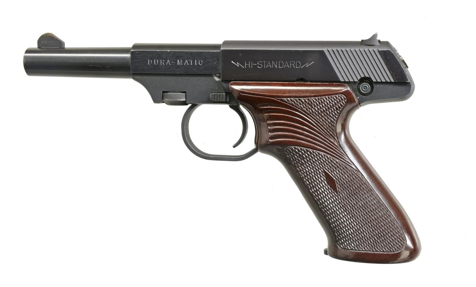 Cal. 22 LR. S# 502132. Bbl. 4 1/2" w/ serrated ramp front sight & fixed square notch rear sight. Blue finish w/ 1 piece checkered plastic grips. MAGS: 1 detachable 10 rd. CONDITION: over 95% blue. Grips show light handling marks. Bright bore w/ strong rifling. (20-3245/DS). CURIO. $300-450.