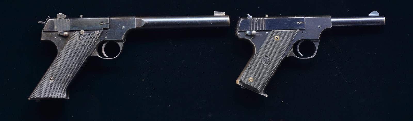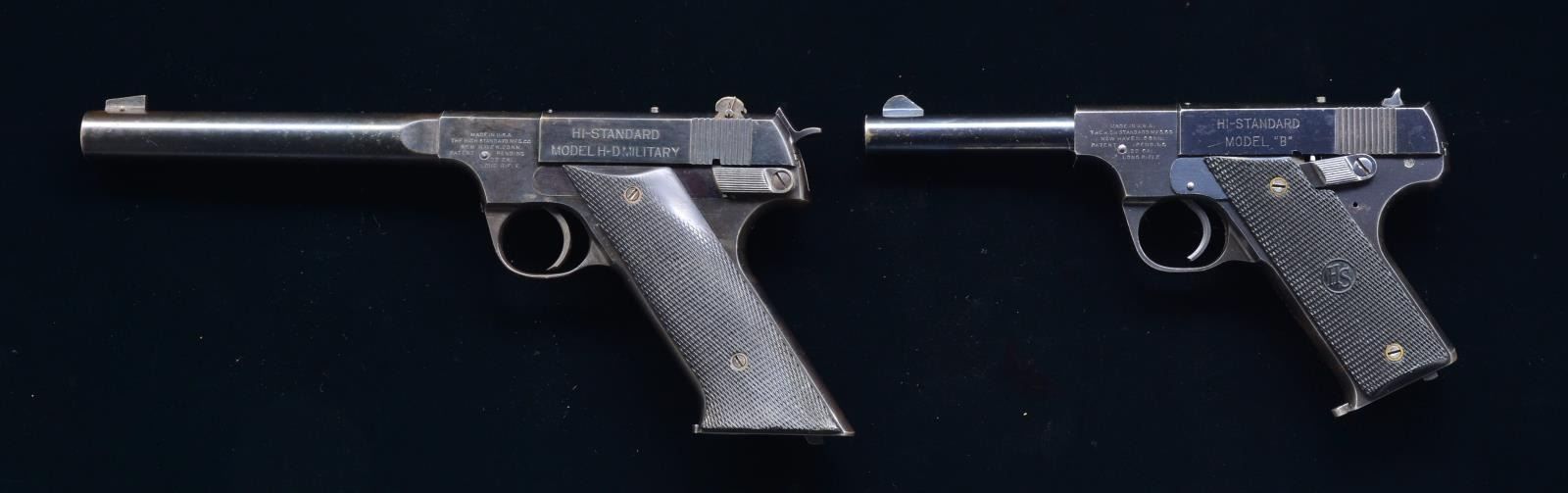 ALL: cal. 22 LR. 1) MODEL HD MILITARY. S# 163802. Bbl. 6 7/8" heavy w/ serrated Patridge front sight & square notch adj. rear sight. Blue finish. 2 Piece checkered black plastic grips. MAGS: 1 detachable 10 rd. CONDITION: 90% dull blue showing some cold blue touch up over scattered spots of pitting. Grips show light wear, right panel has sm. scrapes & marks, left panel has checkering filed off at the top edge along the back strap. Bright bore w/ strong rifling. (20-3703/DS). 2) MODEL "B". S# 85355. Bbl. 4 1/2" w/ serrated ramp front sight w/ fixed square notch rear sight. Blue finish. 2 Piece checkered black plastic grips. MAGS: 1 detachable 10 rd. CONDITION: over 80% blue showing edge & grip strap wear. Grips show some flattened diamonds. Bright bore w/ strong rifling. (20-3728/DS). ALL CURIO. $700-1,000.