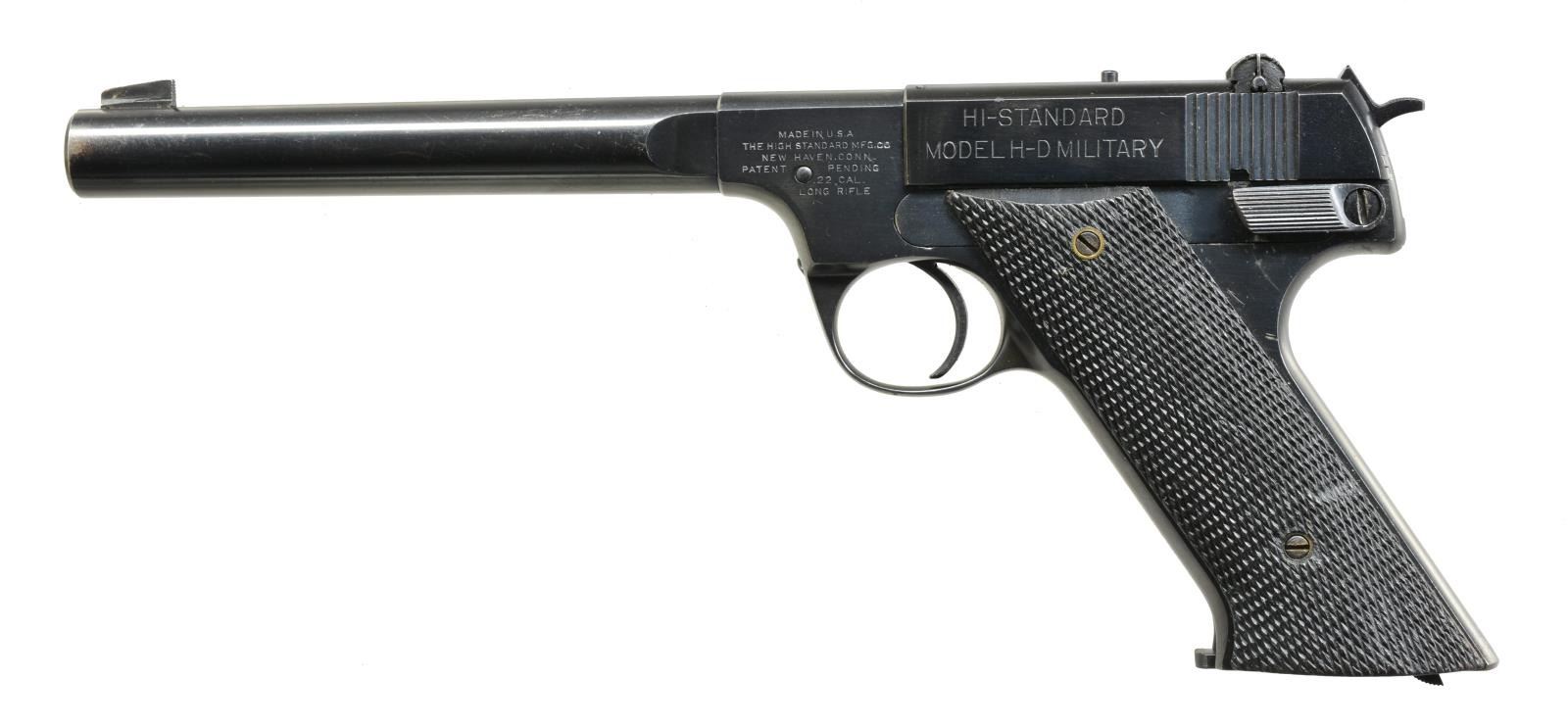 Cal. 22 LR. S# 193142. Bbl. 6 3/4" heavy w/ blade front sight & square notch adj. rear sight. 2 Piece checkered walnut grips w/ added black finish. MAGS: 1 detachable 10 rd. CONDITION: over 95% blue showing sm. dents w/ slight edge & muzzle wear. Grips show checkering wear. Bright bore w/ strong rifling. (20-3311/DS). CURIO. $400-600.