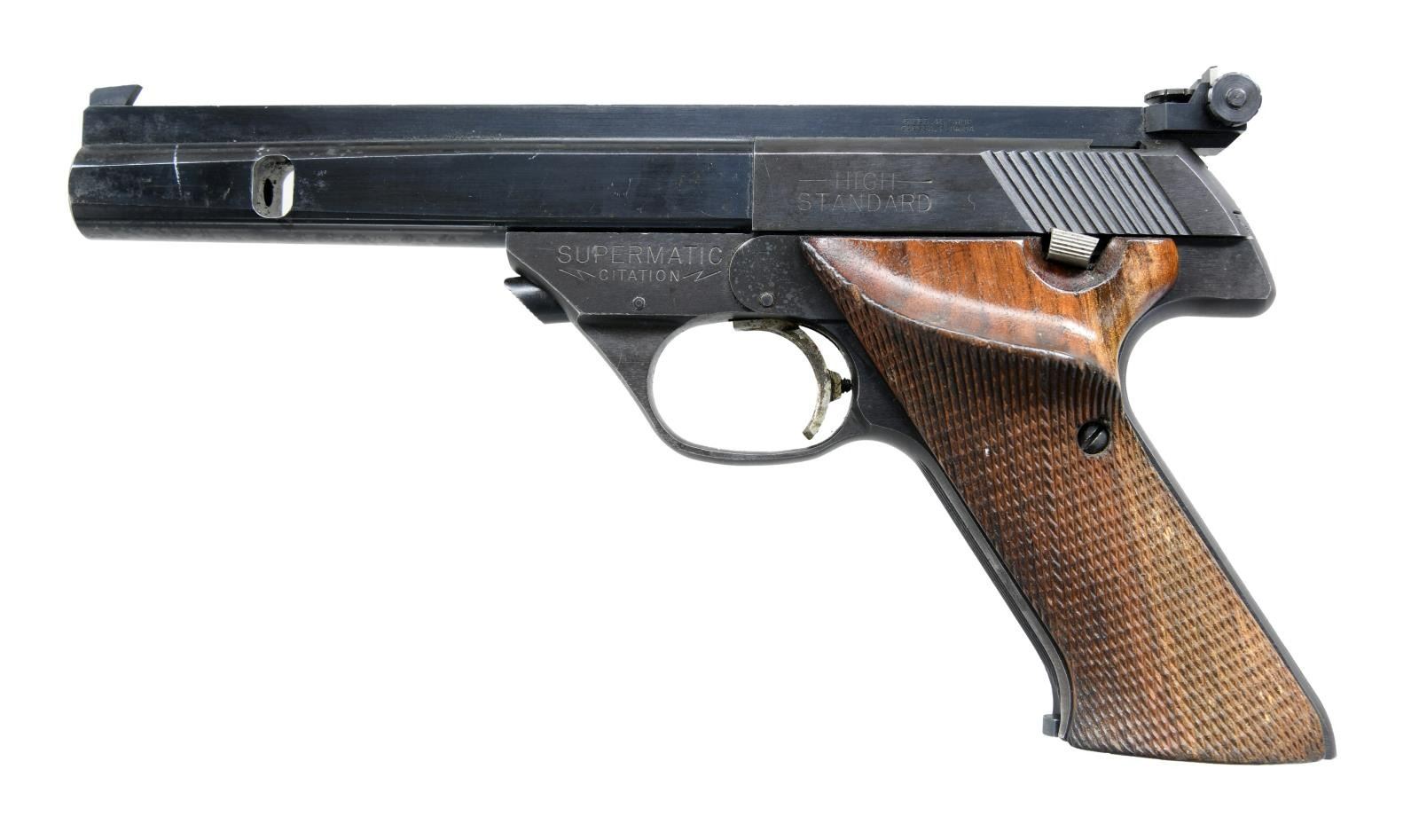 CITATION SEMI AUTO PISTOL. Cal. 22 LR. S# 2459543. Giles 5 1/2" ported bull bbl.. Patridge front sight. Adjustable rear sight. Sight rib marked "GILES.45 SHOP" denoting this pistol was worked over by the famous gunsmith John Giles of Odessa, Florida. Gold trigger & slide release. Checkered walnut grips w/ thumbrest on right panel. MAGS: 4-10 rd. UNATTACHED ACCESSORIES: factory bbl. w/ a very good bore & provisions for weights on bottom. Bbl. is in very good overall condition. CONDITION: grips show some dings & handling wear. Gold parts show fading & scattered oxidation. Balance of metal retains 60% blue w/ fading to gray on straps, overall fading to brown & scattered oxidation. Very good bore. PROVENANCE: From the personal collection of Brad Shepherd. (23-2112/MJC). MODERN. $400-800.