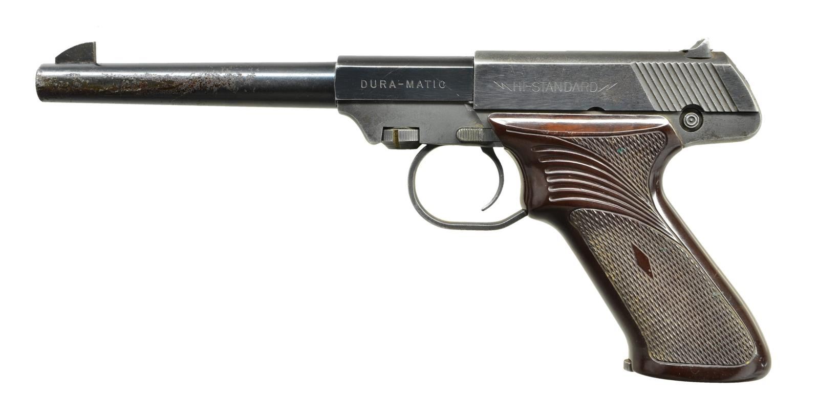 Cal. 22LR. S# 1113140 Bbl.6.5" Manufactured 1960-1961. Single action rimfire pistol. Blued finish. Blade front sight w/ fixed rear notch. Push button safety. Brown plastic wrap around grips. MAGS: 1 steel 8rd. CONDITION: While blued finish still covers the majority of exposed parts, a generous patina has encroached the exterior of the barrel. While the grips lightly illustrate use, actual wear seems gentle. Magazine has an ample patina coating. Bore remains rather bright with descent rifling. Fire control mechanism appears to function correctly when cycled by hand. (22-3166/JZ). CURIO. $200-300