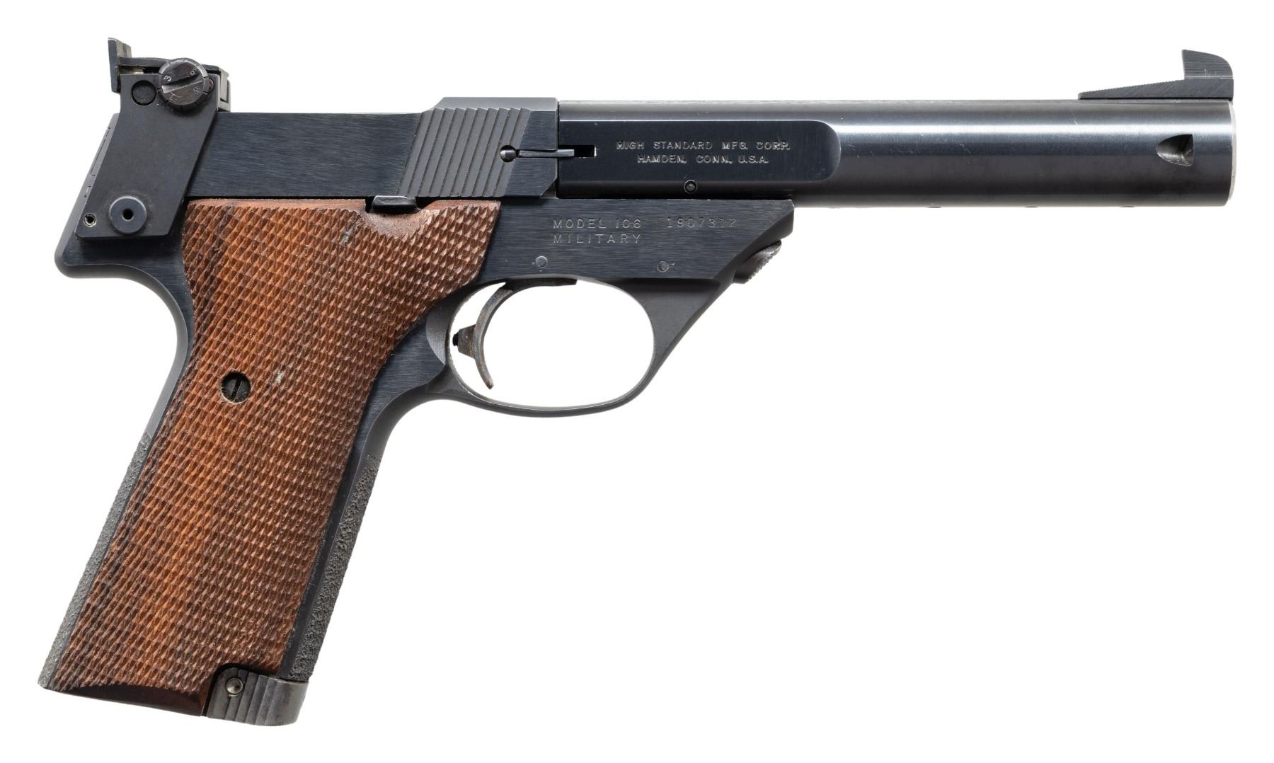 CITATION SEMI-AUTOMATIC PISTOL. Cal. 22 LR. S# 1907312. Bbl. 5 1/2". Model 106 Military Supermatic Citation semi-automatic pistol mfg. by High Standard. Left side of the bbl. is marked with the cal. designation, with High Standard's mfg. information marked on the right, and "EL" stamped on the underside, forward of the frame. Left side of the frame is marked "SUPERMATIC/ CITATION", with the model designation and S# marked on the right. Left side of slide is marked "-HIGH-/ STANDARD", with the S# marked on the top. Metal components exhibit a dual tone blue finish overall, save for on the trigger and mag. release, which are case colored. Frame is mounted with 2-piece checkered wood thumbrest grips. Frame features heavily textured panels on the front and rear grip straps. Bbl. features a grooved matte rib and 3 holes with plug screws on the underside for weight attachment. Ramped blade front sight with adj. square notch rear sight. Slide matches the frame via the full S#. MAGS: 1 10-rd. with "HIGH STANDARD" marked red synthetic extension on floorplate. CONDITION: near excellent, with metal components retaining the vast majority of their original factory blue finish, exhibiting some superficial handling marks and a few small spots of light surface oxidation. Sideplate on left side of frame exhibits some light pitting that has been cleaned at one time, showing through to gray patina. Trigger and mag. release retain the majority of their original case colored finish, with the right half of the mag. release having faded to a mostly gray patina. Mirror bore, retaining well defined rifling throughout. Proper manual mechanics. Grips show a few small marks from handling and storage, but are otherwise very good overall. (25-5058/MLW). CURIO. $300-500.