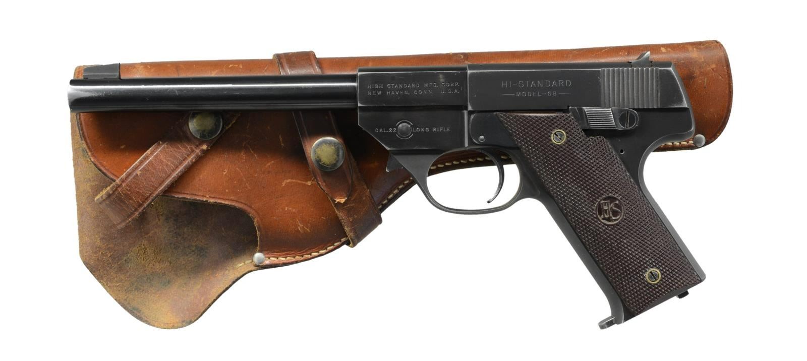 Cal. .22 LR. S# 313155. Bbl 6-5/8". Blued finish with 2-piece checkered "HS" medallion grips. Square notch rear sight with serrated blade front sight. Matching numbers on frame, slide, and barrel. MAGS: 1 10-round magazine. UNATTACHED ACCESSORIES: Red Head brown leather holster. CONDITION: Good, with metal components retaining the majority of their original factory blue finish, exhibiting moderate edge wear as well as wear on either side of the muzzle that shows through to silvering. Bright bore, exhibiting strong rifling throughout. Grips exhibit mild smoothing and some scattered nicks to the diamonds, but are otherwise very good. Holster shows scattered handling marks and some age related cracking. (23-932/MLW). CURIO. $300-450