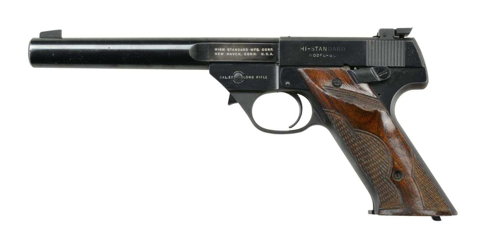 Cal. 22 LR. S# 322521. Bbl 6 3/4" bull. Blade front sight. Adj. rear sight. New Haven mfg. Markings have white highlight. Checkered grips w/ thumb rest for right handed use. MAGS: 1-10 rd. CONDITION: left grip panel shows a small chip missing below thumbrest, grips otherwise show some added varnish, dings & handling marks. Metal retains 70% blue w/ a cleaned to gray area on both sides of bbl. at rear, both straps worn to gray w/ oxidation staining & some high edge wear. Near excellent bore. (22-4397/MJC). CURIO. $400-600.