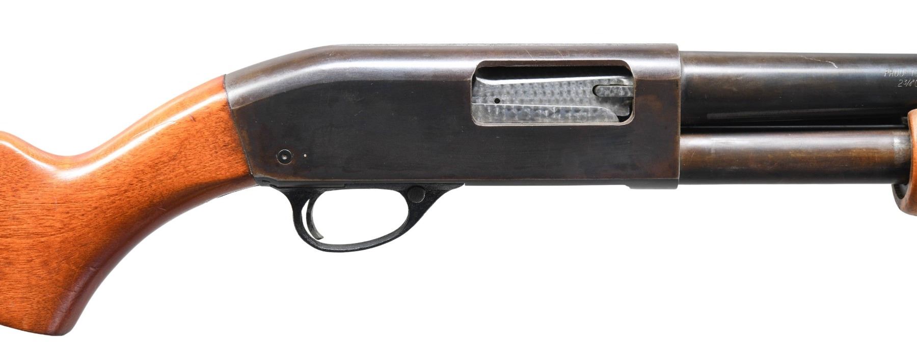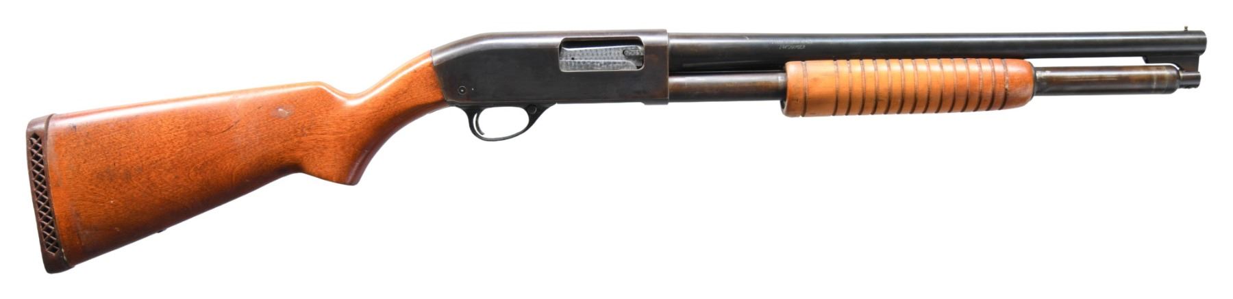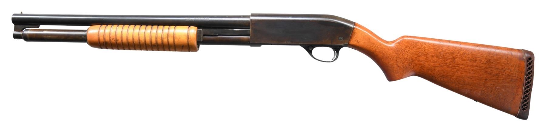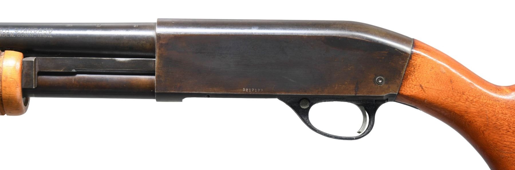 Cal. 12 GA, 2 3/4". S# 3217177. Bbl. 18 1/8". Riot pump action shotgun mfg. by High Standard. Left side of the bbl. is marked with High Standard's mfg. information, with the cal. designation marked on the right. Left side of receiver is marked with the S#. Metal components exhibit a blue finish overall, save for on the bolt assembly and carrier, which have been jeweled in-the-white. Alloy trigger housing exhibits a black "wrinkle" finish. Grooved wood pump and plain wood pistol grip buttstock with oversized red rubber recoil pad. Toeline of stock has been fitted with a screw in the sling loop provision. Brass blade front sight. CONDITION: metal components retain fair amounts of their original blue finish, exhibiting wear overall that is fading to gray and brown patinas. Bright bore, exhibiting streaks of hardened firing residue throughout. Proper manual mechanics. Wood furniture shows scattered marks and impressions from handling and storage, but otherwise remains sound. (25-4838/MLW). MODERN. $200-300.