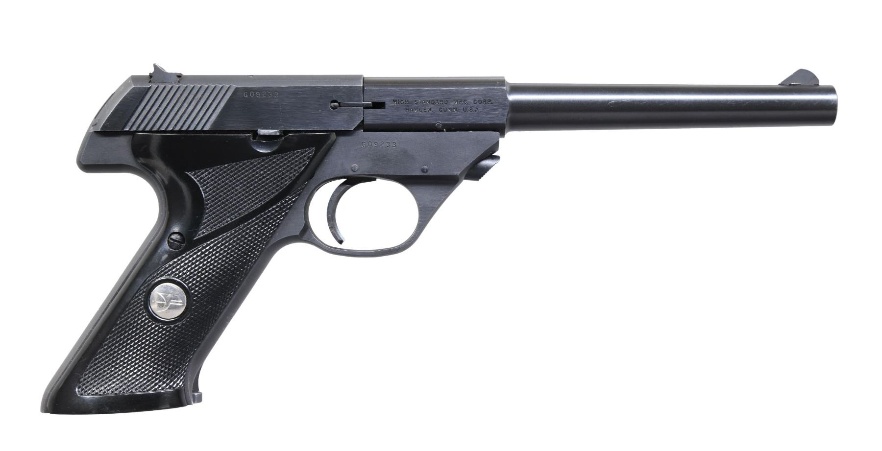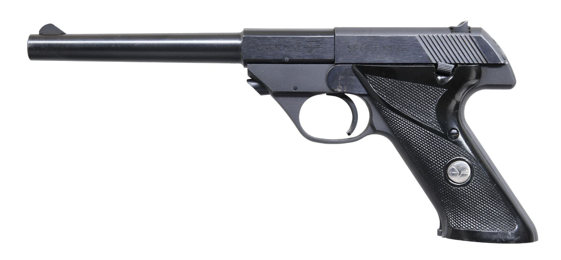 Cal. 22 LR. S# G09233. Bbl. 6 3/4". Serrated blade front sight. Square notch rear sight. Hamden, CT made Sport King pistol. Blued finish. Checkered grips with High Standard medallions. MAGS: 1-10 rd. UNATTACHED ACCESSORIES: matching numbered factory box in fair condition with a drawing on the top of an AR style rifle. Also included are box inserts & manual. CONDITION: grips show light handling marks. Metal retains 92% original blue with a few spots of oxidation, scattered handling marks & edge wear. Action functions properly when hand cycled. Bright near excellent bore. (25-578/MJC). CURIO. $400-600.