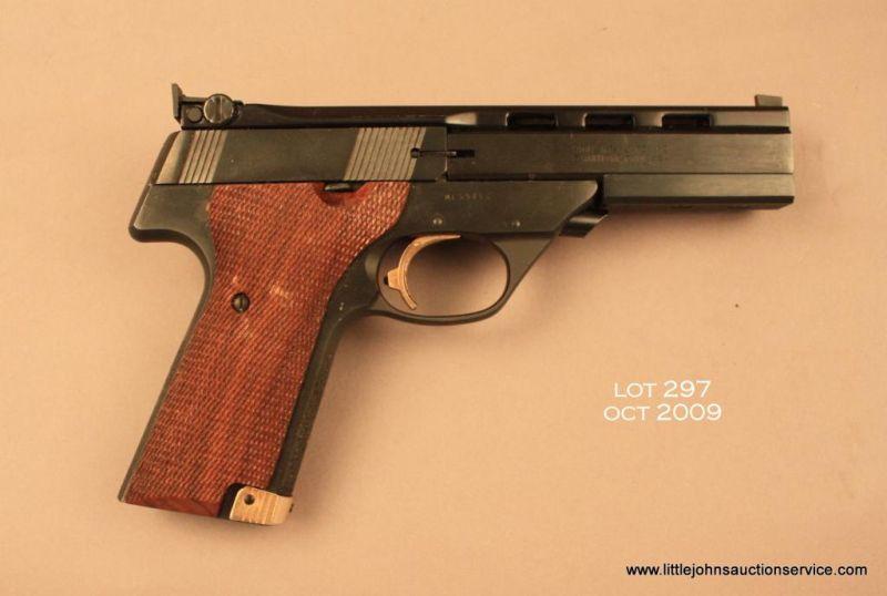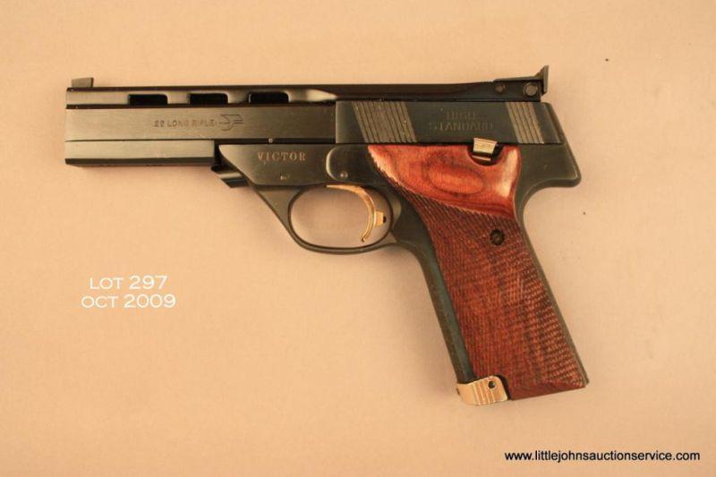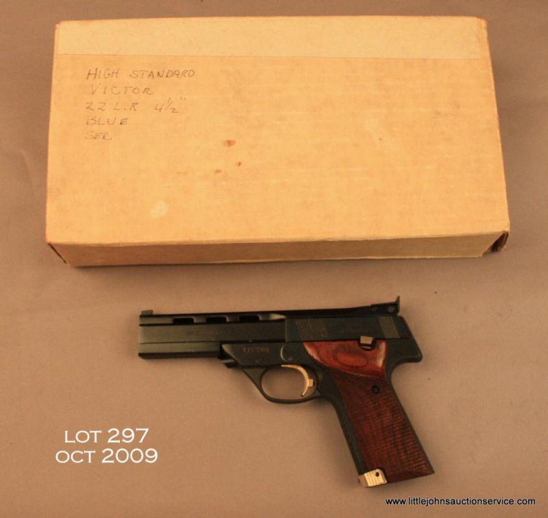HIGH STANDARD Victor, #ML55456, .22 cal., 4 ½” vent rib barrel, blued finish with gold colored trigger, safety, and magazine release, stippled front and back strap, checkered walnut grips. The pistol is in excellent condition, bore isrough but should clean. Includes a High Standard .22 Short conversion kit box. One mag. Est. $600-$1200.