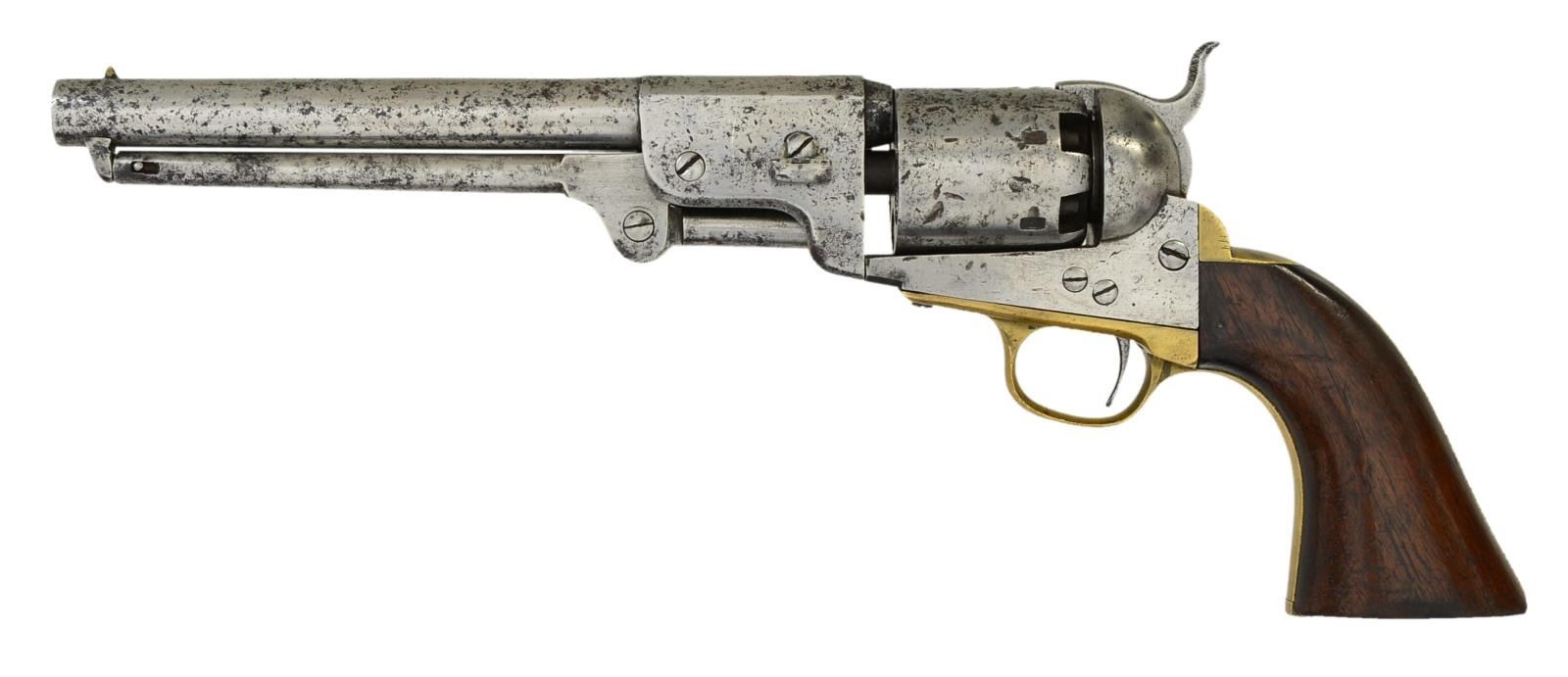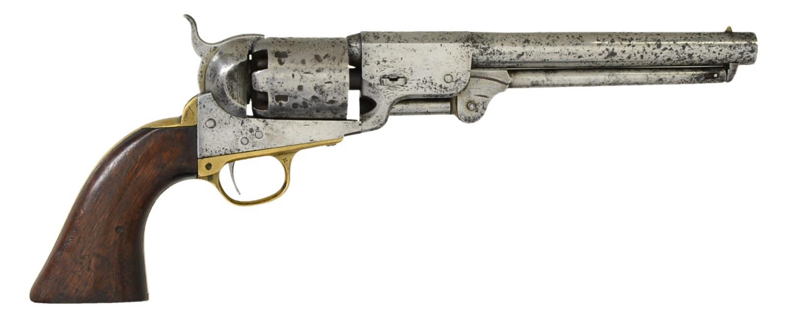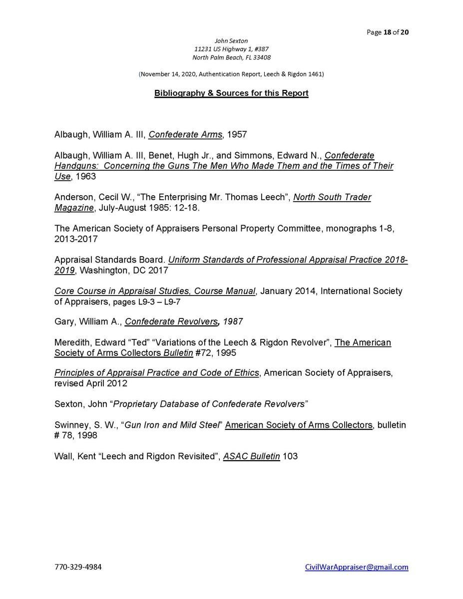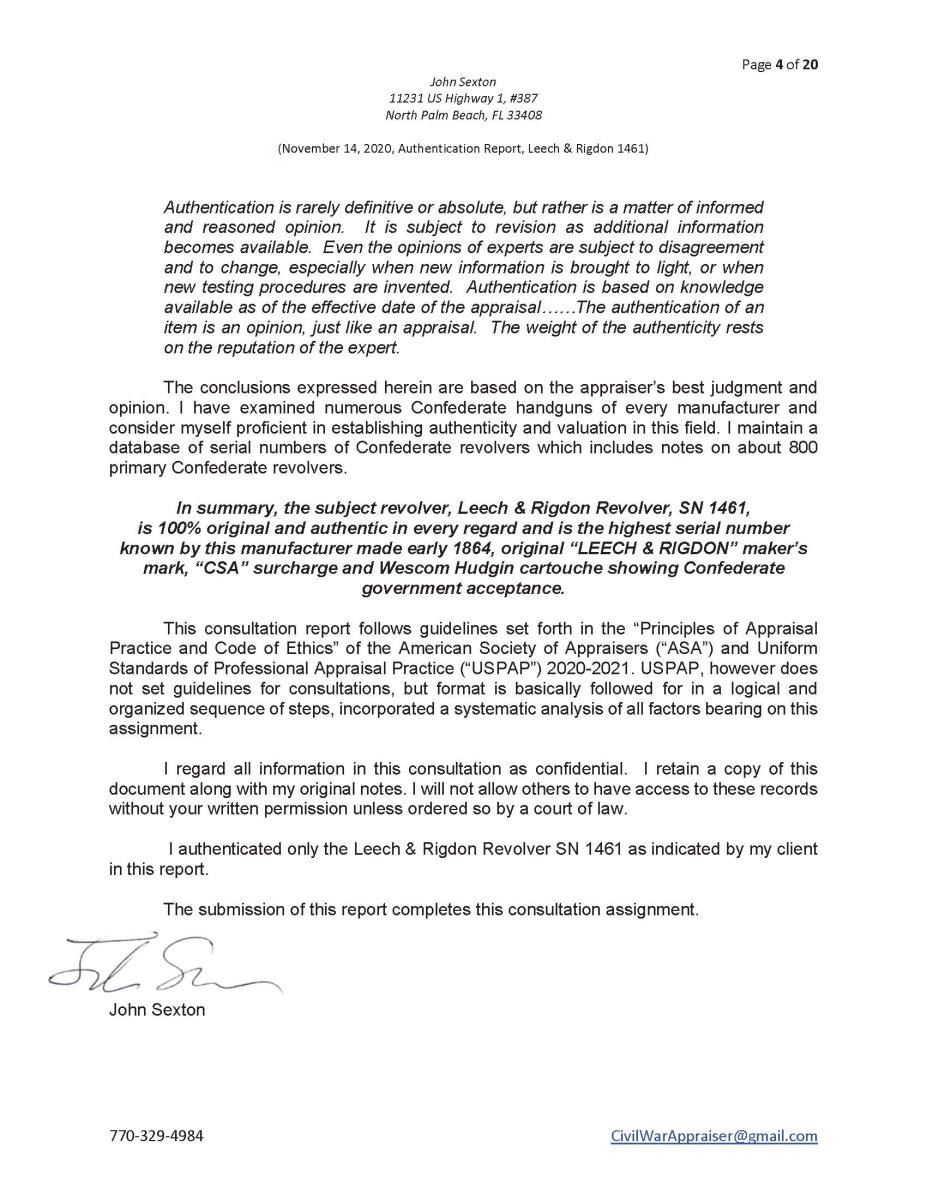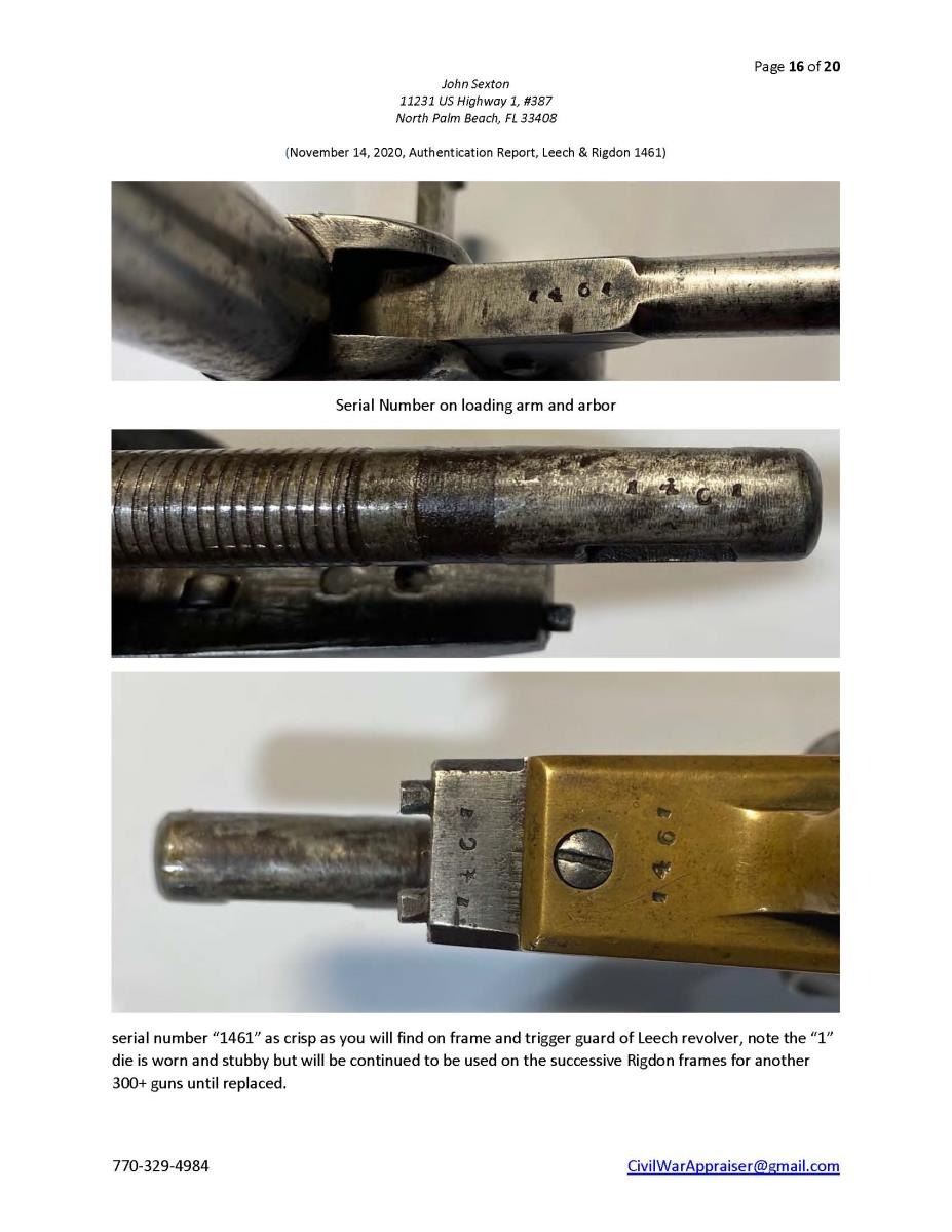 LEECH & RIGDON REVOLVER 1461. Cal. 36. S# 1461. Bbl. 7.5". This is the highest serial number known of Leech & Rigdon revolver. This revolver was assembled in Augusta, Georgia from parts mostly completed at Greensboro, Georgia and fulfilled Confederate contract. Thomas Leech was no longer part of the firm which was now managed by Charles Rigdon. Revolver is in standard configuration with 7.5" half octagonal to round barrel with brass pin front sight “LEECH & RIGDON CSA” on top flat. Pistol has the rarely seen “WH” in diamond cartouche of Confederate inspector Wescom Hudgins. This revolver was manufactured in the spring of 1864. UNATTACHED ACCESSORIES: authentication report. CONDITION: good to very good overall, metal cleaned with scattered staining and pitting, small dents in cylinder, overall a mottled bright gray patina, brass has a mixed light to medium mustard patina. All original and complete including screws. Matching serial numbers are found on barrel, frame, cylinder, triggerguard, backstrap, loading arm, wedge, loading lever catch, and penciled in backstrap. Mechanically fine with crisp rifled bore. PROVENANCE: Ex-Turner Kirkland collection, Union City, TN, 1960s; Ex-David Critchlow, Sr (1930-2018) collection, Union City, TN (publisher of Union City Messenger); David Critchlow, Jr, 2018. (01-18914/JS). ANTIQUE. $20,000-30,000.