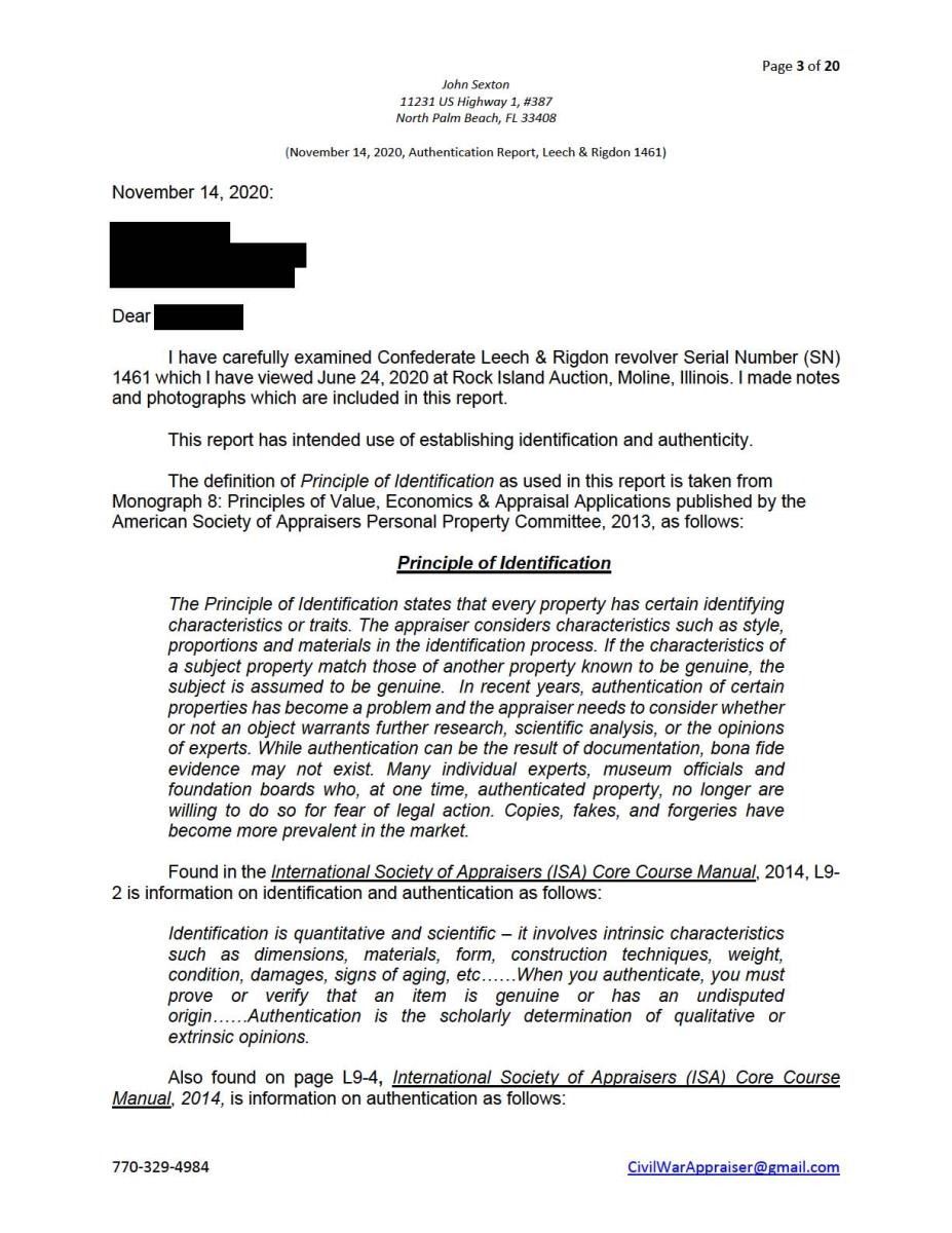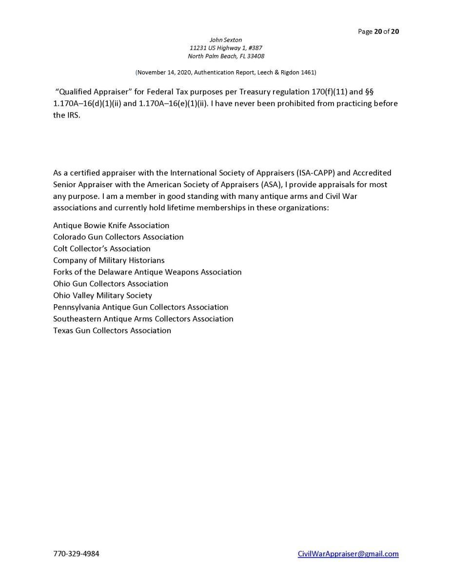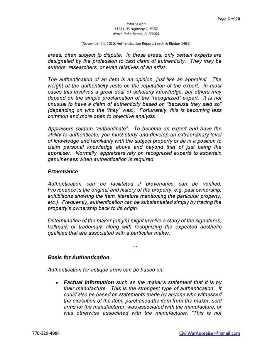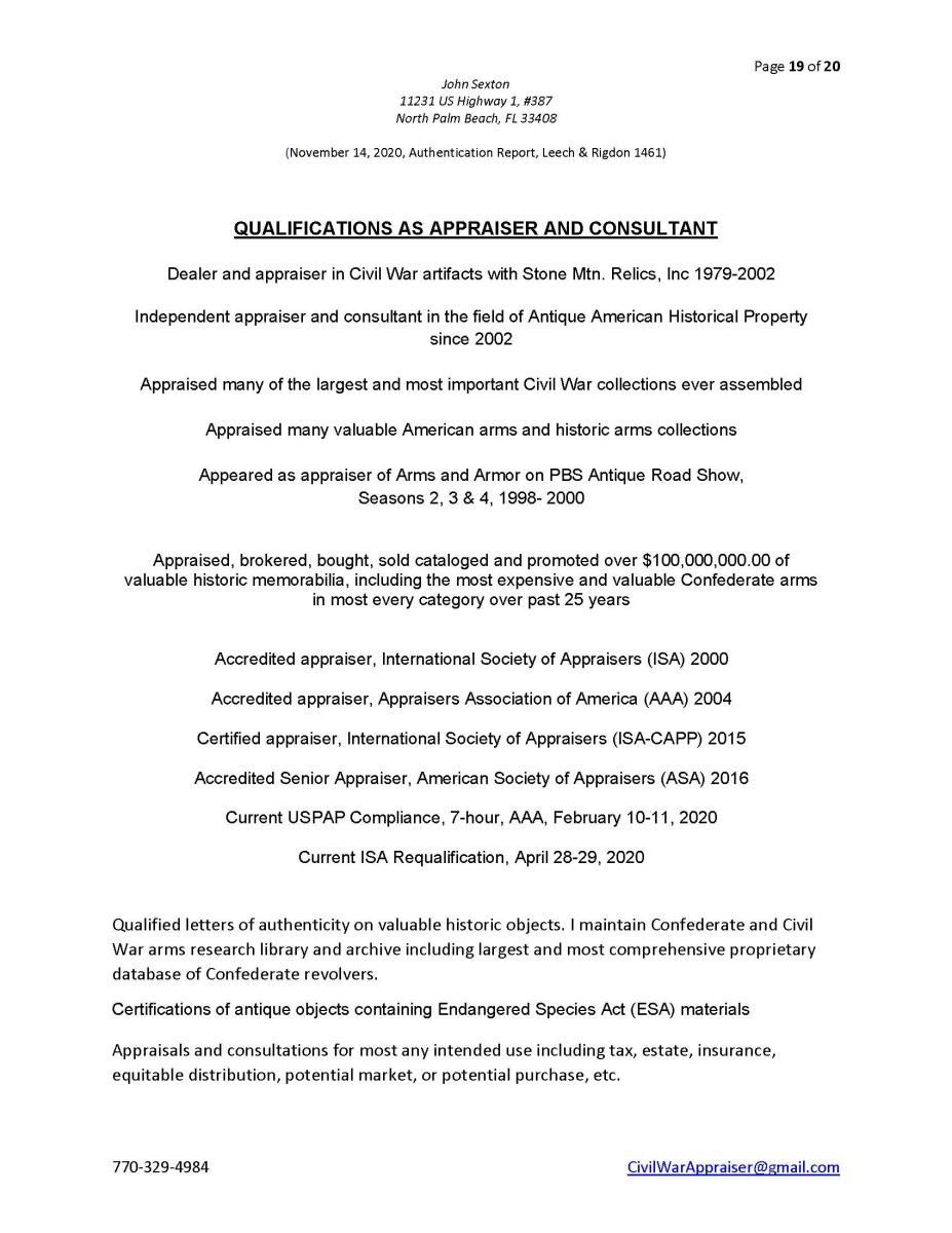LEECH & RIGDON REVOLVER 1461. Cal. 36. S# 1461. Bbl. 7.5". This is the highest serial number known of Leech & Rigdon revolver. This revolver was assembled in Augusta, Georgia from parts mostly completed at Greensboro, Georgia and fulfilled Confederate contract. Thomas Leech was no longer part of the firm which was now managed by Charles Rigdon. Revolver is in standard configuration with 7.5" half octagonal to round barrel with brass pin front sight “LEECH & RIGDON CSA” on top flat. Pistol has the rarely seen “WH” in diamond cartouche of Confederate inspector Wescom Hudgins. This revolver was manufactured in the spring of 1864. UNATTACHED ACCESSORIES: authentication report. CONDITION: good to very good overall, metal cleaned with scattered staining and pitting, small dents in cylinder, overall a mottled bright gray patina, brass has a mixed light to medium mustard patina. All original and complete including screws. Matching serial numbers are found on barrel, frame, cylinder, triggerguard, backstrap, loading arm, wedge, loading lever catch, and penciled in backstrap. Mechanically fine with crisp rifled bore. PROVENANCE: Ex-Turner Kirkland collection, Union City, TN, 1960s; Ex-David Critchlow, Sr (1930-2018) collection, Union City, TN (publisher of Union City Messenger); David Critchlow, Jr, 2018. (01-18914/JS). ANTIQUE. $20,000-30,000.