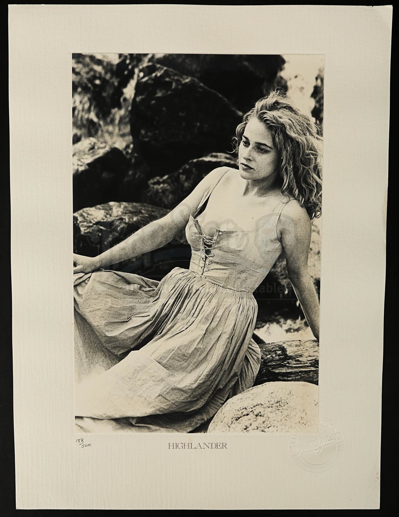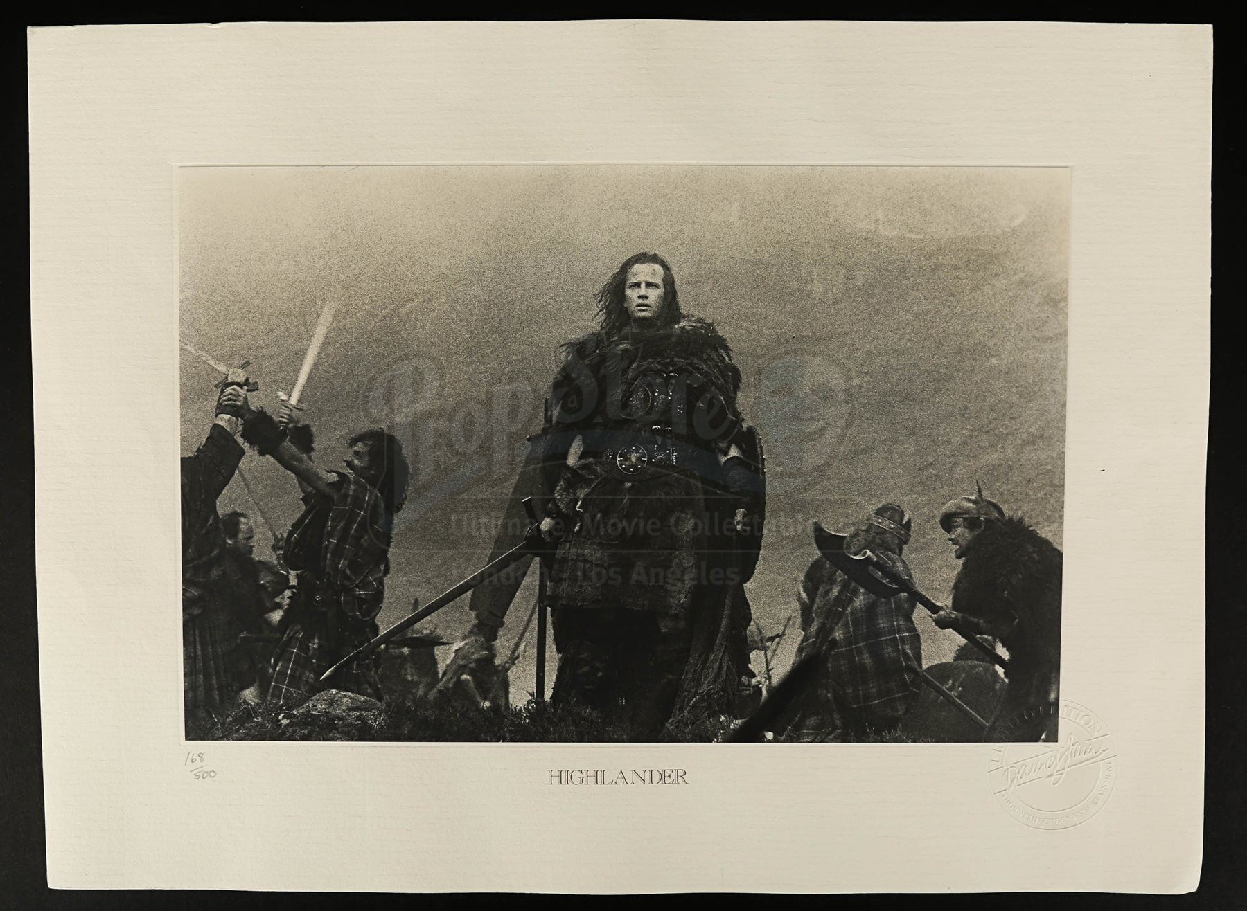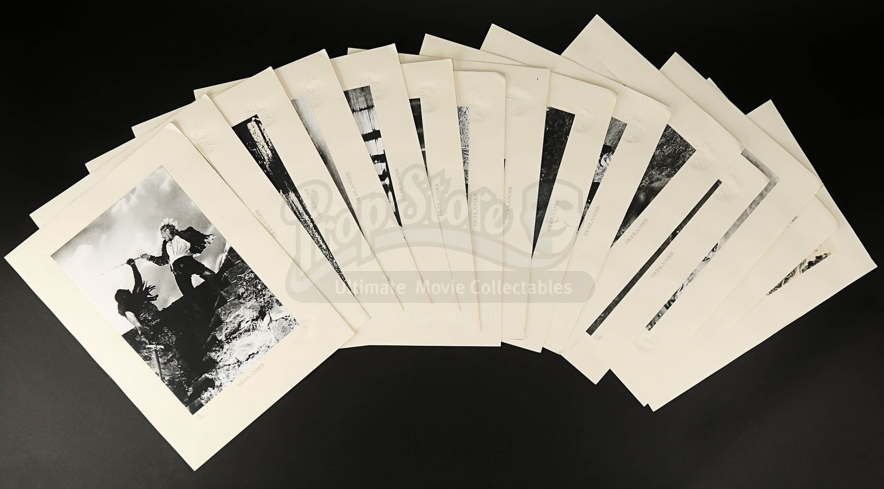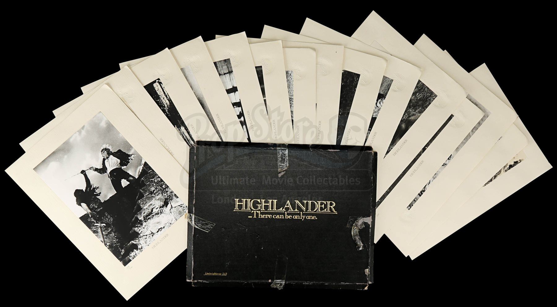 Each hand-numbered A4 photograph is printed on beige card adhered to an A3 textured card sheet. These beautiful black-and-white portraits and action scenes feature Connor MacLeod (Christopher Lambert), the Kurgan (Clancy Brown), Ramirez (Sean Connery) and Heather (Beatie Edney). They are presented in their original black card box featuring the text “Highlander – There can be only one” in faux-gold print.