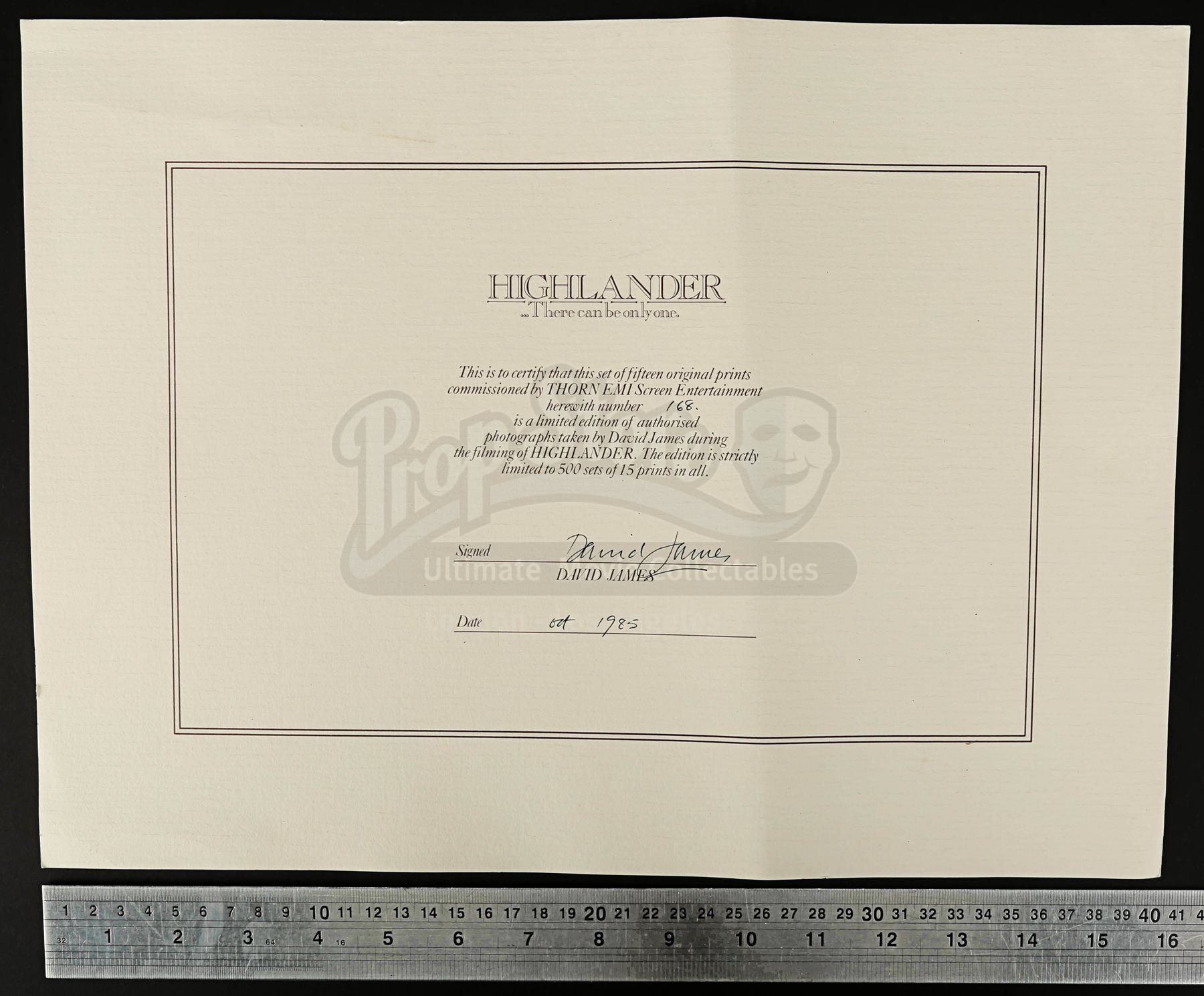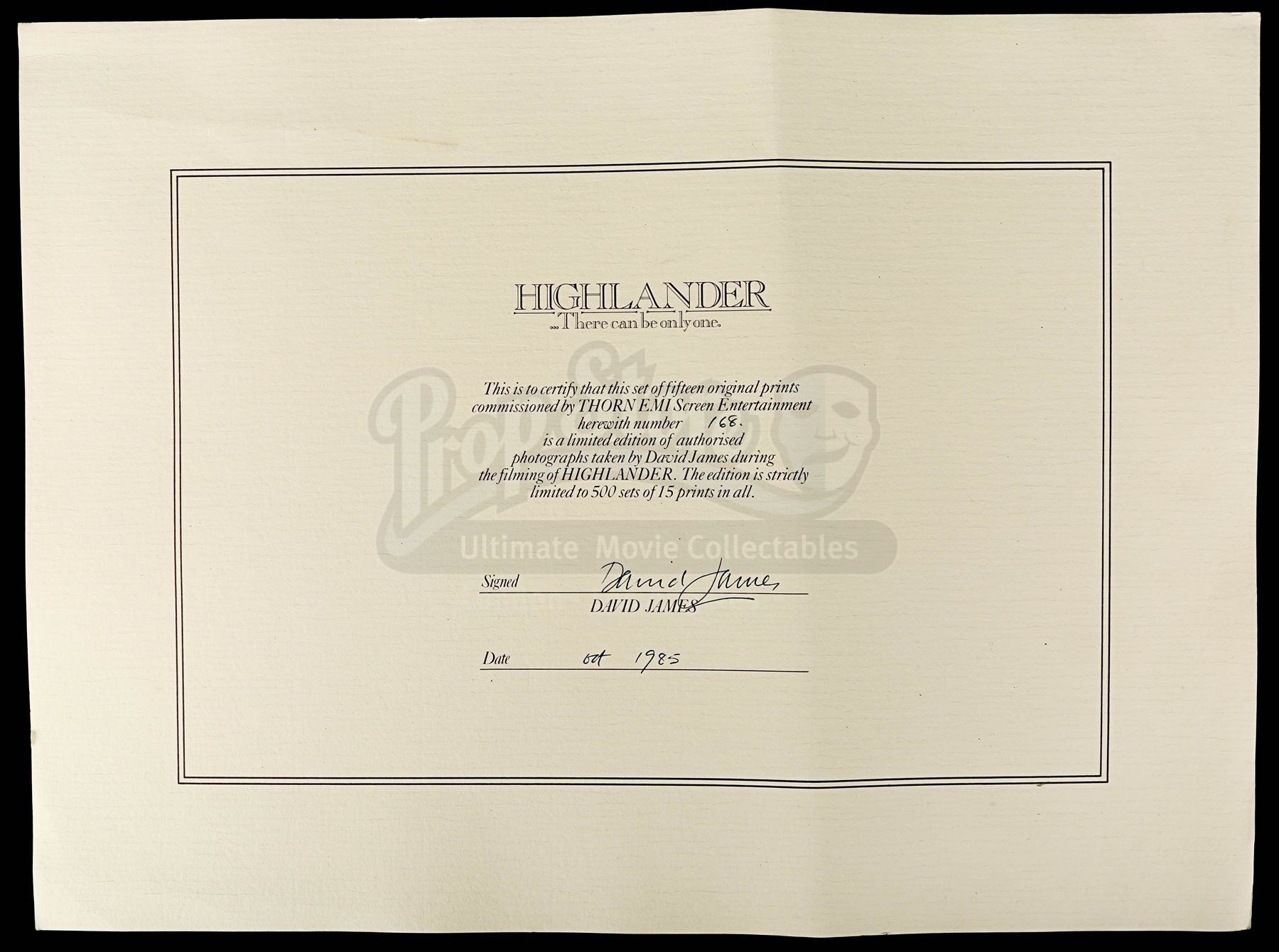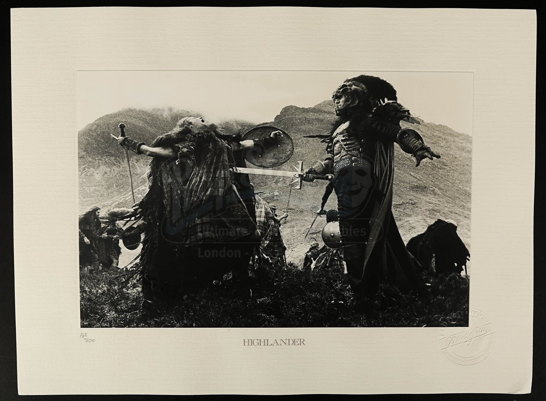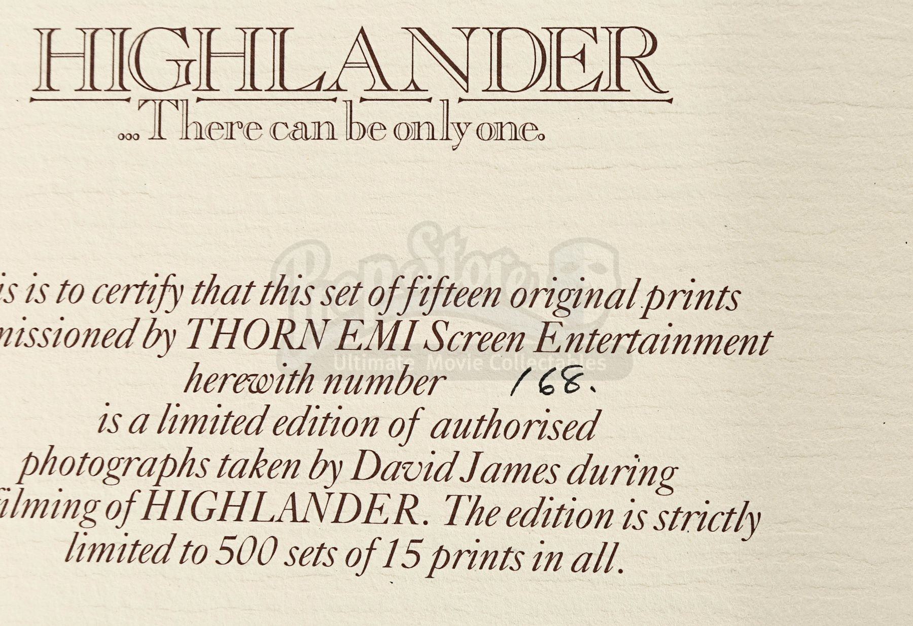 A set of 15 limited edition prints from Russell Mulcahy’s 1986 fantasy adventure Highlander. Taken by David James, the photographs comprise number 168 of 500 sets.
