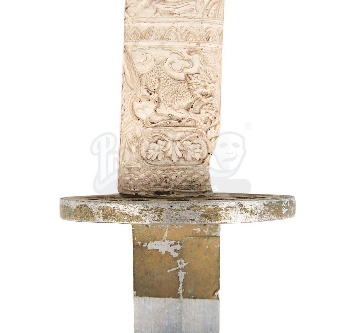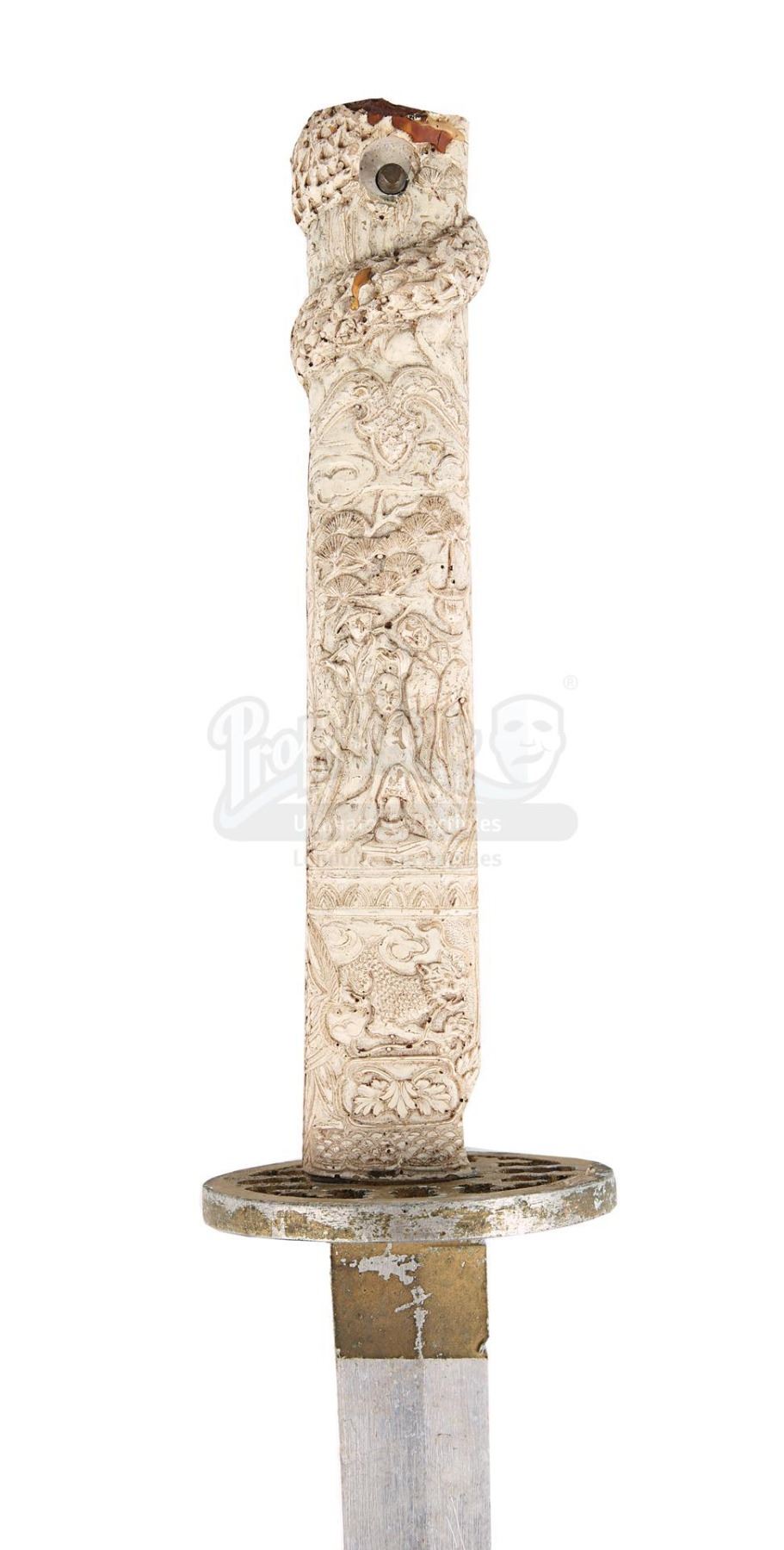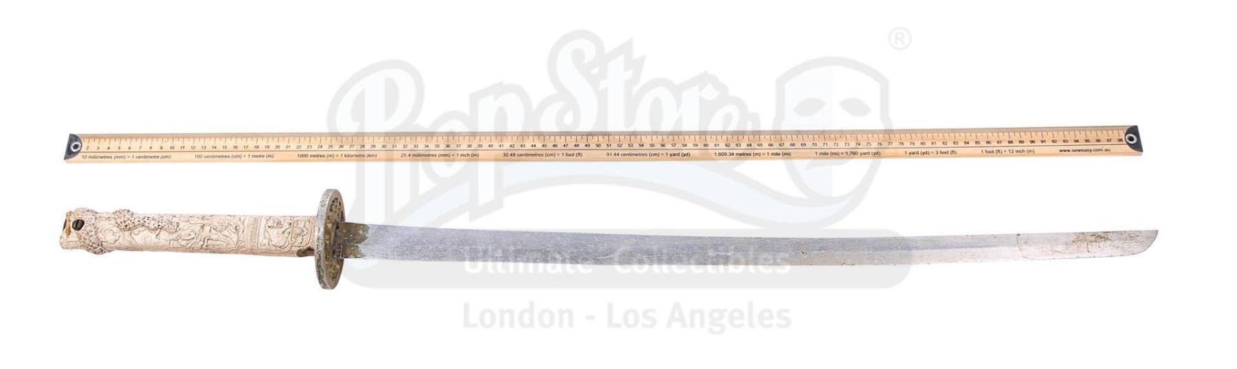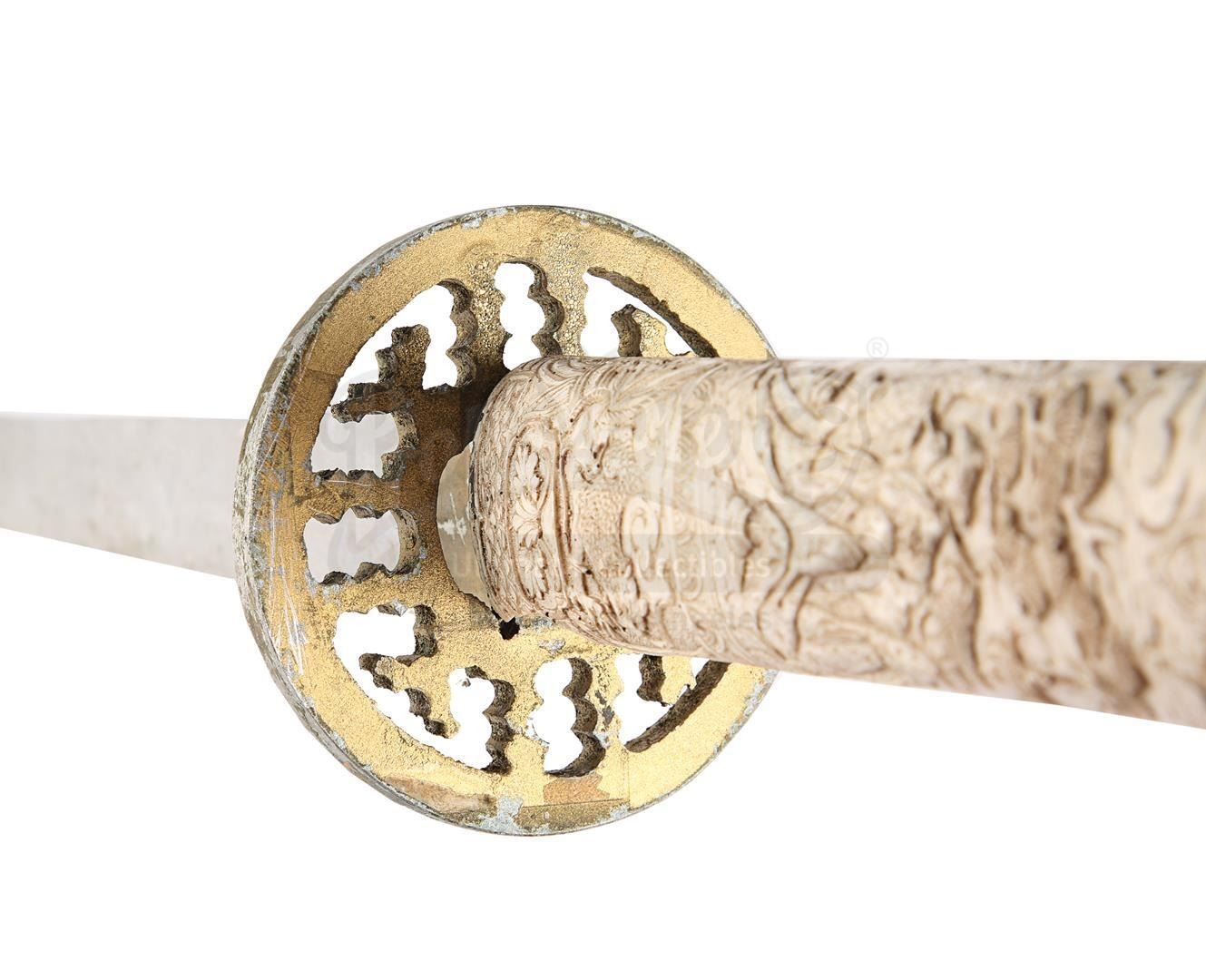 The sword comprises an aluminium blade, a gold-coloured machined aluminium tsuba and a cast resin grip finished in cream to replicate worked ivory. Ornate Japanese-inspired patterns decorate the grip. The weapon displays scuffing and corrosion on the blade, notable paint wear on the tsuba, and additional signs of damage on the grip. Dimensions: 96.5 cm x 9 cm x 9 cm (38" x 3 1/2" x 3 1/2")