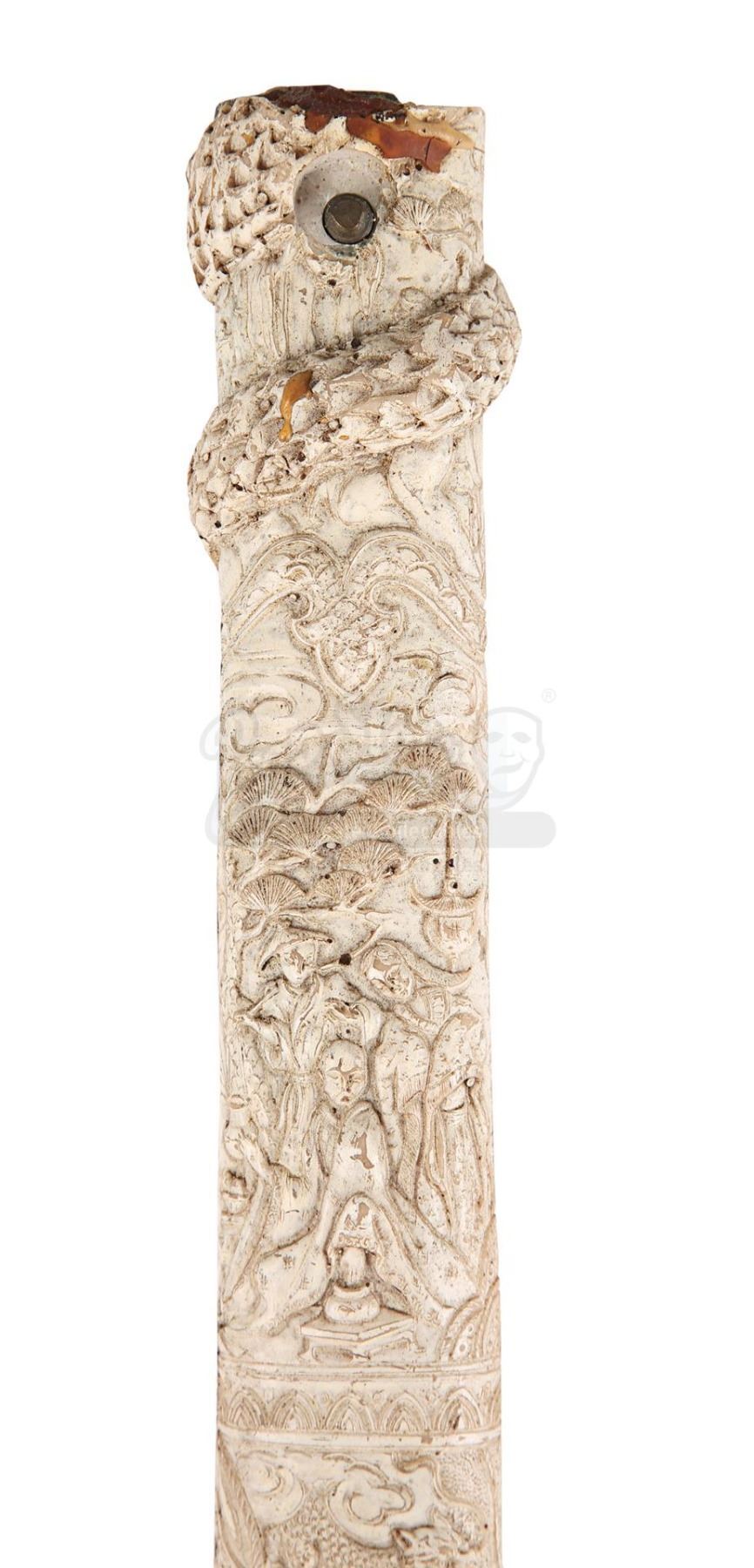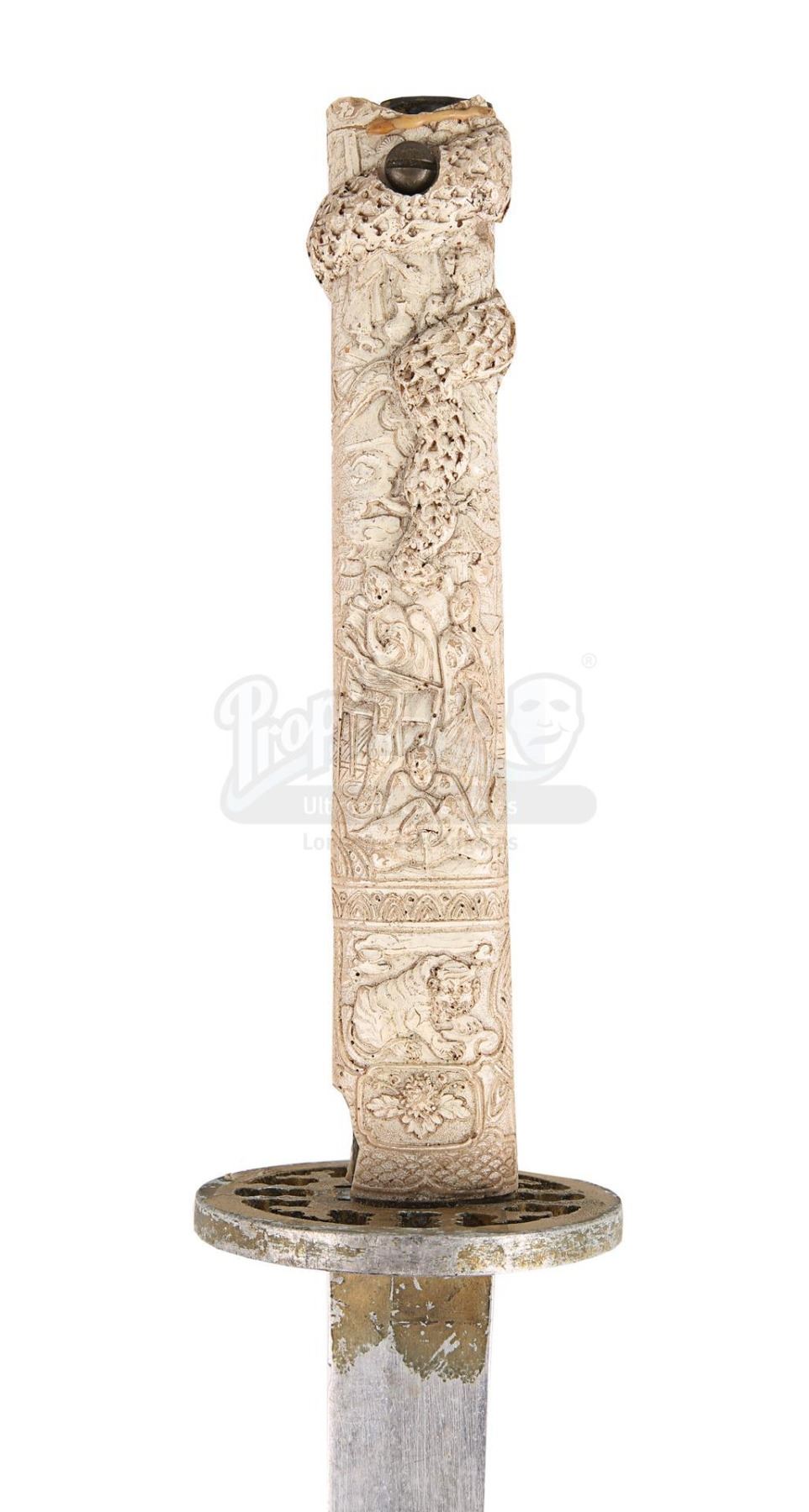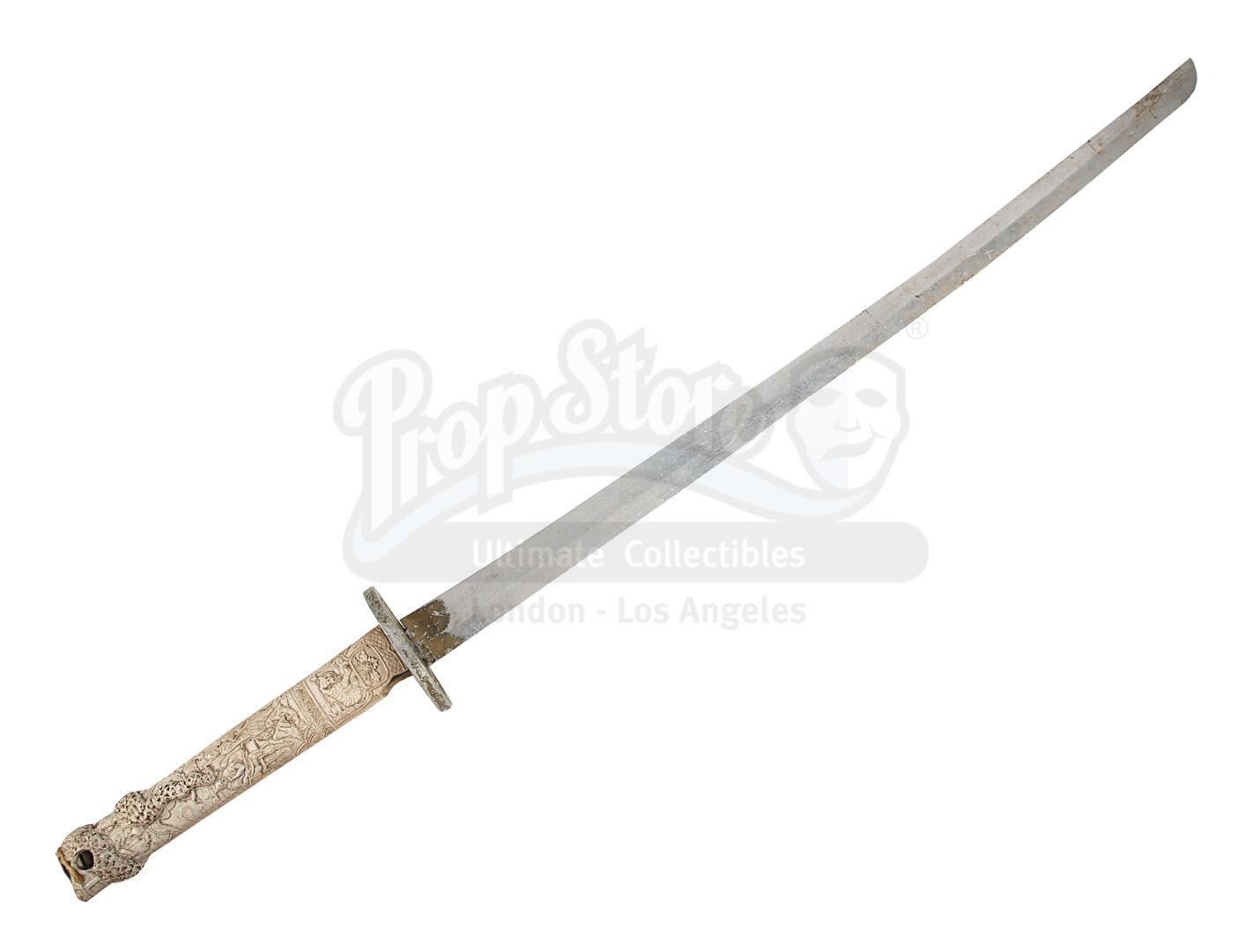 The sword comprises an aluminium blade, a gold-coloured machined aluminium tsuba and a cast resin grip finished in cream to replicate worked ivory. Ornate Japanese-inspired patterns decorate the grip. The weapon displays scuffing and corrosion on the blade, notable paint wear on the tsuba, and additional signs of damage on the grip. Dimensions: 96.5 cm x 9 cm x 9 cm (38" x 3 1/2" x 3 1/2")