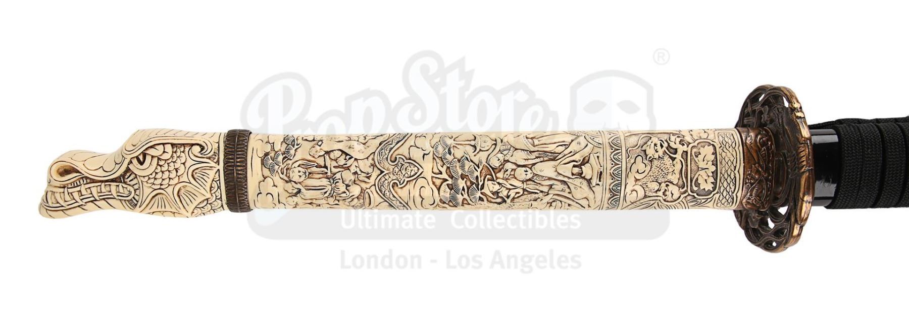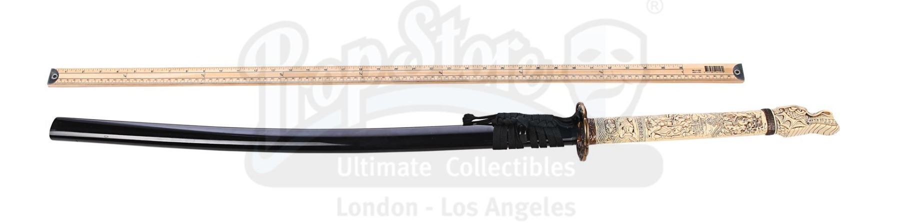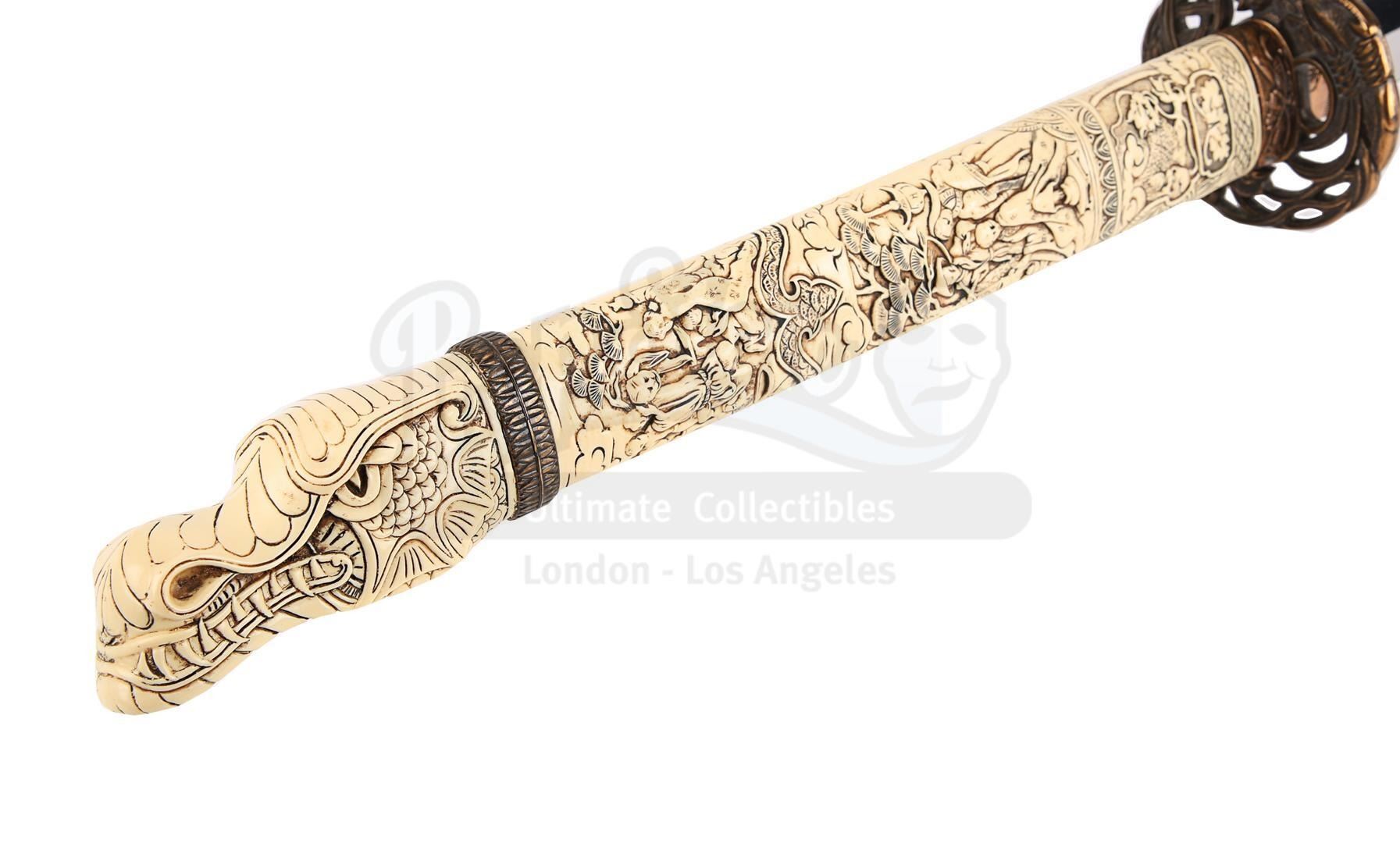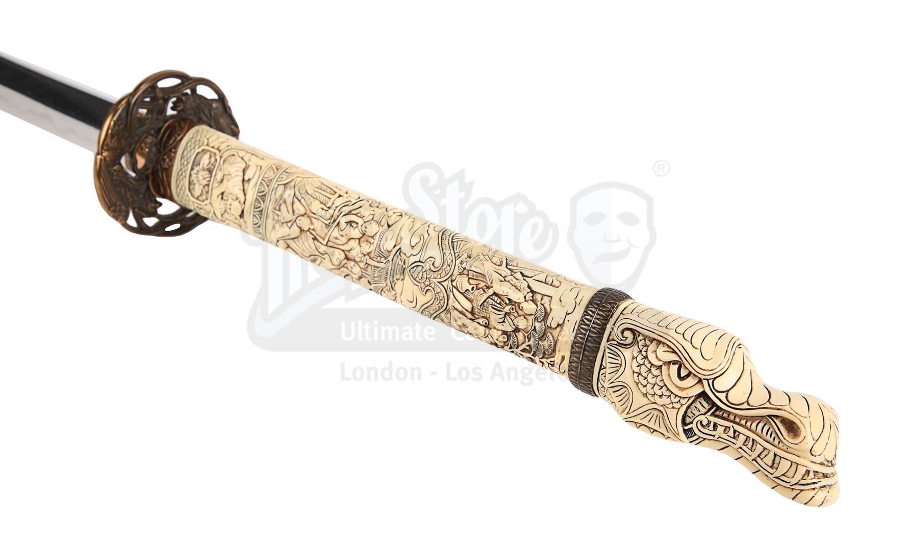 The sword comprises a polished aluminium blade with a high-impact plastic grip, which is finished to replicate the appearance of fashioned ivory. The grip features ornate carvings depicting tableaux from rural life, and the handle tip is carved into a dragon's snarling face. Between the handle and blade is a copper-coloured metal tsuba, engraved with images of birds of prey. Completing the lot is a black metal scabbard with black thread around the top. The blade and scabbard display light scratching and scuffs, and the lot is accompanied by a letter of authenticity. Dimensions (in scabbard): 107 cm x 8 cm x 8 cm (42" x 3 1/4" x 3 1/4")