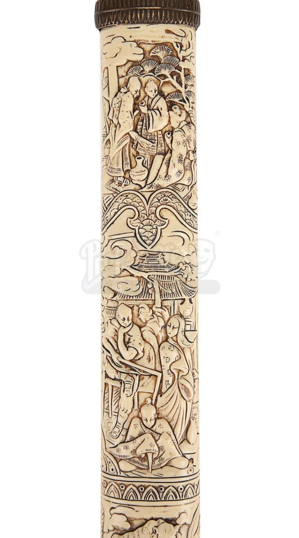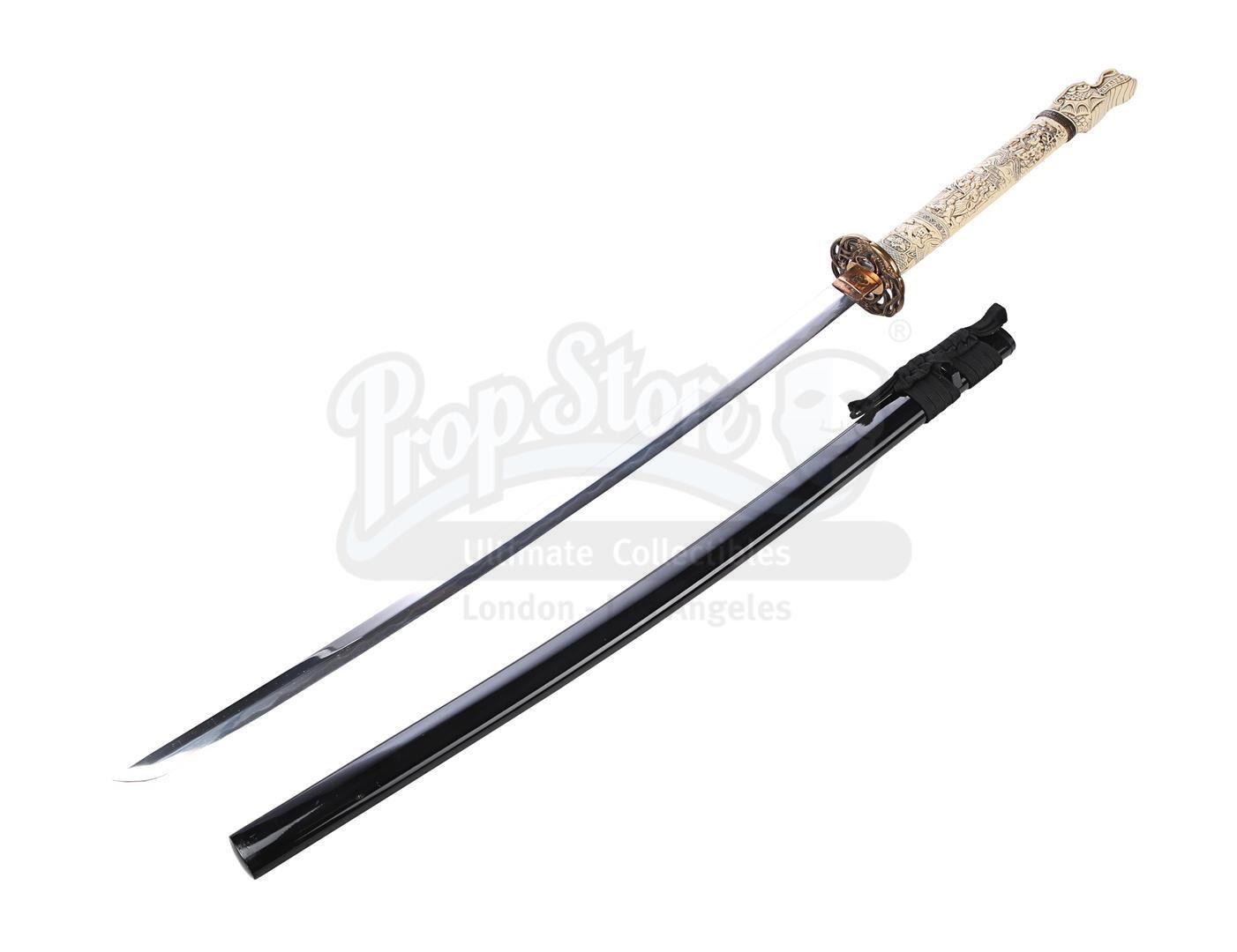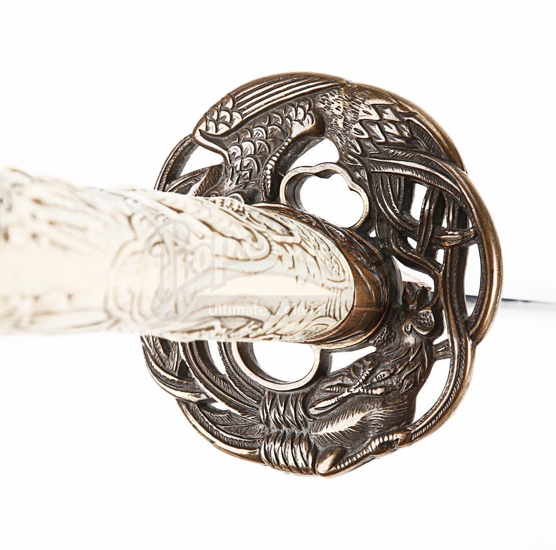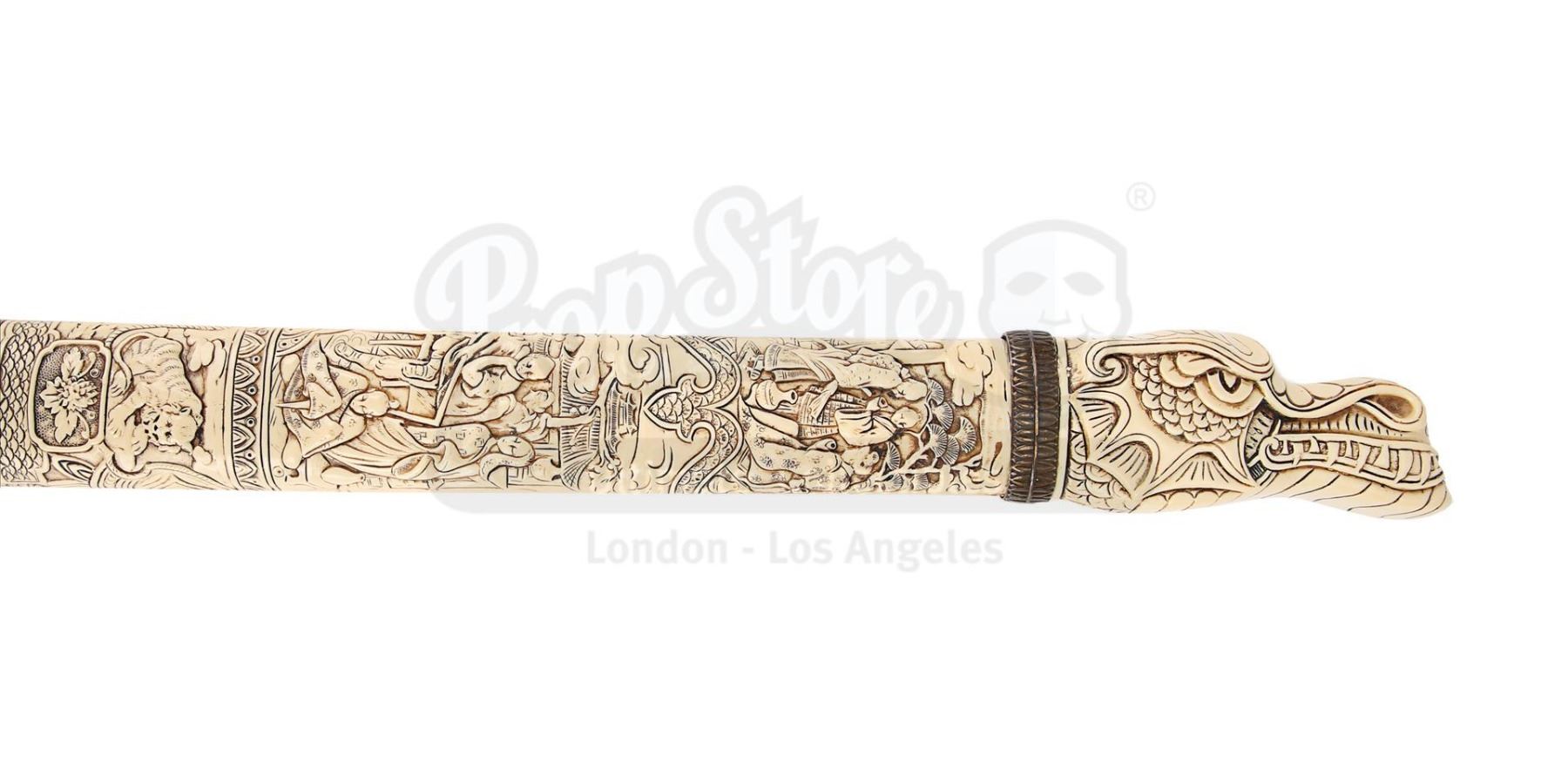 The sword comprises a polished aluminium blade with a high-impact plastic grip, which is finished to replicate the appearance of fashioned ivory. The grip features ornate carvings depicting tableaux from rural life, and the handle tip is carved into a dragon's snarling face. Between the handle and blade is a copper-coloured metal tsuba, engraved with images of birds of prey. Completing the lot is a black metal scabbard with black thread around the top. The blade and scabbard display light scratching and scuffs, and the lot is accompanied by a letter of authenticity. Dimensions (in scabbard): 107 cm x 8 cm x 8 cm (42" x 3 1/4" x 3 1/4")
