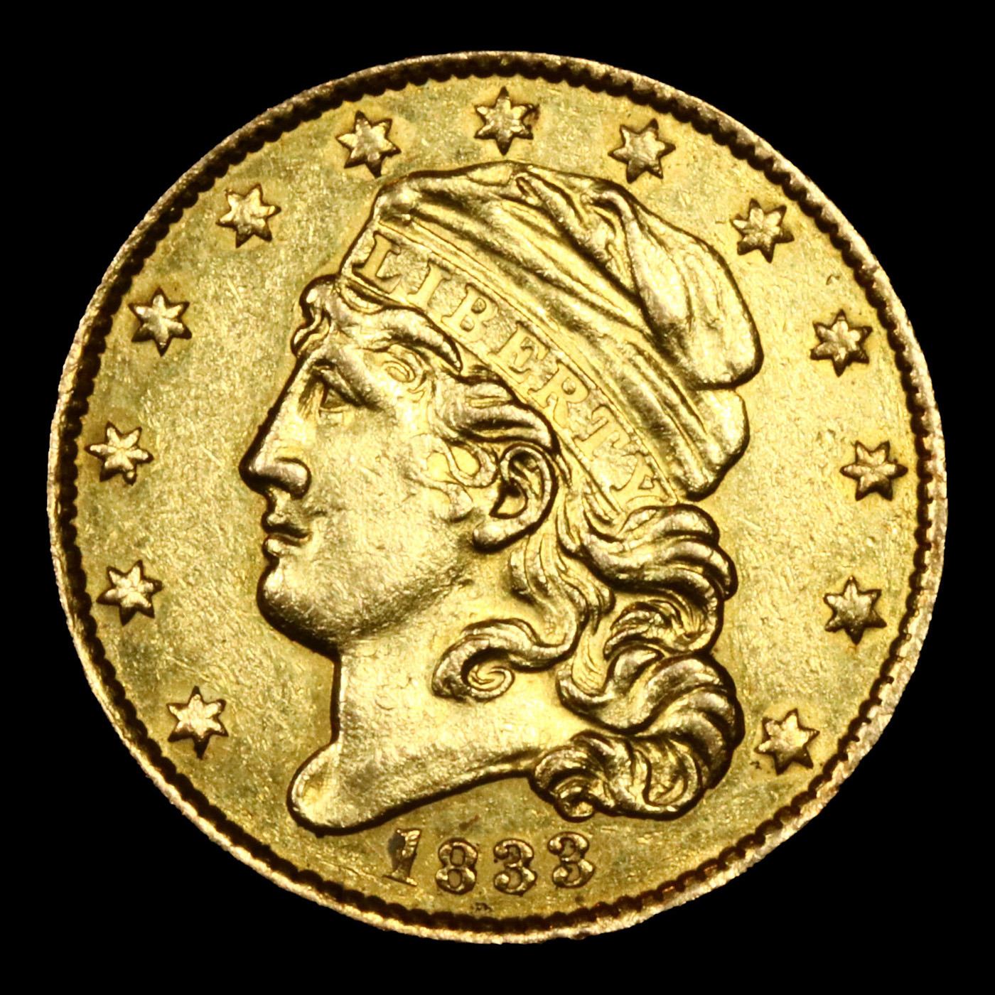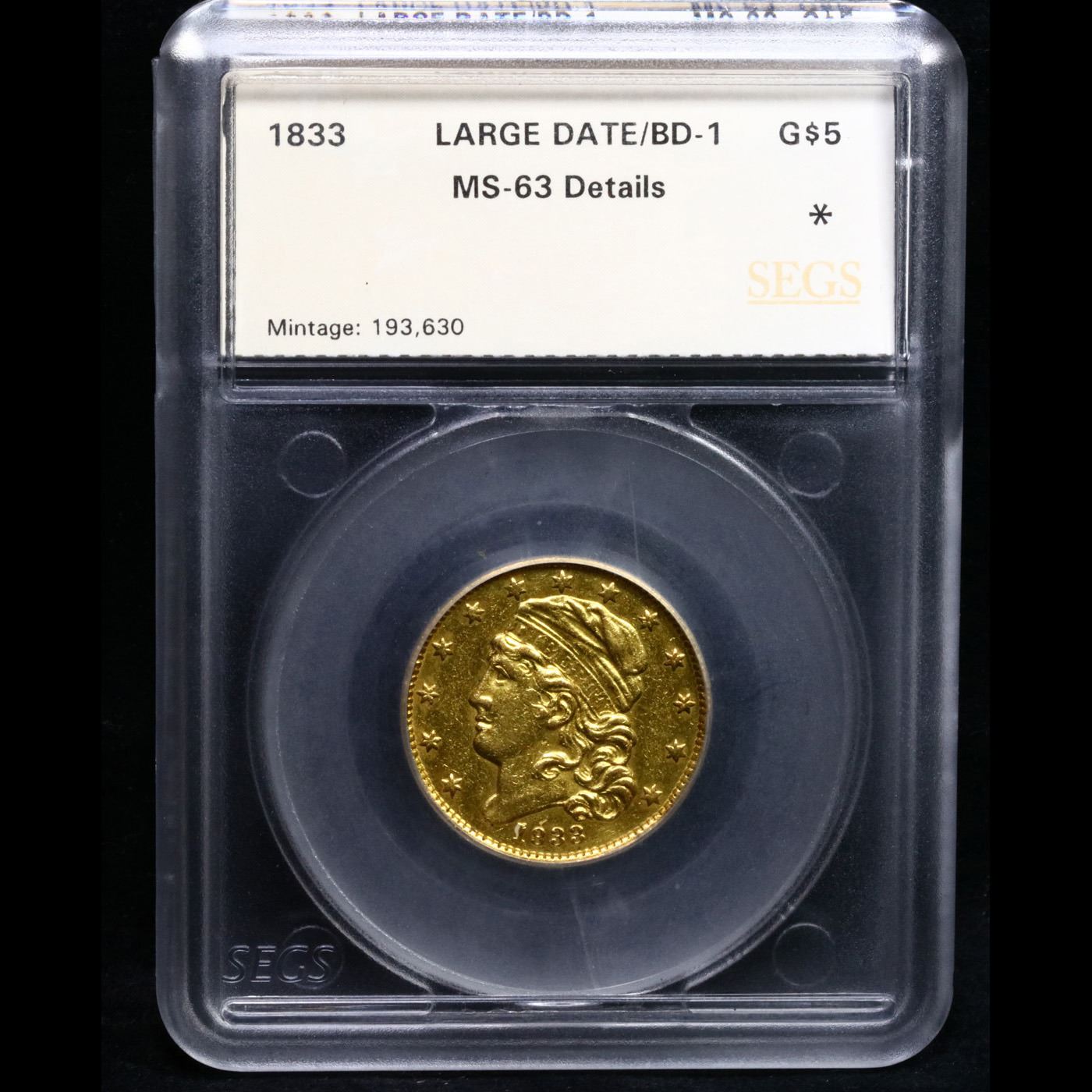 ***Auction Highlight*** 1833 Large Date BD-1 Gold Capped Bust Half Eagle $5 Graded ms63 details By SEGS. HIGHLIGHT OF THE ENTIRE AUCTION - Up for Auction is the Ultra rare 1833 Large Date BD-1 Capped Bust $5 Gold - A substantial mintage of 193,630 Capped Head Left half eagles was accomplished in 1833, with three die varieties known for the date. This coin represents the BD-1 variety, with the Large Date obverse. The actual size difference of the digits in the Small Date and Large Date variants is just barely distinguishable, but the style of the number punches is distinctly different. The 3s on the Large Date have pronounced knobs and the 8 is more blocklike rather than the italic (or belted) style seen on the Small Date. The BD-1 is a rare variety, with a surviving population of just 35-45 examples in all grades, but it is still seen more often than the Small Date varieties.An article by Paul Gilkes in the June 26, 2000 issue of Coin World deals directly with the rarity of the 1829 half eagle, but the explanation applies just as effectively to the 1833:"The main reason the 1829 Capped Head, Large Planchet half eagle is so difficult to obtain is that it and many of its predecessors fell victim to the great melts, a byproduct of the flood of Mexican and Peruvian silver. The influx of silver on the world market compared to gold supplies lowered the silver price, but appeared as an unstoppable increase in the value of gold reckoned in Mexican dollars. The result was widespread hoarding and melting of older gold coins when their bullion value exceeded their face value by enough to warrant a profit over the cost of melting. Tens of thousands of half eagles and other gold denominations of recent vintage were melted soon after their production and reclaimed ... "As a result, few people in the 1820s and 1830s ever saw or handled a U.S. quarter eagle or half eagle. The few that did survive are often encountered in relatively high grades. For the 1833, the average grade is 57.6. This coin is noticeably finer at the MS63 Details level. A bit softly struck on the obverse stars and the left portion of the eagle's wing, the surfaces otherwise are bright and the fields semireflective. Even, light reddish-yellow color is seen over each side of this rarely seen Capped Head issue. I have included an ms64 for your comparison. A Corey's Pick, Bid to Win, Don't let it get Away, you might not find its equal Coin. I give this coin my highest recommendation