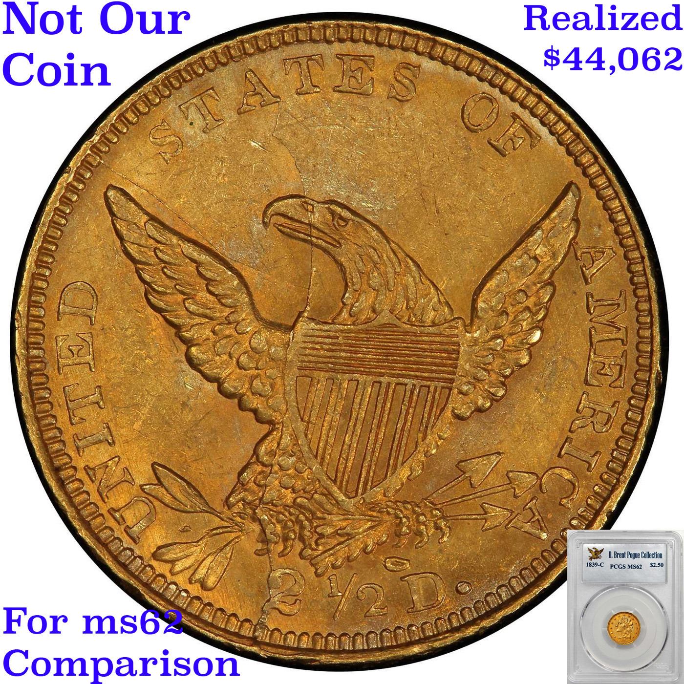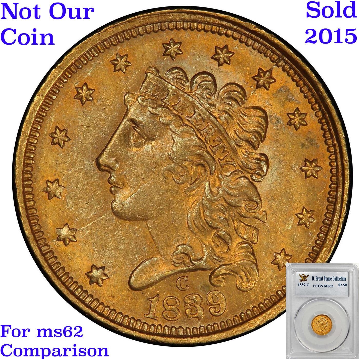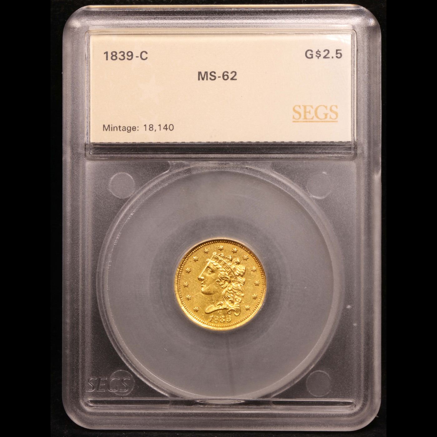 ***Auction Highlight*** 1839 c Variety 3-C R-3 TOP POP! Gold Classic Head Quarter Eagle $2.5 Graded ms62 By SEGS. HIGHLIGHT OF THE ENTIRE AUCTION - Up for Auction is a TOP POP, Tied for Finest Known - an 1839-c Charlotte $2.5 Quarter Eagle, Recut 39, Variety 3-C, McCloskey-C, Breen-6150, R.3. The 1839-C is quite scarce and in demand from type collectors. Accordingly, the supply is under intense pressure. Nice examples always command considerable premiums whenever they appear on the market. Two obverse dies are known for the year, one with a defective 9 in the date (traditionally called an 1839/8 overdate) and one with a repunched 9 in the date. The "overdate" obverse die was used with two different reverses to create the 2-A and 2-B varieties in the Winter Gold Coins of the Charlotte Mint: 1838-1861, with the Repunched Date obverse, as here, used in a single die pairing. On the 3-C variety, the 3 in the date was punched too low, then corrected. The mintmark is placed further to the left than on Obverse 2, centered above the digits 83. On the reverse the branch tip extends only to the upper left tip of the D in UNITED. The lowest arrowhead extends to the gap between the serifs of the last A in AMERICA. Without specificity as to varieties, a total of 8-10 mint state examples survive. Apricot-gold patina imbued with occasional splashes of grayish-green enriches both sides of the current offering. The strike is somewhat better than often seen on the issue; most of the star centrils are strong, as are Liberty's hair curls. A few minute contacts scattered about result in occasional interruptions in the luster flow. All in all, this piece generates considerable eye appeal for the designated grade. I have included 2 other ms62 examples for your comparison. A Corey's Pick, Bid to Win, Don't let it get Away, you might not find its equal Coin. I give this coin my highest recommendation