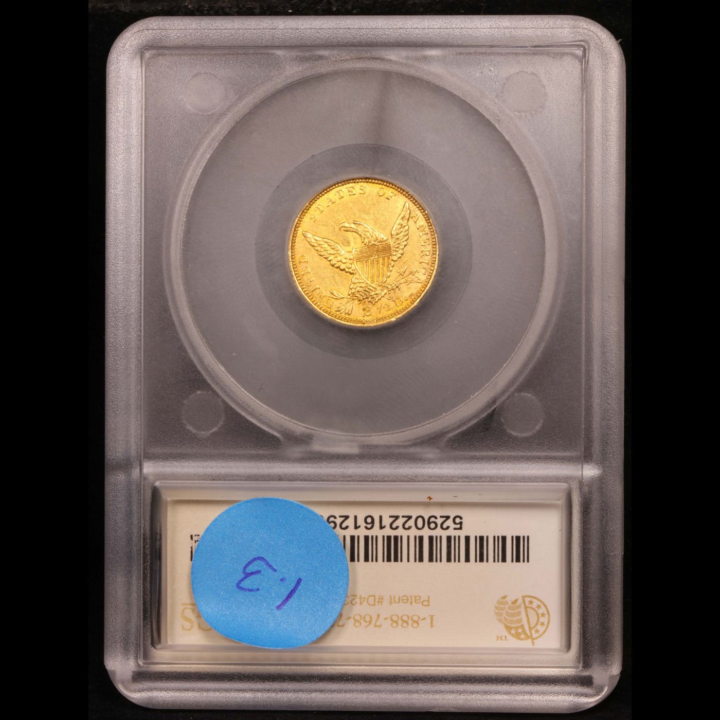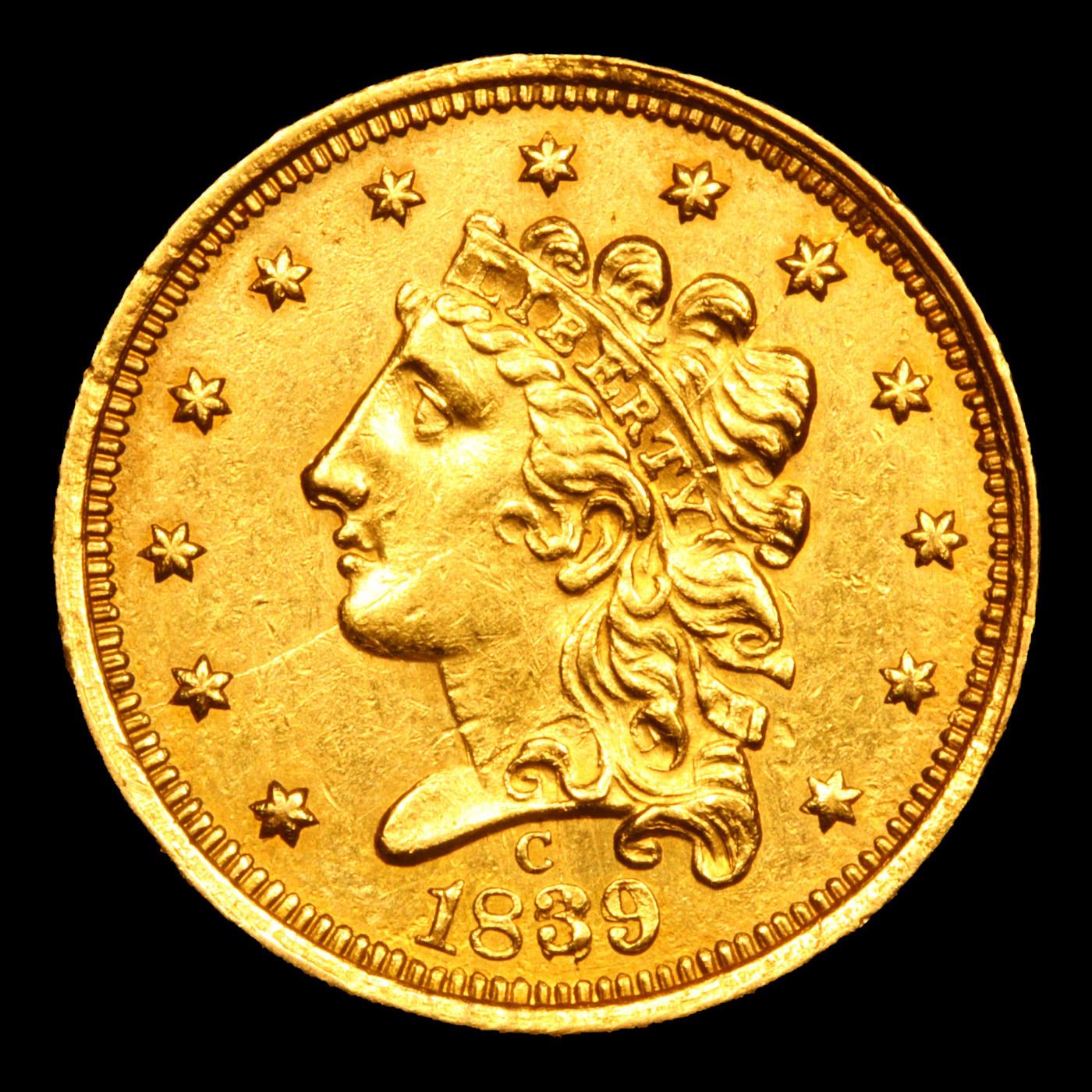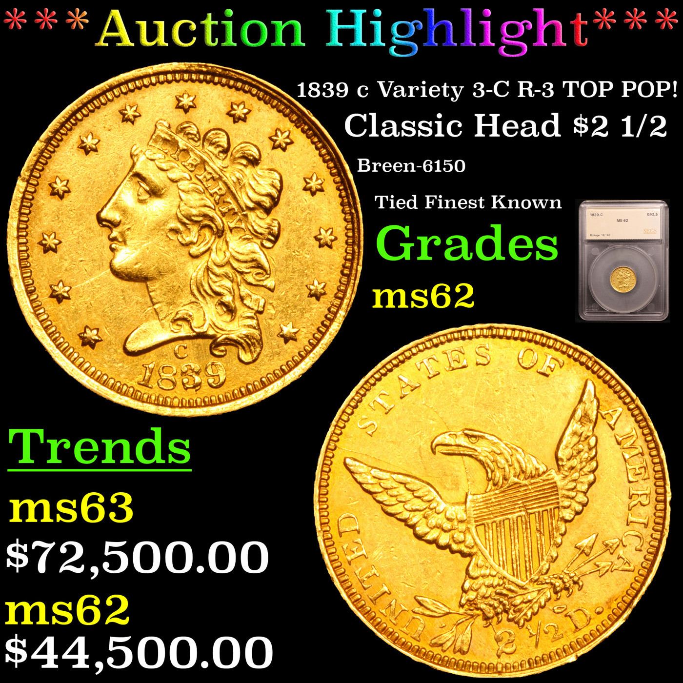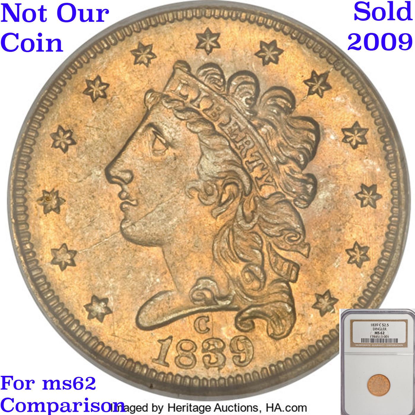 ***Auction Highlight*** 1839 c Variety 3-C R-3 TOP POP! Gold Classic Head Quarter Eagle $2.5 Graded ms62 By SEGS. HIGHLIGHT OF THE ENTIRE AUCTION - Up for Auction is a TOP POP, Tied for Finest Known - an 1839-c Charlotte $2.5 Quarter Eagle, Recut 39, Variety 3-C, McCloskey-C, Breen-6150, R.3. The 1839-C is quite scarce and in demand from type collectors. Accordingly, the supply is under intense pressure. Nice examples always command considerable premiums whenever they appear on the market. Two obverse dies are known for the year, one with a defective 9 in the date (traditionally called an 1839/8 overdate) and one with a repunched 9 in the date. The "overdate" obverse die was used with two different reverses to create the 2-A and 2-B varieties in the Winter Gold Coins of the Charlotte Mint: 1838-1861, with the Repunched Date obverse, as here, used in a single die pairing. On the 3-C variety, the 3 in the date was punched too low, then corrected. The mintmark is placed further to the left than on Obverse 2, centered above the digits 83. On the reverse the branch tip extends only to the upper left tip of the D in UNITED. The lowest arrowhead extends to the gap between the serifs of the last A in AMERICA. Without specificity as to varieties, a total of 8-10 mint state examples survive. Apricot-gold patina imbued with occasional splashes of grayish-green enriches both sides of the current offering. The strike is somewhat better than often seen on the issue; most of the star centrils are strong, as are Liberty's hair curls. A few minute contacts scattered about result in occasional interruptions in the luster flow. All in all, this piece generates considerable eye appeal for the designated grade. I have included 2 other ms62 examples for your comparison. A Corey's Pick, Bid to Win, Don't let it get Away, you might not find its equal Coin. I give this coin my highest recommendation