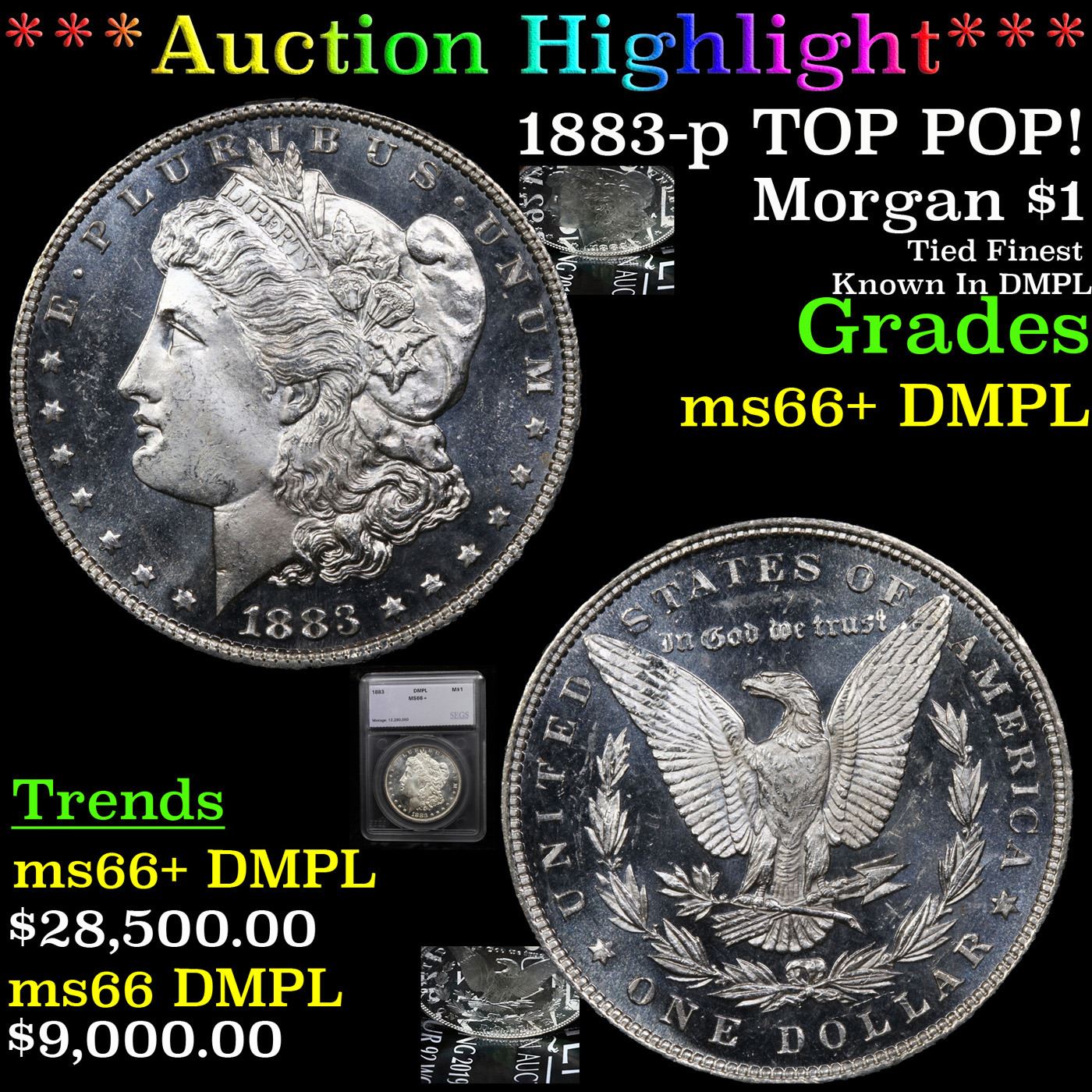 ***Auction Highlight*** 1883-p TOP POP! Morgan Dollar $1 Graded ms66+ DMPL By SEGS. HIGHLIGHT OF THE ENTIRE AUCTION - TOP POP - Up for Auction is a TOP POP, Tied for finest known in DMPL, 1883-p Morgan Dollar. The 1883 Morgan dollar boasts a huge mintage of nearly 12.3 million pieces, making the issue an available one in all grades and a favorite choice of type collectors. Unfortunately, the issue was not particularly well-made, as the demands of such a large production made quality control a second priority. Proof like coins are sometimes encountered, but examples with intense cameo contrast are rare.The present coin is a Plus-graded Premium Gem, with sharply detailed, frosty design elements that provide stunning cameo contrast with the deeply mirrored fields. The mostly brilliant, well-preserved surfaces show fully untoned surfaces and overall eye appeal is terrific. A Corey's Pick, Bid to Win, Don't let it get Away, you might not find its equal Coin. I give this coin my highest recommendation