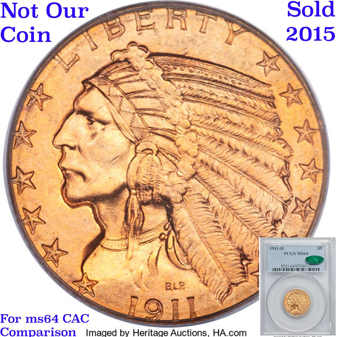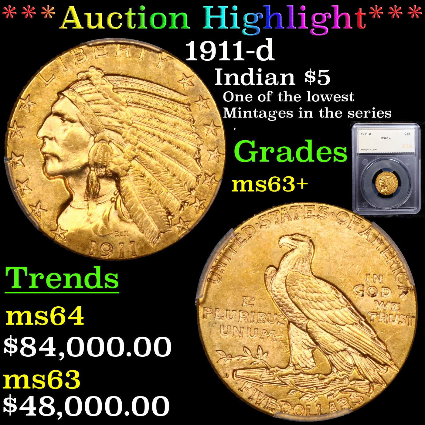 ***Auction Highlight*** 1911-d Gold Indian Half Eagle $5 Graded ms63+ By SEGS. HIGHLIGHT OF THE ENTIRE AUCTION - Up for Auction is the Key 1911-d $5 Indian. A magnificent example of this Denver Mint rarity. The complexion is radiant and flashy with strong luster and medium gold patina throughout. The fields show just trivial imperfections which are largely unnoticed to the naked eye. Sharply struck and attractive in hand. The production of 72,500 half eagles at the Denver Mint in 1911 gives this issue one of lowest mintages in the Indian series, second only to the 1909-O. Mintmark collecting was still in its infancy at the time and most collectors were content to add a Proof example for the year. As such, the 1911-D $5 is one of the most challenging Indian half eagles to locate in Mint State. While relatively available in AU, the issue becomes conditionally scarce any higher and most Mint State examples are at the lowest levels. The mass meltings of the late 1930s further reduced the number of available specimens. The 1911-D half eagle has long been recognized as a key date issue and is always in demand by specialists in 20th century gold coinage. I have included 2 examples for your comparison, an ms63 & an ms64. I think ours compares favorably. A Corey's Pick, Bid to Win, Don't let it get Away, you might not find its equal Coin. I give this coin my highest recommendation