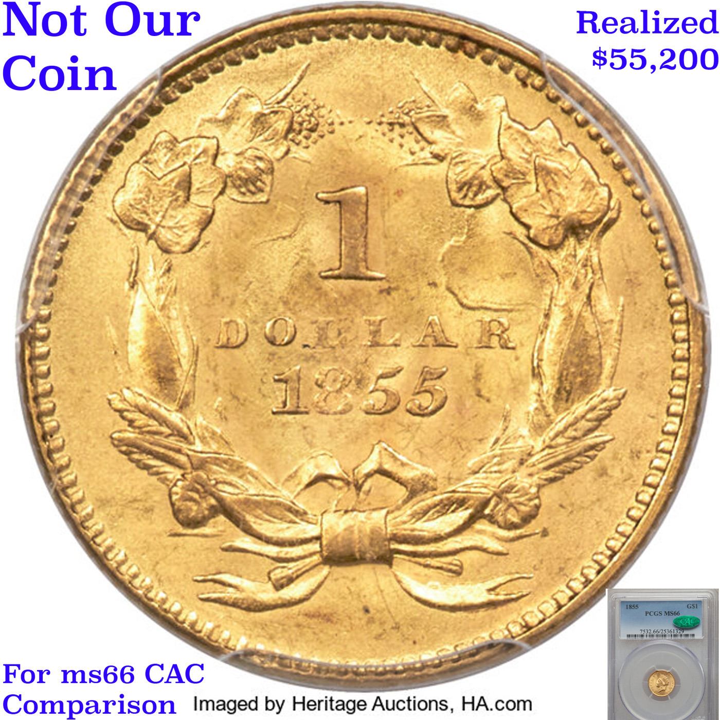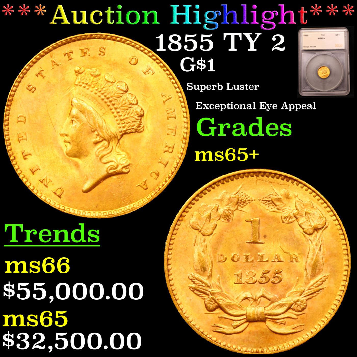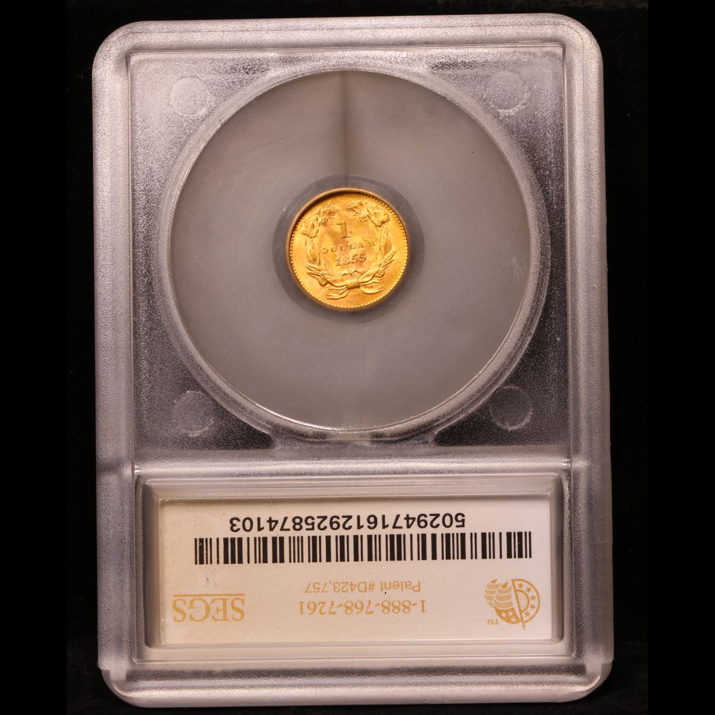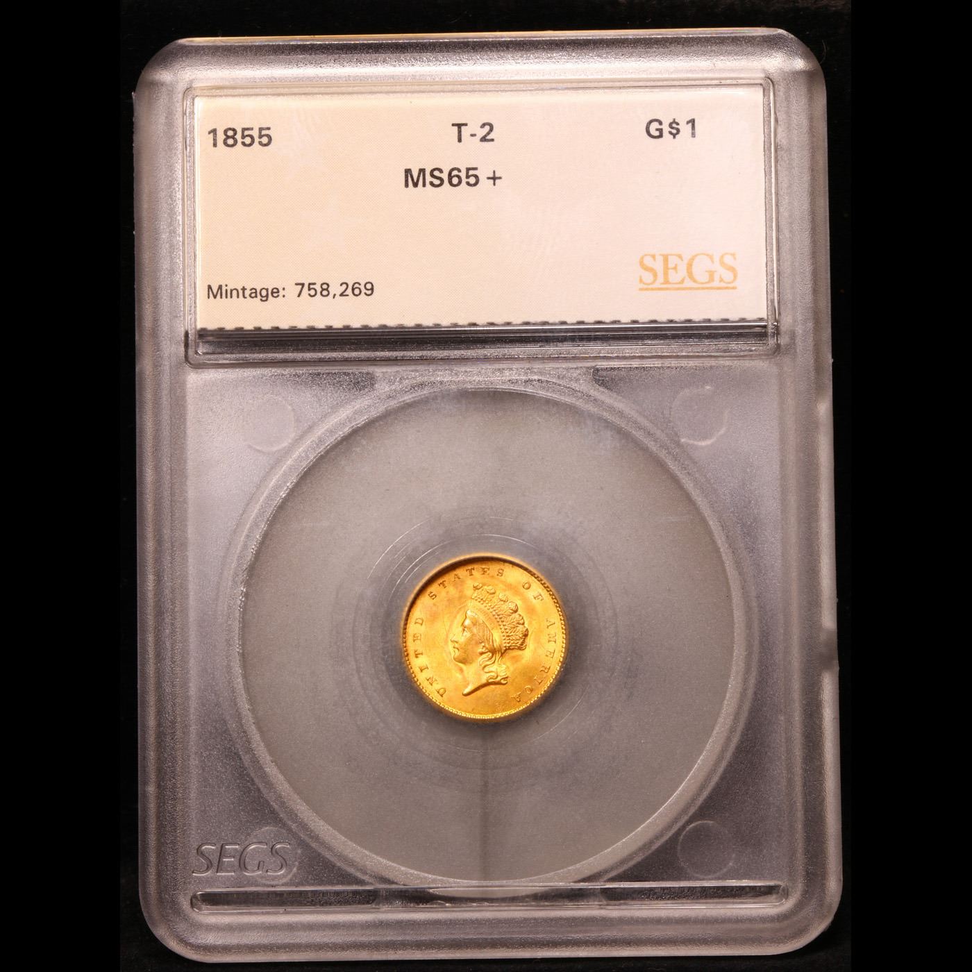 ***Auction Highlight*** 1855 TY 2 Gold Dollar $1 Graded ms65+ By SEGS.        HIGHLIGHT of the NIGHT – Up for Auction is a superb Premium GEM example of this scarce two year Type design, 1855 TYII Gold Dollar Graded ms65+, among the finest known.  This exceptional upper end Gem 1855 gold dollar will please even the most discerning collector. Frosty surfaces are fully lustrous and display warm medium gold patina with blushes of even more vivid reddish-rose iridescence on the obverse. Sharply struck overall with only a trace of faint clash marks (as made) in the fields around the central design elements.When the Act of February 21, 1853 was passed, its intended purpose was to return subsidiary silver coinage into circulation by reducing the weight of those denominations enough that their face value exceeded their intrinsic value. Huge quantities of the lighter coins were produced, so much so that by 1855, the law had basically achieved its goal. The gold dollar was created to help fill the void formed by the disappearance of silver from commerce, and as more and more silver coins circulated, the need for the gold dollar began to drop. Production figures fell accordingly; in 1855 only 758,269 gold dollars were coined at the Philadelphia Mint while the three Southern branch mints turned out well under 70,000 pieces combined. Once silver quarters and half dollars were frequent sights again, the tiny gold dollar was no longer a desired coin.The high relief of the Type II gold dollar caused problems when the pressure required to strike up the design also put undue stress on the thinner planchet. This caused the centers of the coin to be very poorly struck; in fact nearly every known example of the 1855 gold dollar is found with weakness at the digits 85 in the date and the letters LL in DOLLAR. Even on specimens struck from fresh dies the 8 in the date is often very flat at the upper left portion of the top loop, as it is here. This issue is particularly well known for being generally poorly struck and clashed dies are the rule rather than the exception. The design's technical difficulties proved to be its undoing and in 1856, a revised version with a larger bust designed in lower relief was introduced.The high relief also proved to be detrimental in circulation, as the obverse was quick to show signs of wear, making Mint State examples particularly elusive. Maybe about a fifth of the estimated 5,000 to 7,500 survivors qualify as Mint State, of which only a couple dozen are at the Gem level. As one of the finest known examples graded, this is a superior quality example both for the issue and for the entire type. A superb candidate for anyone seeking a premium quality representative of this challenging type.  I am including both an ms65 & ms66 example for your comparison.  I think ours compares very favorably. A Corey's Pick, Bid to Win, Don't let it get Away, you might not find its equal Coin.  I give this coin my highest recommendation