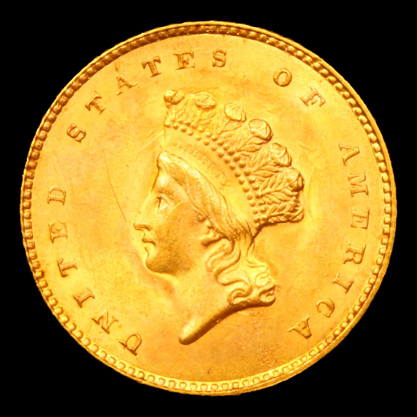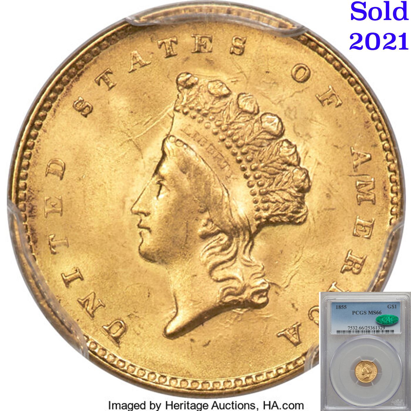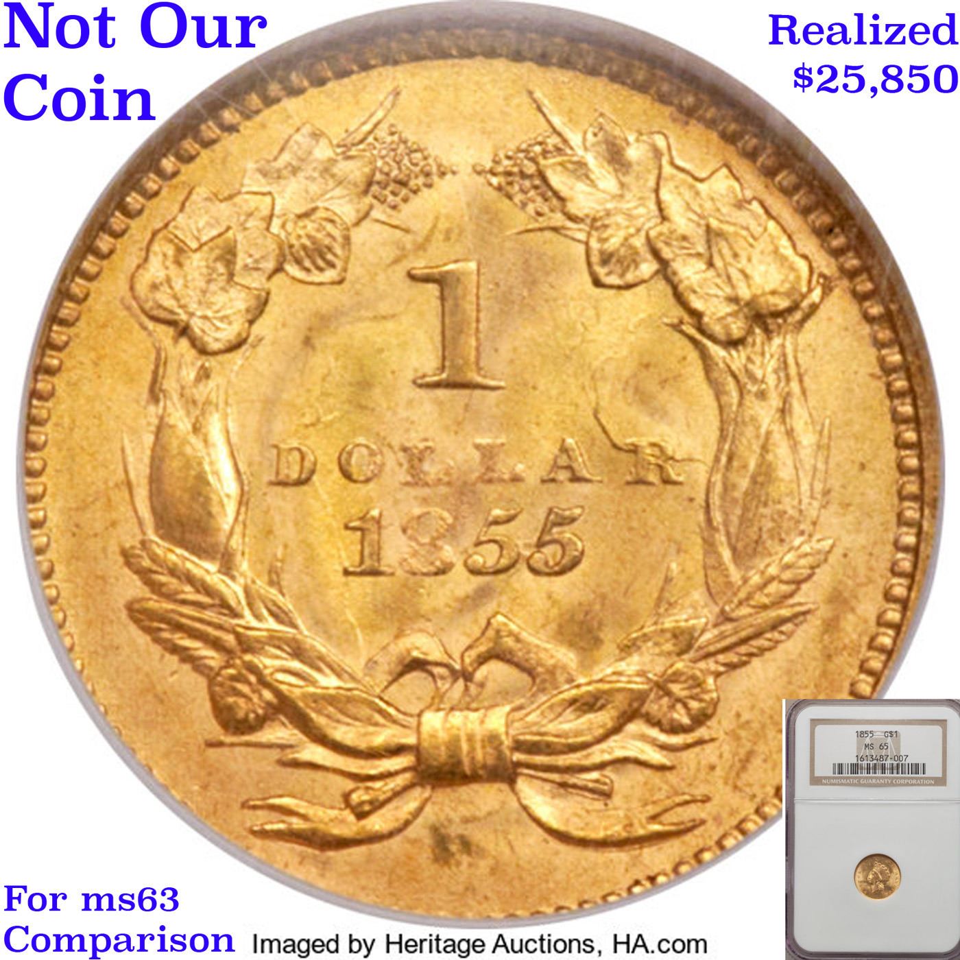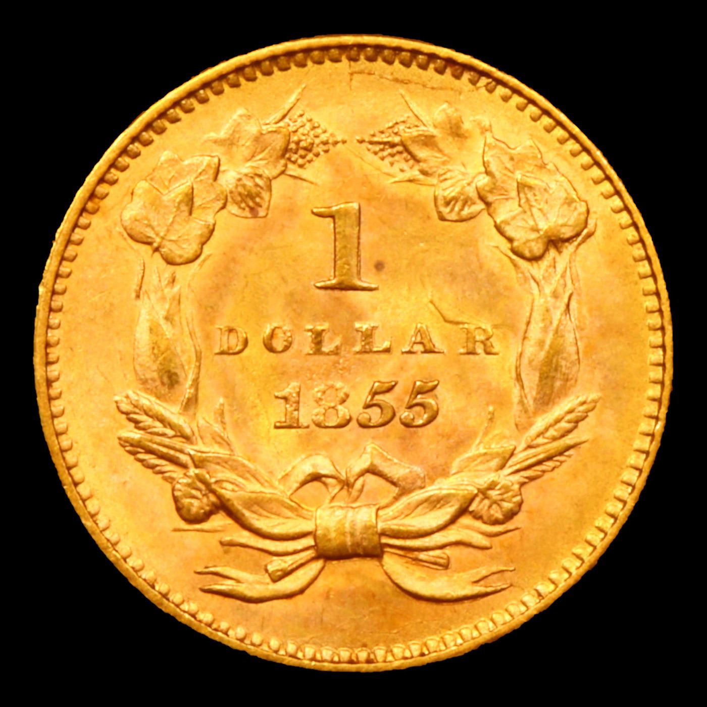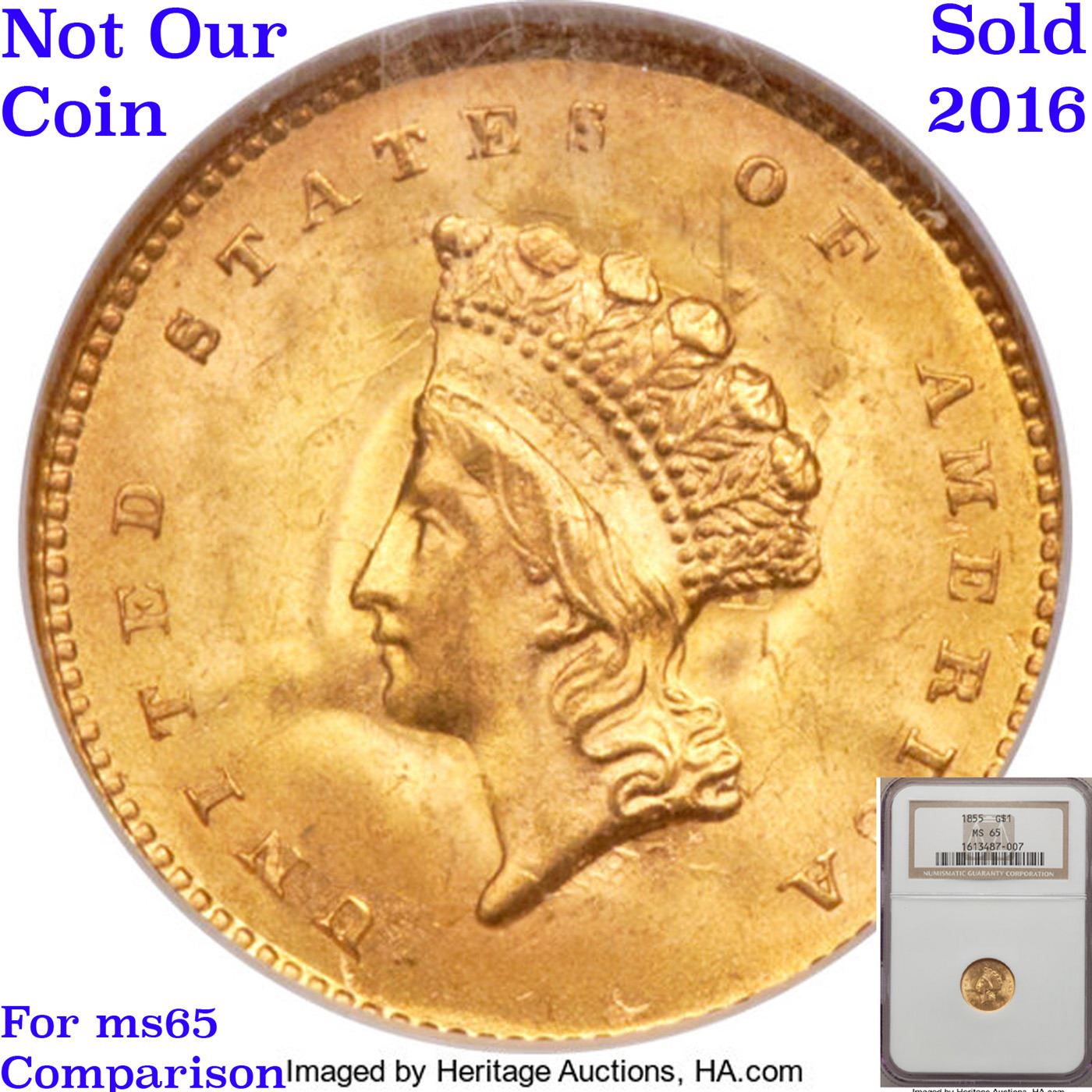 ***Auction Highlight*** 1855 TY 2 Gold Dollar $1 Graded ms65+ By SEGS.        HIGHLIGHT of the NIGHT – Up for Auction is a superb Premium GEM example of this scarce two year Type design, 1855 TYII Gold Dollar Graded ms65+, among the finest known.  This exceptional upper end Gem 1855 gold dollar will please even the most discerning collector. Frosty surfaces are fully lustrous and display warm medium gold patina with blushes of even more vivid reddish-rose iridescence on the obverse. Sharply struck overall with only a trace of faint clash marks (as made) in the fields around the central design elements.When the Act of February 21, 1853 was passed, its intended purpose was to return subsidiary silver coinage into circulation by reducing the weight of those denominations enough that their face value exceeded their intrinsic value. Huge quantities of the lighter coins were produced, so much so that by 1855, the law had basically achieved its goal. The gold dollar was created to help fill the void formed by the disappearance of silver from commerce, and as more and more silver coins circulated, the need for the gold dollar began to drop. Production figures fell accordingly; in 1855 only 758,269 gold dollars were coined at the Philadelphia Mint while the three Southern branch mints turned out well under 70,000 pieces combined. Once silver quarters and half dollars were frequent sights again, the tiny gold dollar was no longer a desired coin.The high relief of the Type II gold dollar caused problems when the pressure required to strike up the design also put undue stress on the thinner planchet. This caused the centers of the coin to be very poorly struck; in fact nearly every known example of the 1855 gold dollar is found with weakness at the digits 85 in the date and the letters LL in DOLLAR. Even on specimens struck from fresh dies the 8 in the date is often very flat at the upper left portion of the top loop, as it is here. This issue is particularly well known for being generally poorly struck and clashed dies are the rule rather than the exception. The design's technical difficulties proved to be its undoing and in 1856, a revised version with a larger bust designed in lower relief was introduced.The high relief also proved to be detrimental in circulation, as the obverse was quick to show signs of wear, making Mint State examples particularly elusive. Maybe about a fifth of the estimated 5,000 to 7,500 survivors qualify as Mint State, of which only a couple dozen are at the Gem level. As one of the finest known examples graded, this is a superior quality example both for the issue and for the entire type. A superb candidate for anyone seeking a premium quality representative of this challenging type.  I am including both an ms65 & ms66 example for your comparison.  I think ours compares very favorably. A Corey's Pick, Bid to Win, Don't let it get Away, you might not find its equal Coin.  I give this coin my highest recommendation
