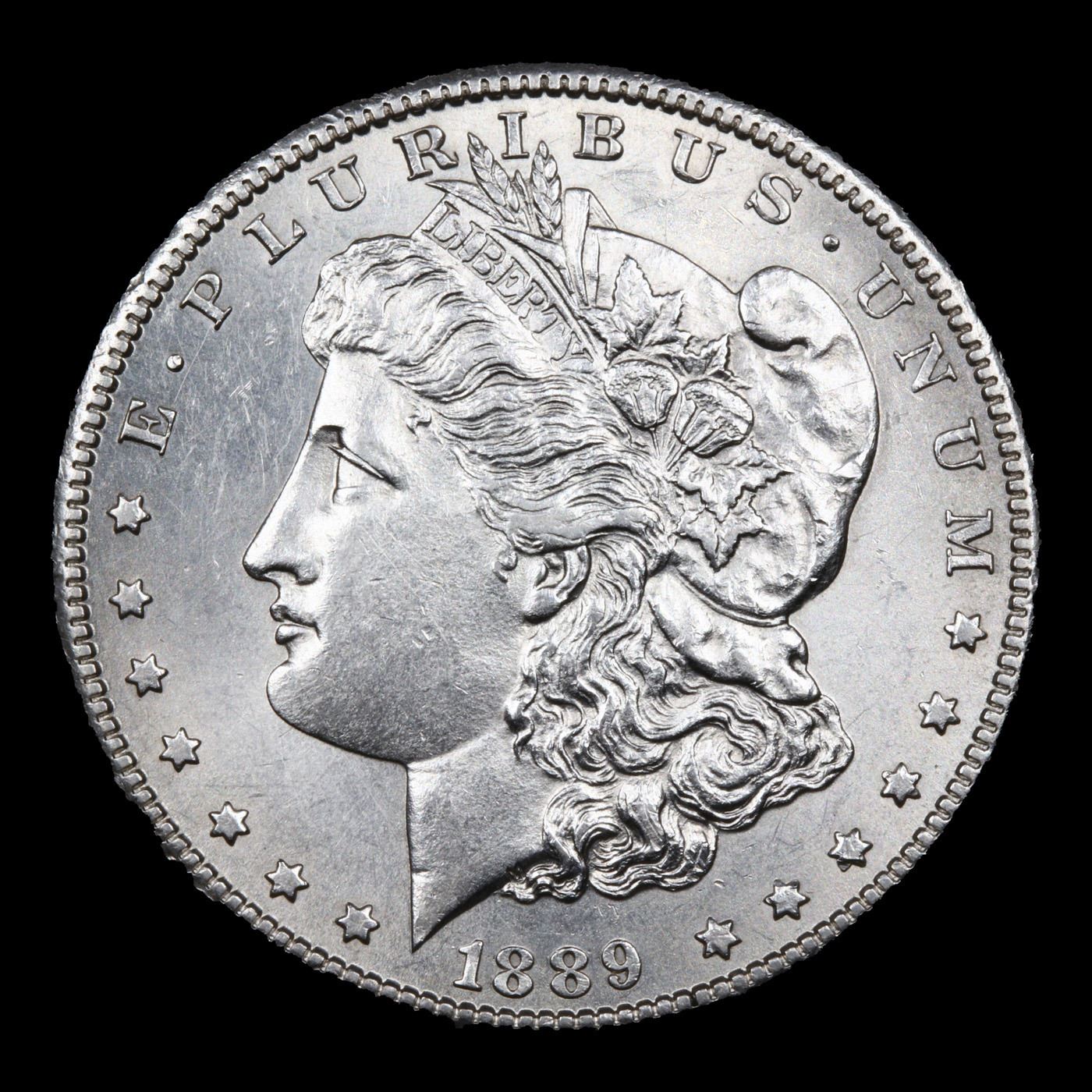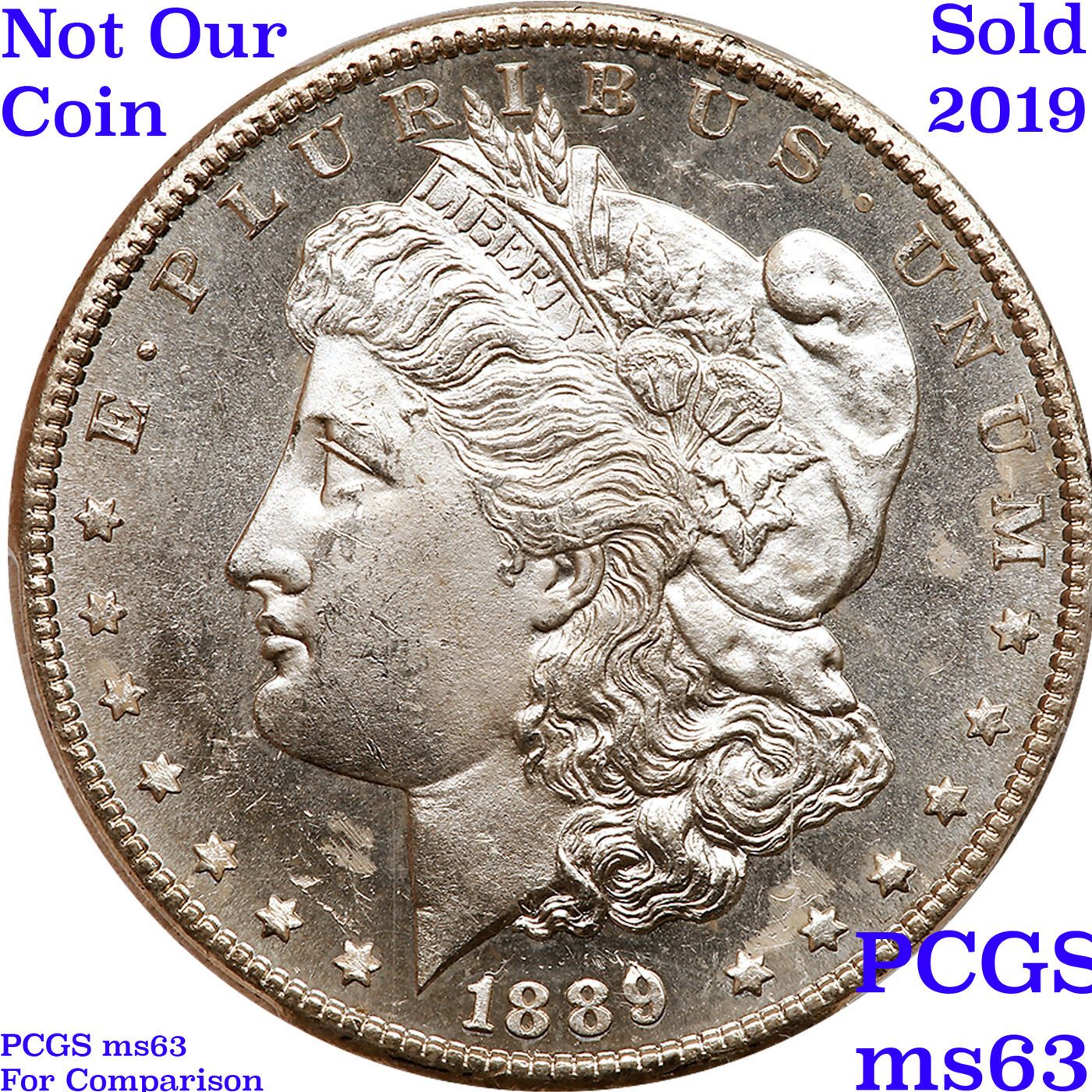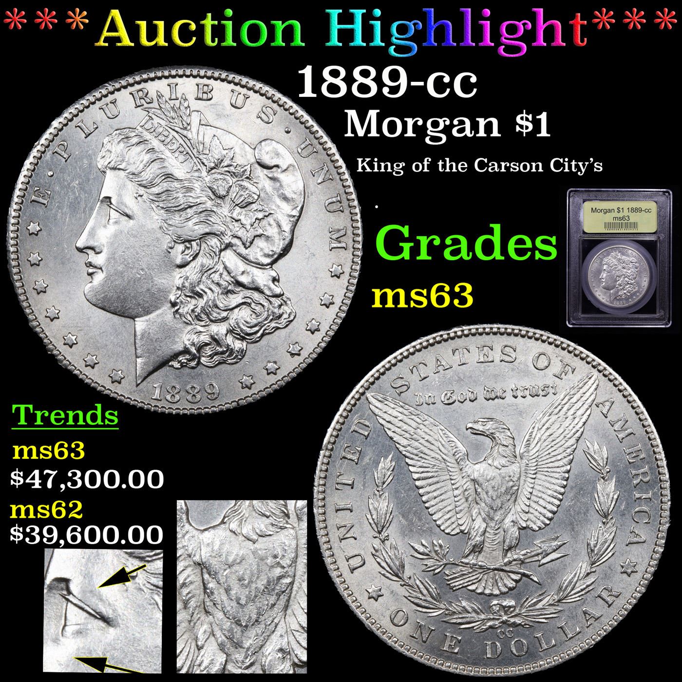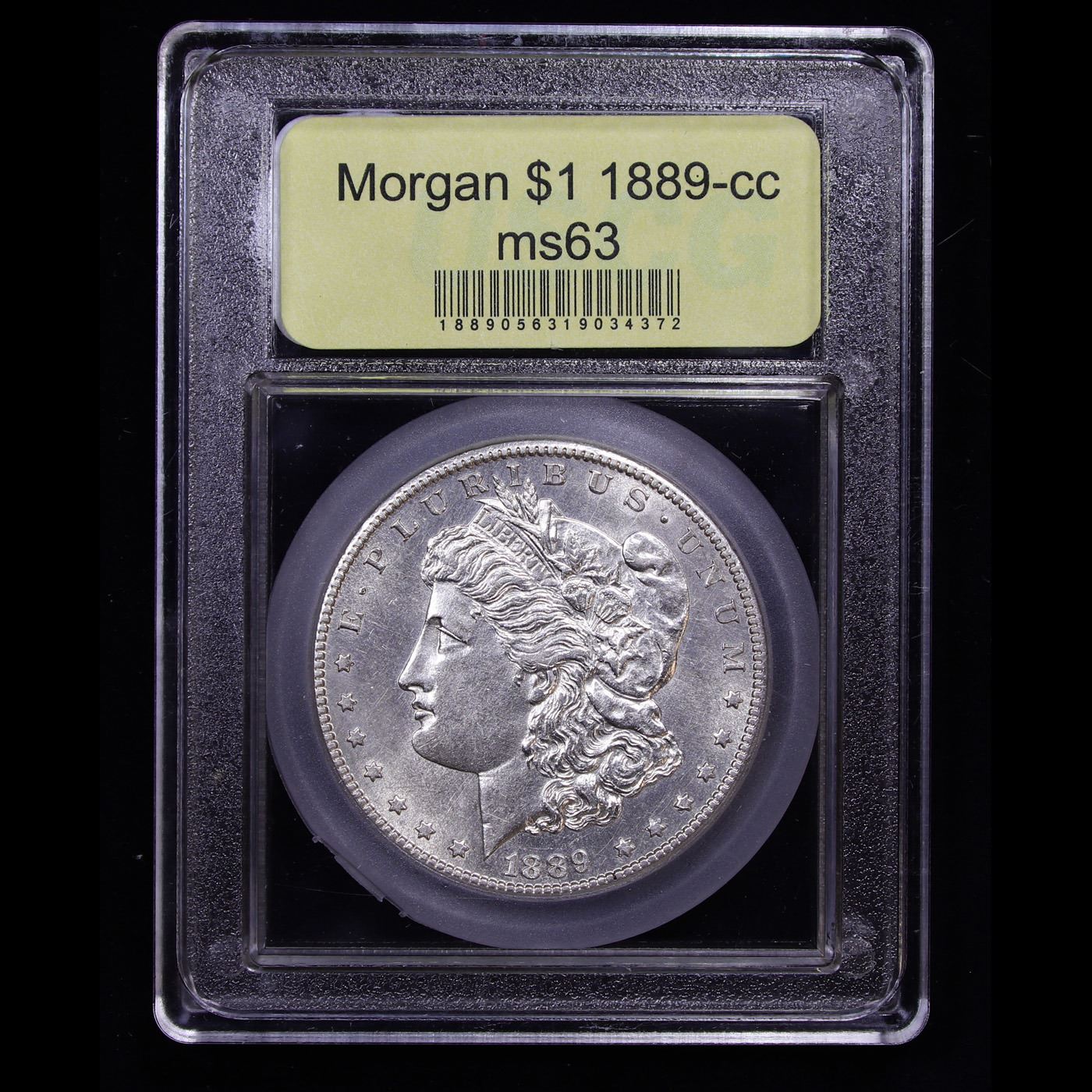 ***Auction Highlight*** 1889-cc Morgan Dollar $1 Graded Select Unc By USCG. HIGHLIGHT OF THE NIGHT - Up for Auction is a Mint State 1889-cc The Key to the Carson City Collection. The obverse die is perfect and the reverse die displays delicate die cracks through much of the legend. There are five documented die varieties, and any piece that does not match one of the five varieties is immediately suspect as a possible counterfeit. Such pieces abound. However, this unquestionably genuine Select Mint State piece will enjoy heightened bidder activity. Both sides are fully brilliant, untoned, and lustrous with satiny surfaces and outstanding eye appeal. I have included another ms63 for your comparison.