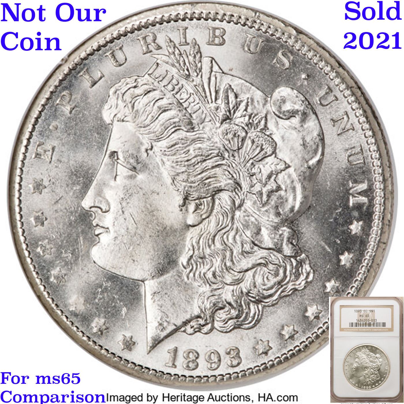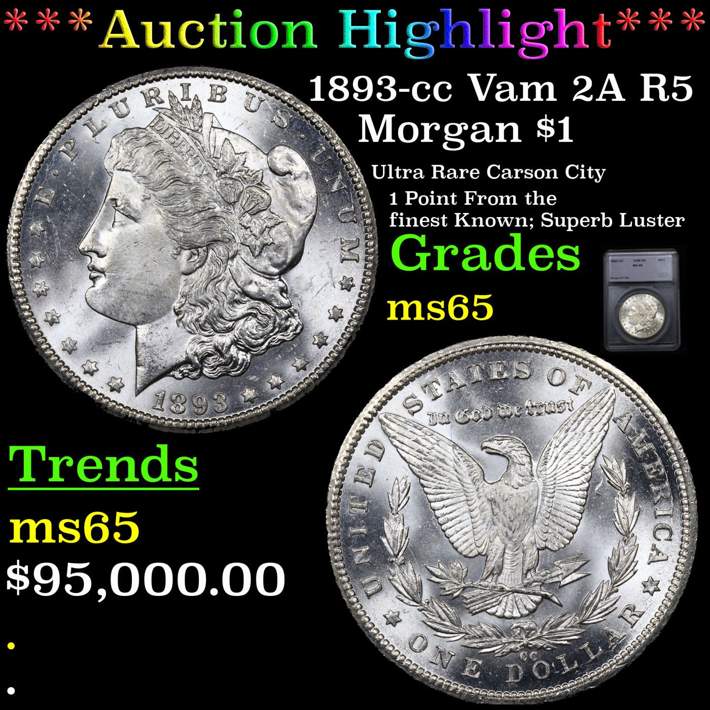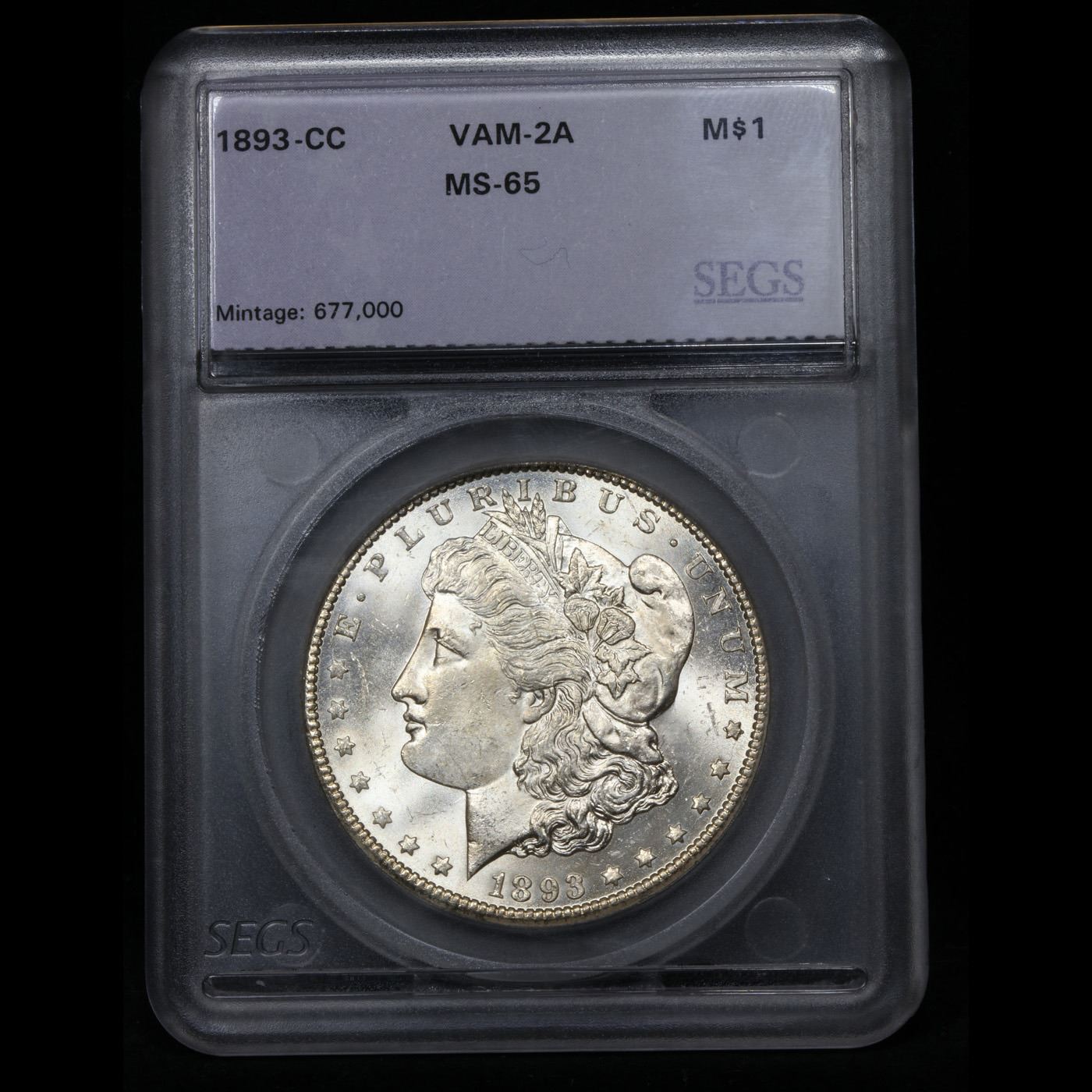 ***Auction Highlight*** 1893-cc Vam 2A R5 Morgan Dollar $1 Graded ms65 By SEGS. HIGHLIGHT of the NIGHT – Up for Auction is one of the last coins ever struck in the legendary Carson City Mint, a superb Gem 1893-cc Morgan Dollar, Vam 2A, Late Die State, (LDS), RARITY 5. The return of the anti-silver Democrat Grover Cleveland to the White House in the presidential election of 1892 sounded the death knell of coinage operations at the Carson City Mint. The last of the facility's Morgan dollars, a total of 677,000 pieces, fell from the presses in 1893. Although quantities of 1893-CC dollars emerged from government vaults from the 1920s through the late 1950s, their numbers were far fewer than those of many of the CC-mint issues from the early 1880s. A date that was essentially absent from the Treasury Department releases of the 1960s and the later General Services Administration sales, the 1893-CC is now widely recognized as one of the rarest Morgan dollars from the Nevada branch mint.In addition to mostly full definition, this Gem is praiseworthy for an uncommon lack of distracting abrasions. In fact, the number of blemishes is few, and there is not a single area of bothersome incompleteness of detail. Untoned, with rich, coruscant mint frost. and possessed of memorable eye appeal. The mint mark is tilted right and there is a die chip between the loops of the 3 (VAM 2a); die cracks are forming in the legends of both sides, and the area to the right of the eagle’s wing shows evidence of multiple die clashes. This appears to be one of the later state strikes which are said to be among the last Carson City silver dollars ever produced. One of the finest certified 1893-CC Morgan's, this coin shares the MS65 grade level with few coins and is 1 point from the finest known, an ms66 that trends $180,000 and last sold for $161,000. I have included 2 other ms65 examples for your comparison. A Corey's Pick, Bid to Win, Don't let it get Away, you might not find its equal Coin. I give this coin my highest recommendation