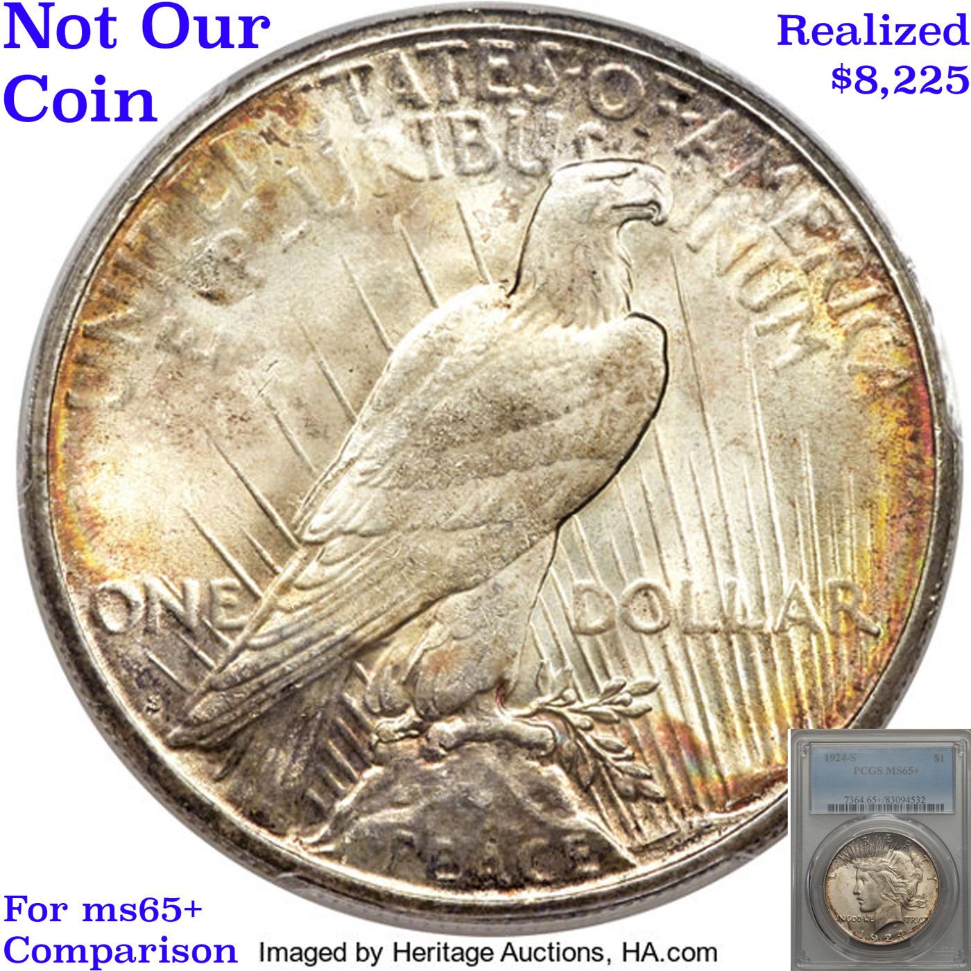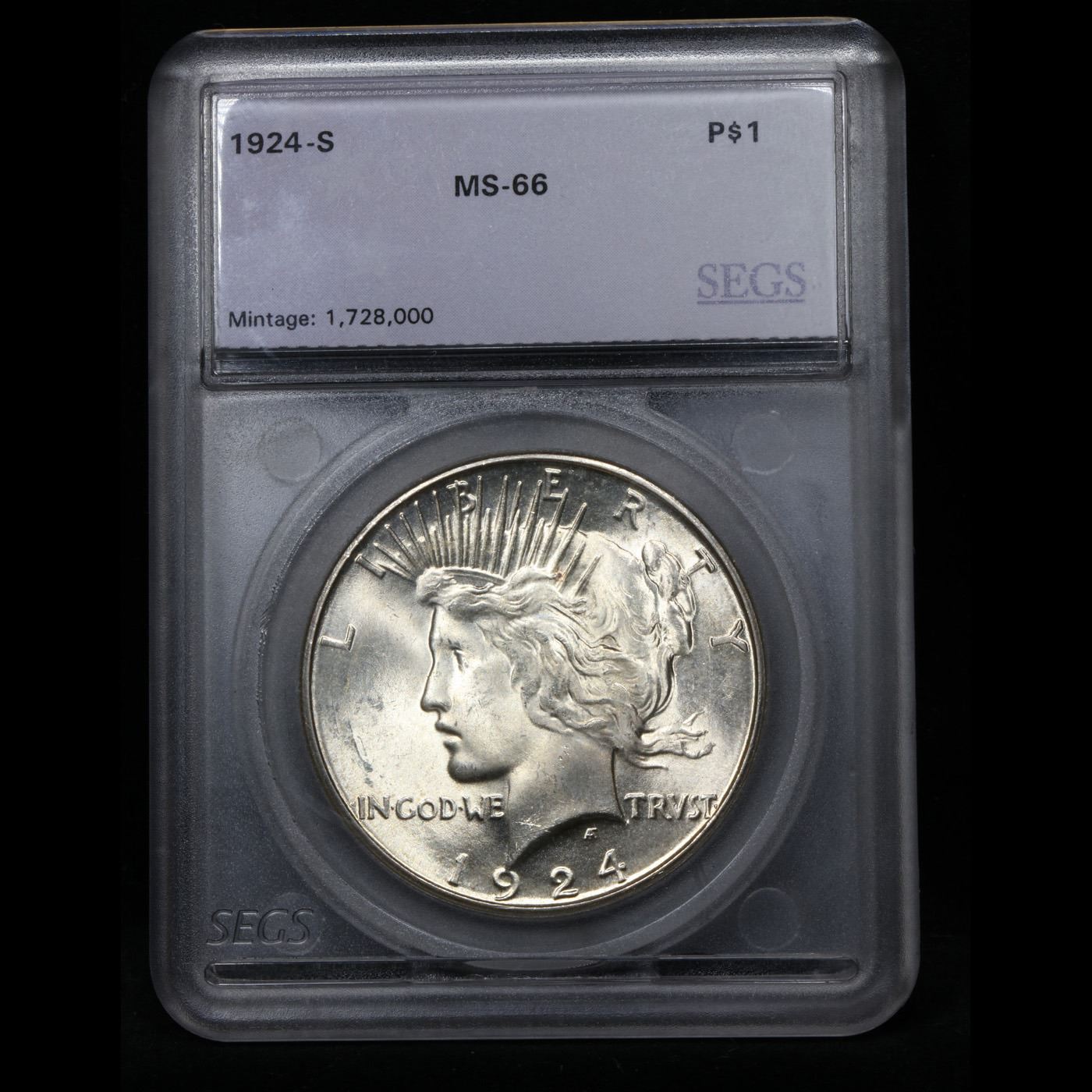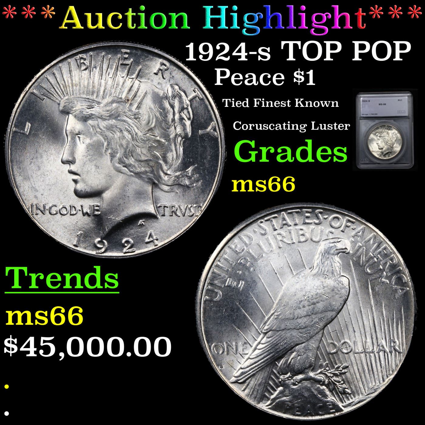 ***Auction Highlight*** 1924-s TOP POP Peace Dollar $1 Graded ms66 By SEGS. HIGHLIGHT OF THE NIGHT – Up for Auction is a Superb Key date of the Peace Dollar Series in ms66 Tied for Finest Known. An attractively original, exceptionally well preserved example of this key date Peace dollar issue. The surfaces are virtually untoned in silver-grey. The 1924-S is one of the better produced Peace dollar issues, and the present example does not disappoint in this regard, what with the detail universally sharp from the rims to the centers. It is the surface preservation, however, that truly sets this coin apart from the typical Mint State 1924-S dollar in today's market. Bathed in virtually pristine luster in a softly frosted texture, this extraordinary condition rarity would serve as a highlight in the finest Peace dollar set.The 1924-S represents a radical decline from the silver dollar mintages of previous years, with just 1,728,000 coins struck compared to the 19,020,000 made at the same mint the year before. Treasury vaults had been filling up over the previous three years and by 1924 there was little demand for more dollars, either for circulation or storage. Very few of these coins emerged throughout the 1940s and 1950s, and Q. David Bowers reports that the Redfield Hoard is said to have had only a few hundred individual coins. The low initial mintage and paucity of later releases insured that this issue ranks among the scarcer Peace dollars. Premium Gem examples like the present piece are rarities of the highest order, with most pieces noticeably abraded. Definitely a find for the astute bidder. I have included another ms66 example and an ms65+ for your comparison. A Corey's Pick, Bid to Win, Don't let it get Away, you might not find its equal Coin. I give this coin my highest recommendation