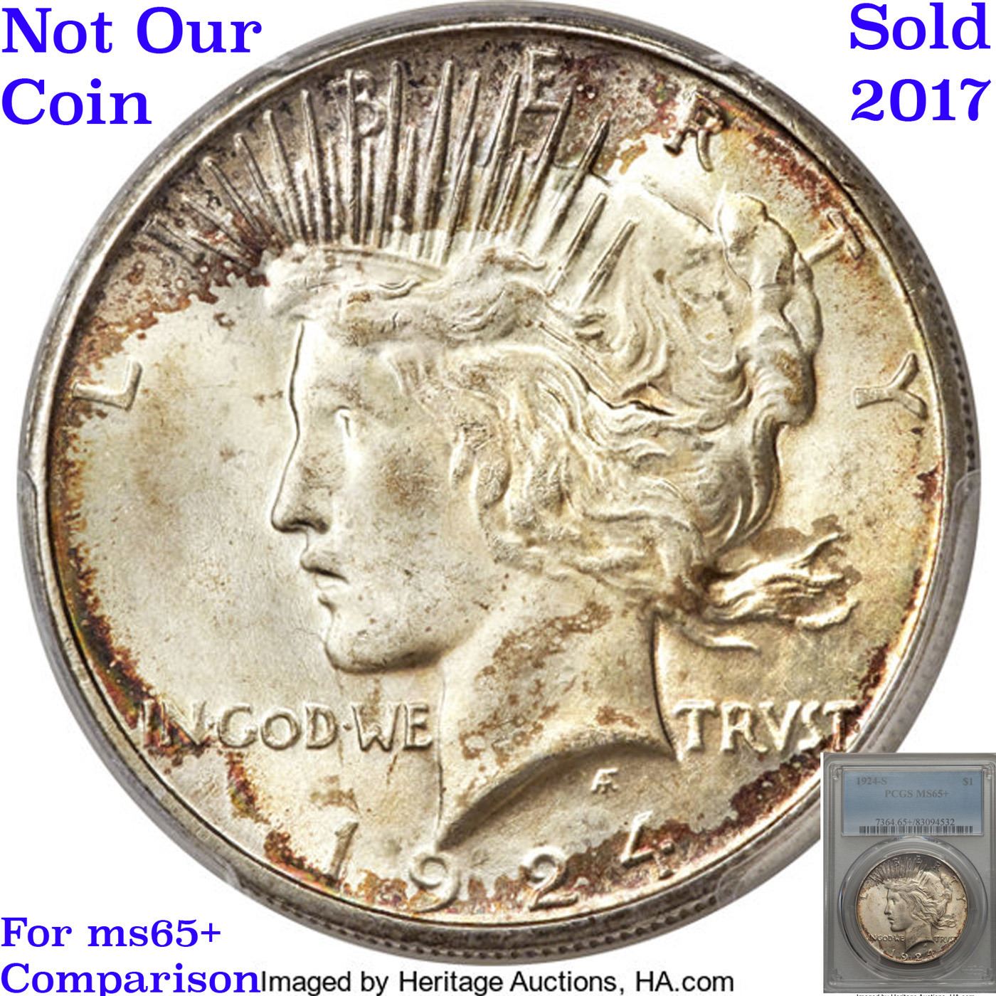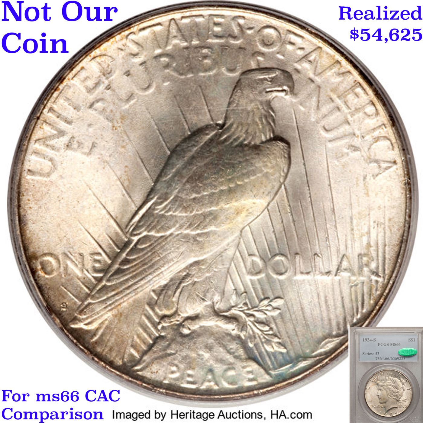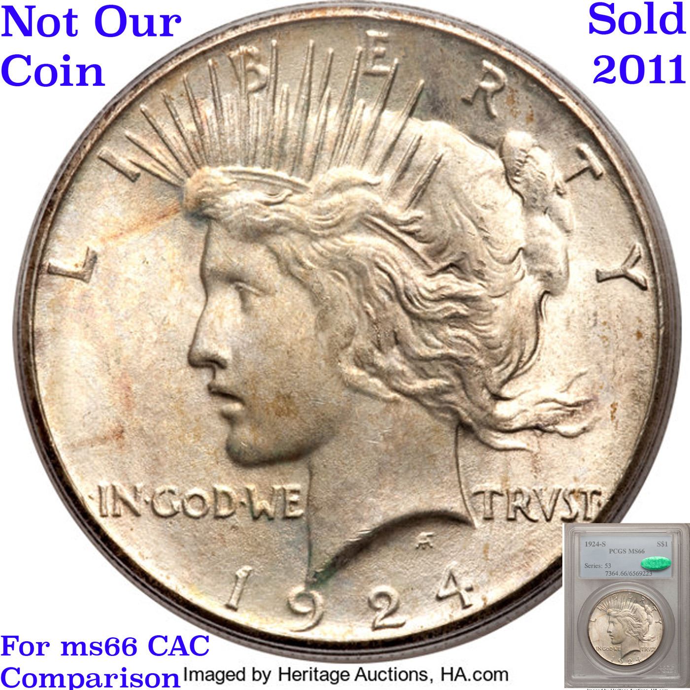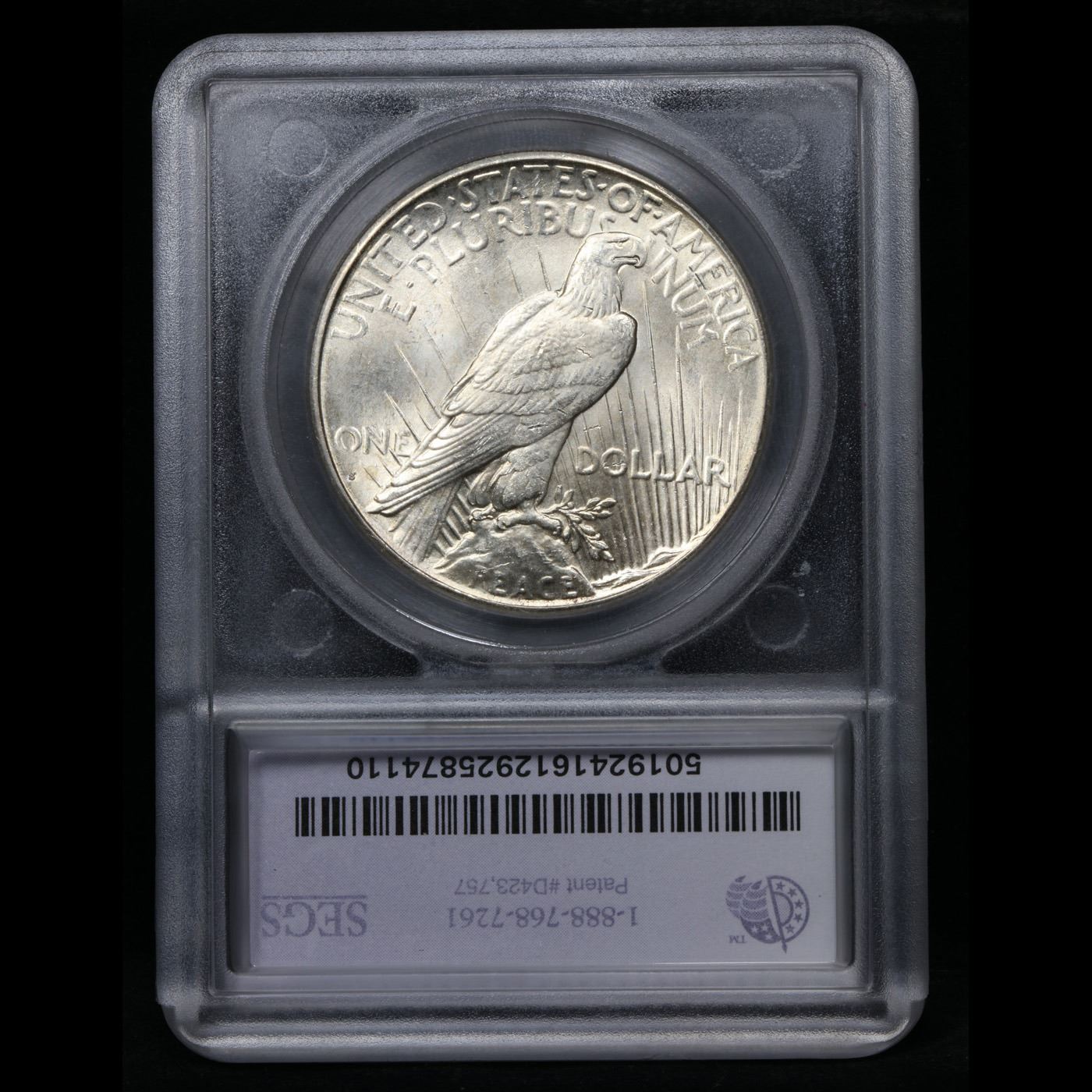 ***Auction Highlight*** 1924-s TOP POP Peace Dollar $1 Graded ms66 By SEGS. HIGHLIGHT OF THE NIGHT – Up for Auction is a Superb Key date of the Peace Dollar Series in ms66 Tied for Finest Known. An attractively original, exceptionally well preserved example of this key date Peace dollar issue. The surfaces are virtually untoned in silver-grey. The 1924-S is one of the better produced Peace dollar issues, and the present example does not disappoint in this regard, what with the detail universally sharp from the rims to the centers. It is the surface preservation, however, that truly sets this coin apart from the typical Mint State 1924-S dollar in today's market. Bathed in virtually pristine luster in a softly frosted texture, this extraordinary condition rarity would serve as a highlight in the finest Peace dollar set.The 1924-S represents a radical decline from the silver dollar mintages of previous years, with just 1,728,000 coins struck compared to the 19,020,000 made at the same mint the year before. Treasury vaults had been filling up over the previous three years and by 1924 there was little demand for more dollars, either for circulation or storage. Very few of these coins emerged throughout the 1940s and 1950s, and Q. David Bowers reports that the Redfield Hoard is said to have had only a few hundred individual coins. The low initial mintage and paucity of later releases insured that this issue ranks among the scarcer Peace dollars. Premium Gem examples like the present piece are rarities of the highest order, with most pieces noticeably abraded. Definitely a find for the astute bidder. I have included another ms66 example and an ms65+ for your comparison. A Corey's Pick, Bid to Win, Don't let it get Away, you might not find its equal Coin. I give this coin my highest recommendation