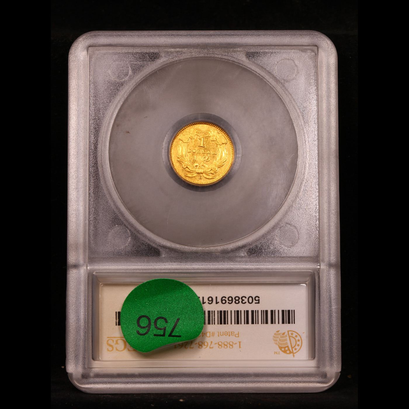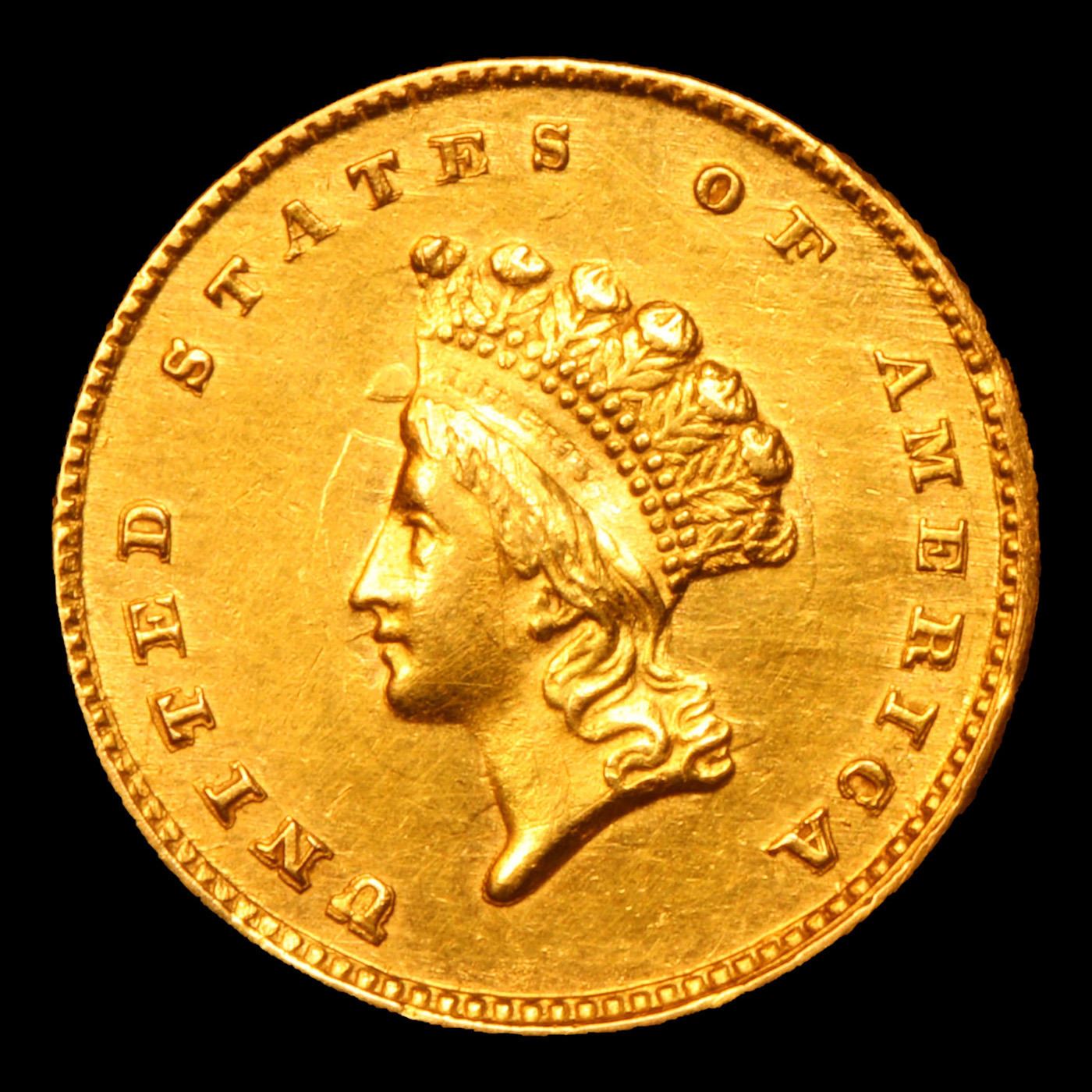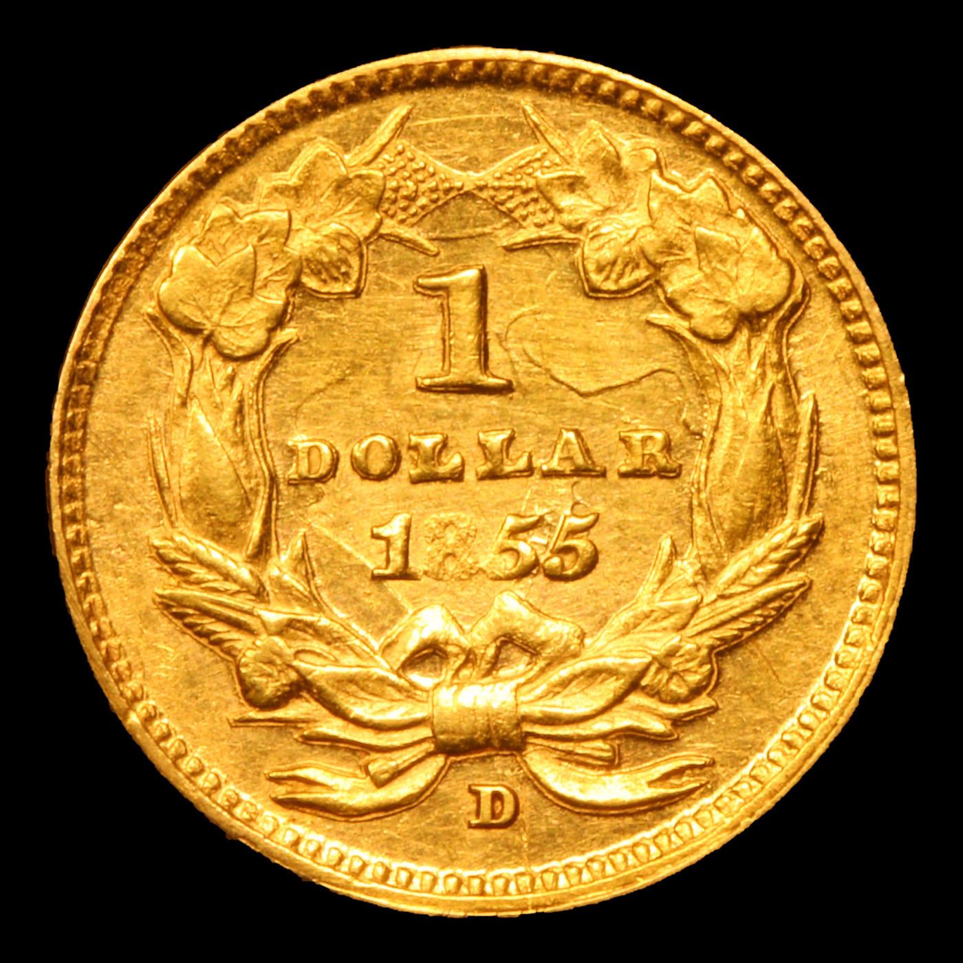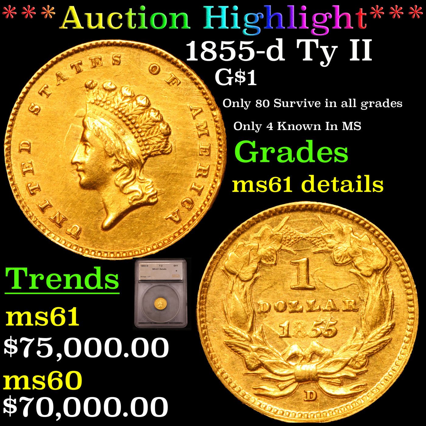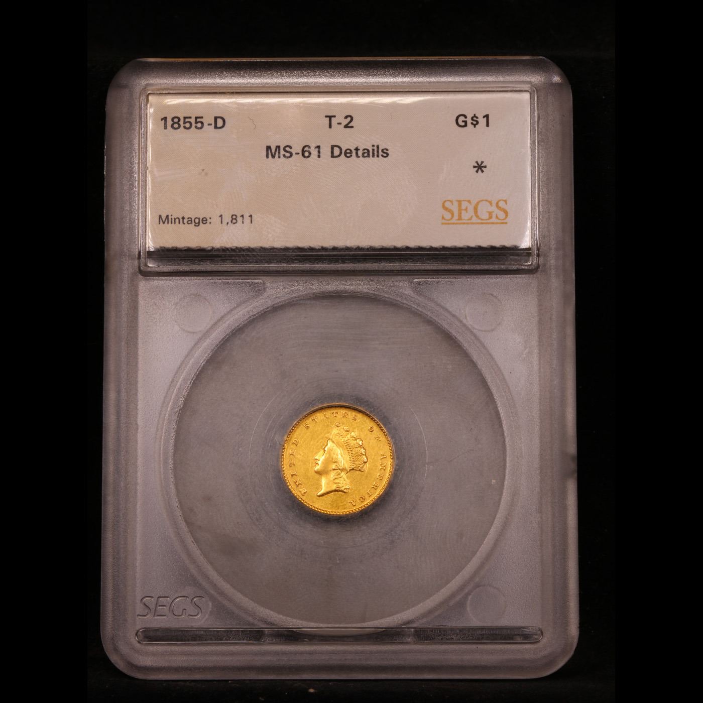 ***Auction Highlight*** 1855-d Ty II Dahlonega Gold Dollar $1 Graded ms61 details By SEGS. HIGHLIGHT OF THE MONTH – Up for Auction is an 1855-d Dahlonega Gold Dollar, Type II. The short-lived Type Two gold dollar subset, which ran briefly from 1854 to 1856, is always popular. Collectors can focus on putting together a complete set of six pieces, or they might just want one high-grade example. Alternatively, they may focus more narrowly on obtaining coins from the mints of their choosing: Charlotte, Dahlonega, New Orleans, Philadelphia, and San Francisco. Southern Type Two gold dollar production took place entirely within the year 1855, with the North Carolina and Georgia issues standing out as the two most challenging issues in the series and the 1855-O being relatively accessible. Between the D and C-mint issues, the Dahlonega 1855 gold dollar is far scarcer than its Charlotte counterpart, claiming the lowest mintage of the series with only 1,811 coins struck. Doug Winter estimates 75 to 100 1855-D gold dollars survive, mostly in VF and XF grades, writing in 2013: "There are an estimated four or five known in Uncirculated and this includes two that have been graded MS64 by the services." Although PCGS and NGC each now show two coins at this level, that is likely the result of crossovers and resubmissions. The Coin at hand, while it is details due to some light hairlines, it has virtually no abrasions and zero wear making it deserving of its ms63 Details Grade.Both sides are unimaginably clean and attractive, strongly struck, and attractive for an 1855-D representative. Light yellow-gold color paints satiny surfaces, and noticeable proof like reflectivity exists in the fields. Both sides are boldly defined, with the exception of Liberty's upper curls and the 8 in the date, as usual. Clashed with a die crack from the rim up along the right side of the mintmark to the ribbon. I wish you good luck in obtaining this fabled rarity. I have included a picture of an ms61 for your comparison. A Corey's Pick, Bid to Win, Don't let it get Away, you might not find its equal Coin. I give this coin my highest recommendation