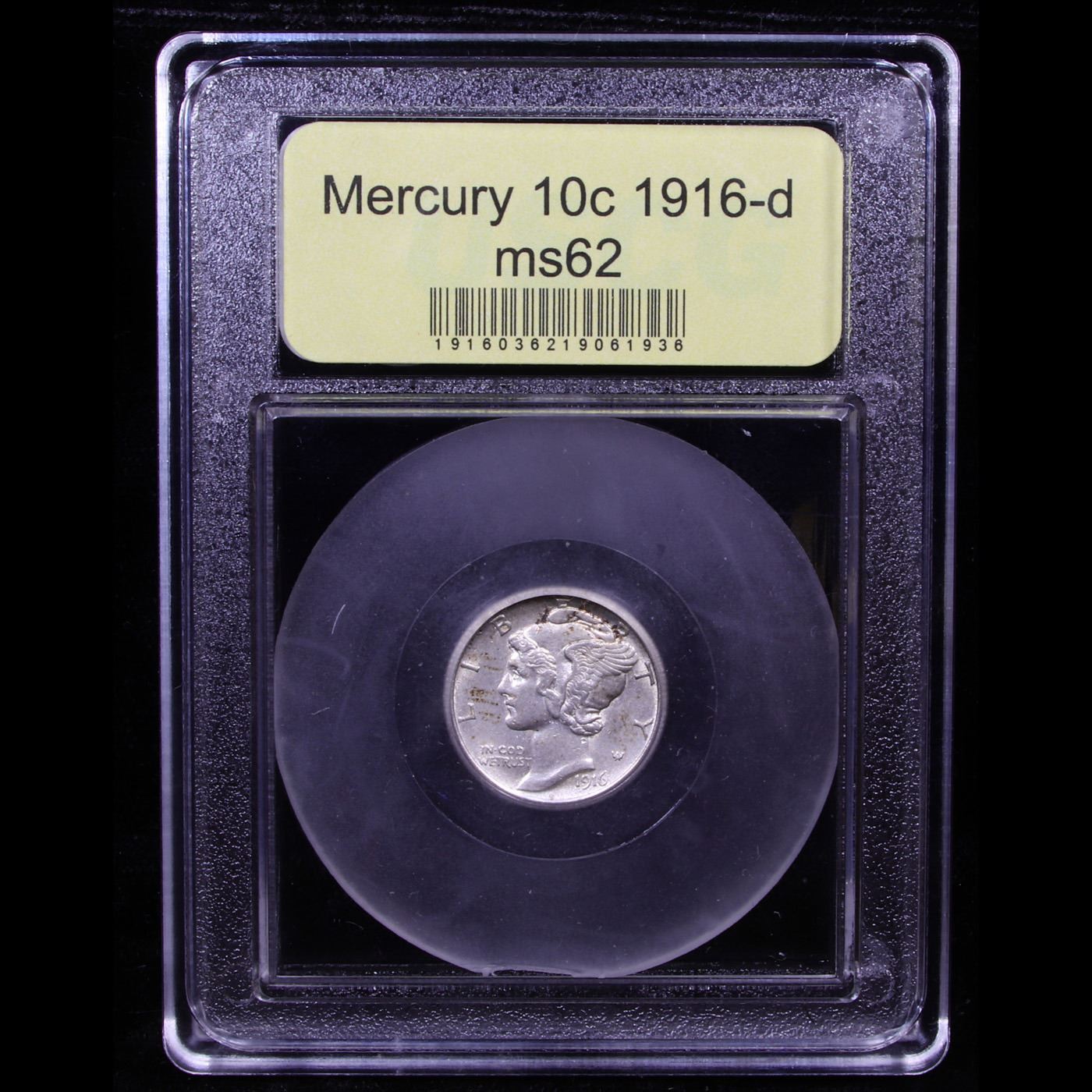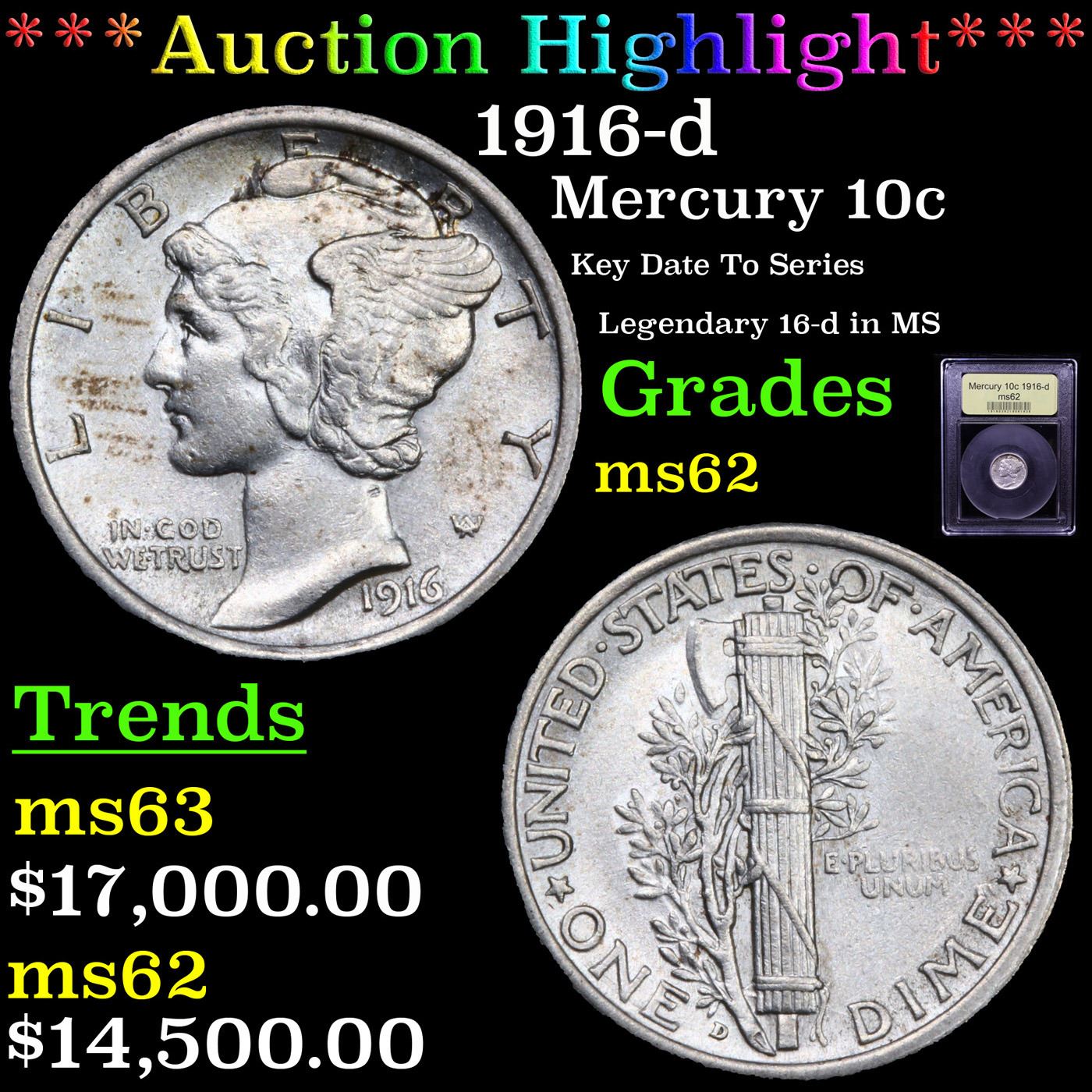 ***Auction Highlight*** 1916-d Mercury Dime 10c Graded Select Unc By USCG. HIGHLIGHT OF THE MONTH - Up for auction is a coin that usually comes between ag and vg. Up for auction is the legendary 1916-d Mercury Dime, but this time its in mint state ms62. At first glance this piece suggests a finer grade in terms of its overall appeal. The silvery surfaces are frosty, with cartwheel luster and a tinge of gold on each side. Under a high-power loupe, a few tiny areas of dark toning appear--on the obverse near the top rim and on the reverse tucked into some of the device crevices--but they are not readily visible otherwise. The horizontal bands are completely visible, but they are neither fully split nor totally rounded, the criteria for a Full Bands designation. This piece is nonetheless quite appealing and will fit well into a Mint State or high-grade circulated set A Corey's Pick, Bid to Win, Don't let it get Away, you might not find its equal Coin. I give this coin my highest recommendation