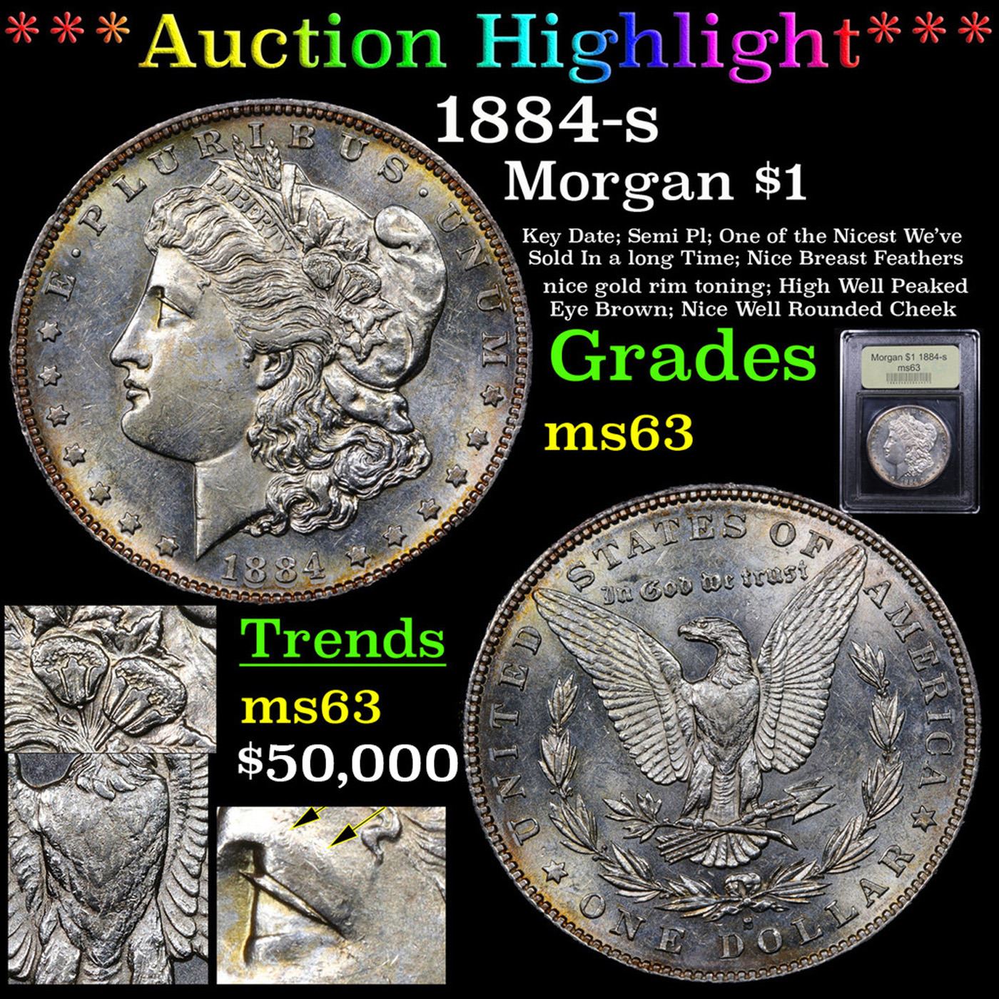 ***Auction Highlight*** 1884-s Morgan Dollar $1 Graded Select Unc By USCG. HIGHLIGHT OF THE NIGHT - Up for Auction is a superb 1884-s Morgan Dollar. The 84-s is a legendary condition rarity of the series. This example has flashy luster, a dynamite strike and light golden/apricot toning throughout the obverse and reverse. Nicely struck with a full well peaked eyebrow and well detailed breast feathers. A wonderful addition to any cabinet. A Corey's Pick, Bid to Win, Don't let it get Away, you might not find its equal Coin. I give this coin my highest recommendation