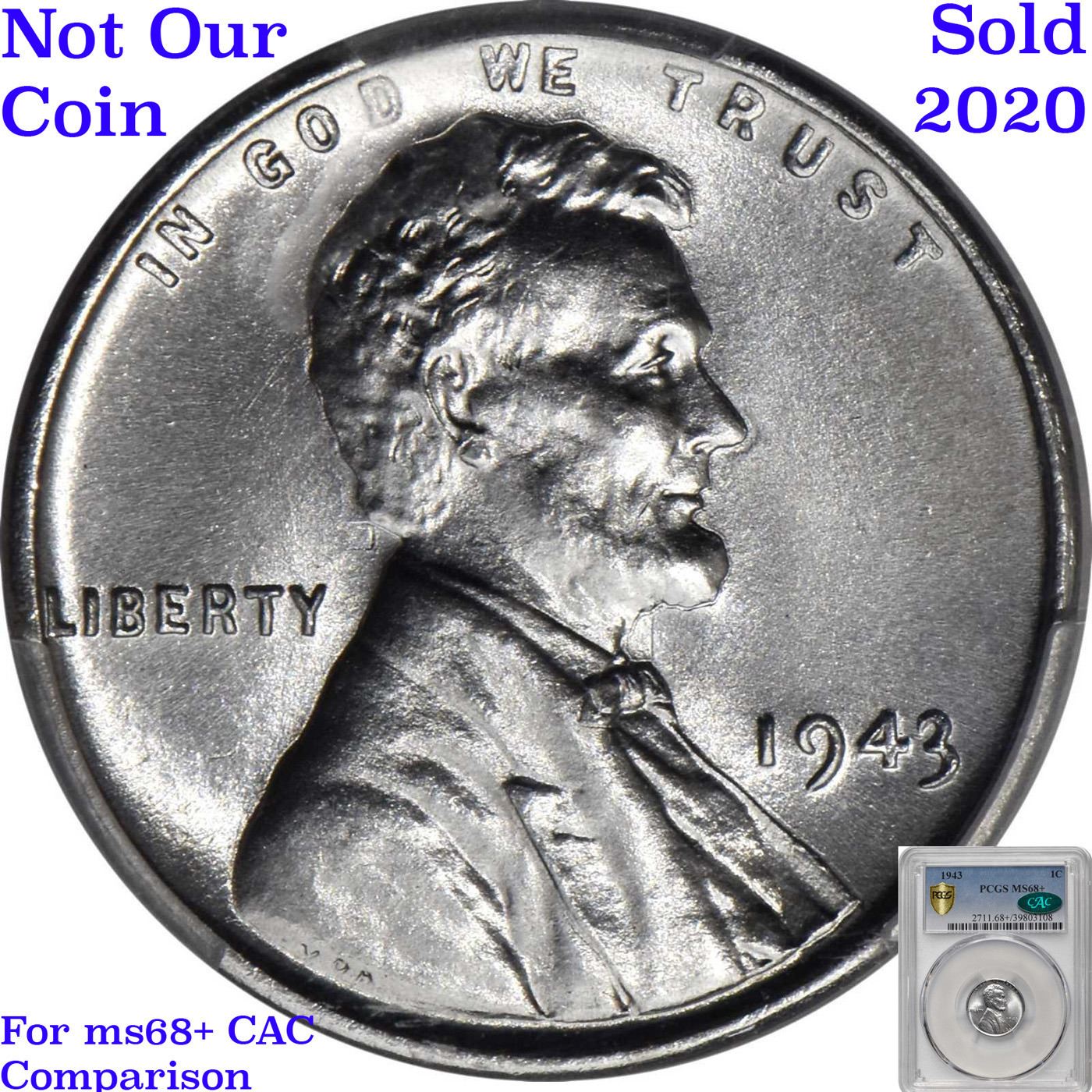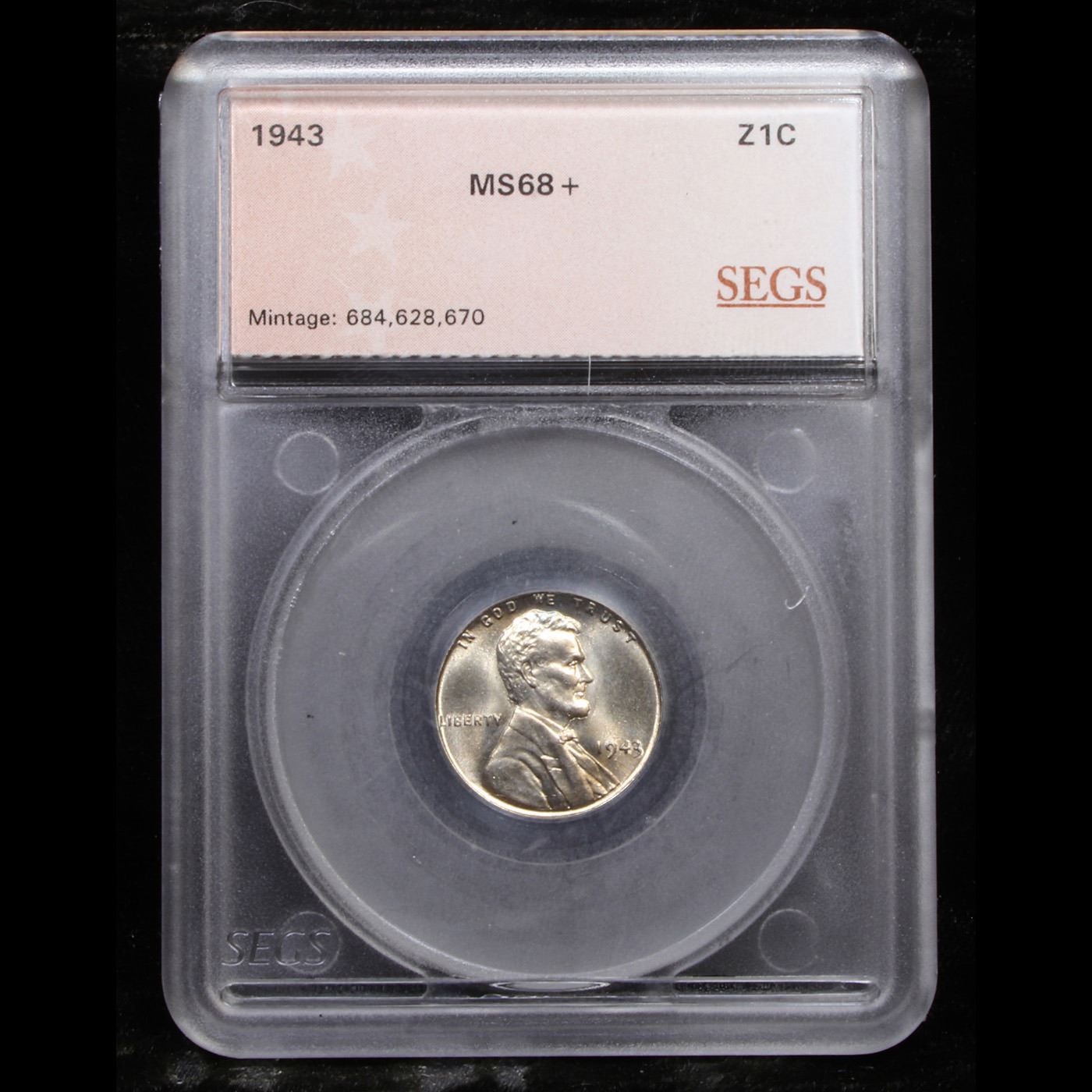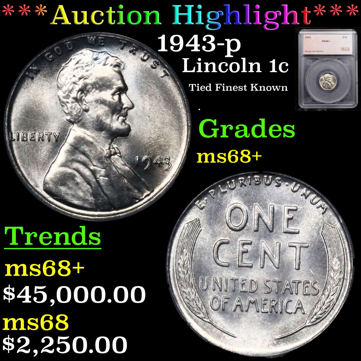 ***Auction Highlight*** 1943-p Lincoln Cent 1c Graded ms68+ By SEGS. One year type coin. The much heralded, "Steel" WWII cent. Great example of a favorite coin. The 1943-p Wartime issue Steel Cent. HIGHLIGHT OF THE NIGHT - Up for Auction is a near perfect example of one of Everyone’s Favorite Coin. The 1943 Steel Cent. in TOP POP ms68. TIED with 3 coins for finest known! The collector seeking the finest in technical quality and eye appeal in an example of the historic steel cent type of 1943 need look no further than this gorgeous Superb Gem. Silky smooth surfaces are free of even the most trivial blemishes. Highly lustrous, both sides are fully endowed with lively satin to softly frosted mint luster. Fully struck with a bright, fresh appearance, this virtually perfect example is sure to have no difficulty finding its way into a high ranked Lincoln cent collection. Also a strong candidate for inclusion in a world class type set, we expect spirited bidding for this offering from many quarters.The entry of the United States into the Second World War shifted the focus of the American economy toward the war effort. The production of Lincoln cents consumed a substantial quantity of copper, a valuable strategic metal in the production of ammunition, especially shell casings. The Treasury Department experimented with several different alternative compositions, including aluminum, plastic, pressed fiber (a material already being used in the production of coal scrip and OPA ration tokens), and even various forms of glass. Ultimately, zinc-coated steel was selected and all three mint facilities got to work coining hundreds of millions of steel cents, of which Philadelphia produced the most at 684,628,670 pieces. Unfortunately, the two metals employed (zinc and steel) reacted with one another, especially in damp or humid environments, which caused the coins to quickly discolor, form spots of zinc corrosion, and even rust. In the end this novel, yet problematic metallic composition was only used in 1943, creating a one-year type (the famous off-metal strikings of the date notwithstanding). Today, steel cents are among the best known of all Lincoln cents and have been popular with collectors since the time of issue. While readily available in Mint State, most display the aforementioned spotting, marring what would otherwise be high quality surfaces. Interestingly, the 1943 is rarer than the 1943-D and 1943-S in the finest Mint State grades, despite the fact that the two branch mint issues have considerably lower mintages (217,660,000 and 191,550,000 coins, respectively). Indeed, a quick perusal of our auction archives will confirm that the typical MS-68 for this type offered in today's market is a product of the Denver or San Francisco facility. This coin is far finer than a typical ms68, and it is sure to fetch a strong price commensurate with its awesome rarity and breathtaking beauty. I am including the only other ms68+ to ever come to auction, it realized $33,600 in 2020. I wish you good luck A Corey's Pick, Bid to Win, Don't let it get Away, you might not find its equal Coin. I give this coin my highest recommendation