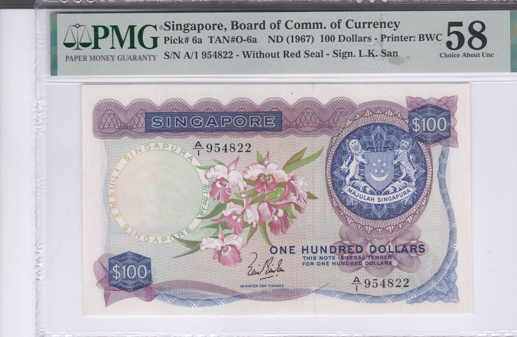 [亮點] 星加坡, ND (1967), $100, 編號: A/1 954822. PMG. 少有星加坡首次發鈔「蘭花系列」A/1 首發冠, 難得近未使用品相, PMG 評為58分高分