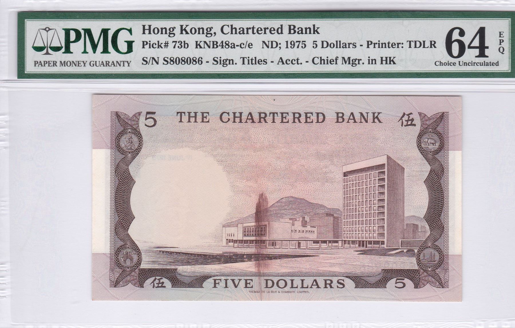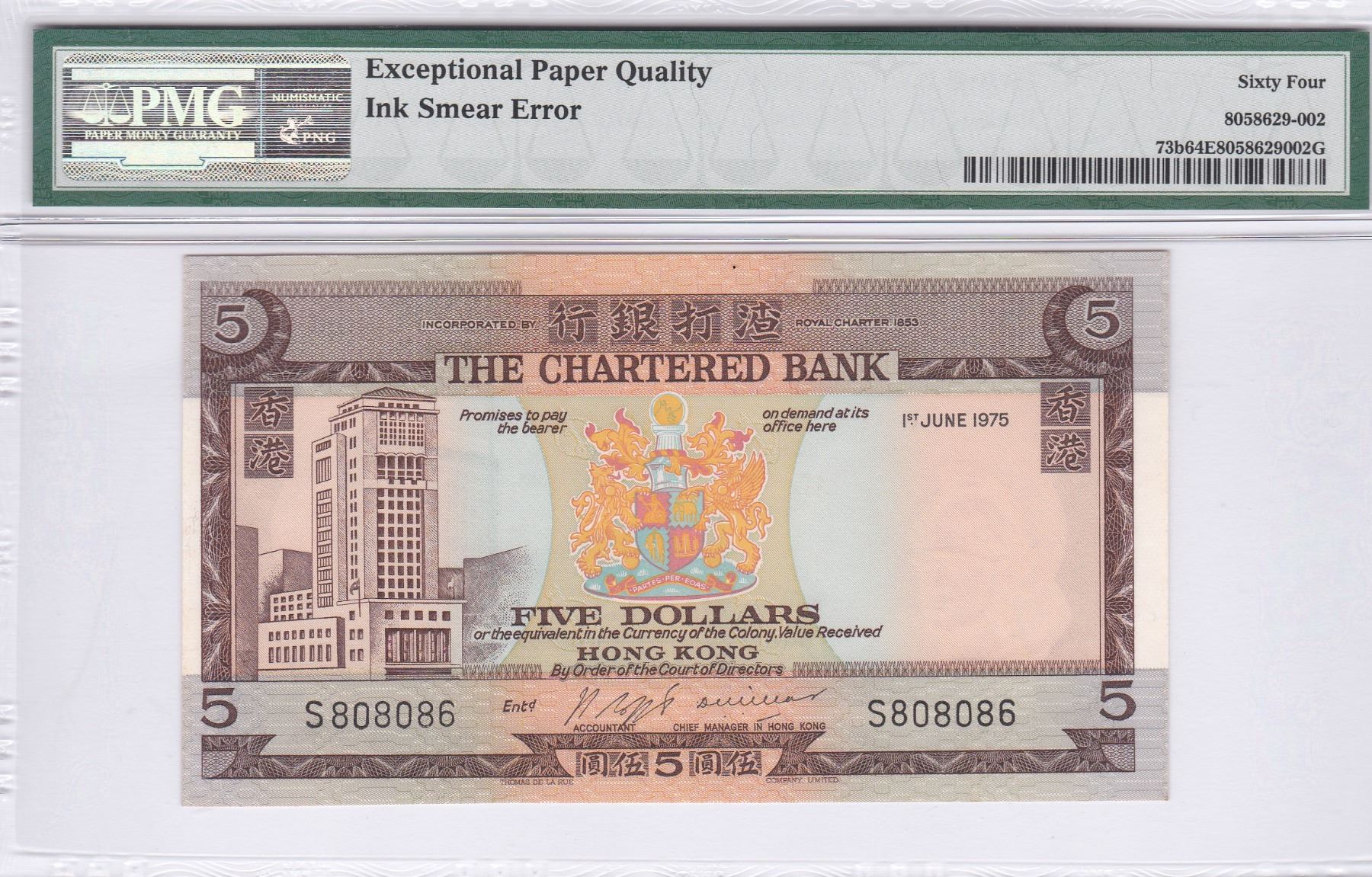 1975,渣打銀行, $5, 編號: S808086. PMG 64EPQ. 難得直版漏墨錯體, 重要年份