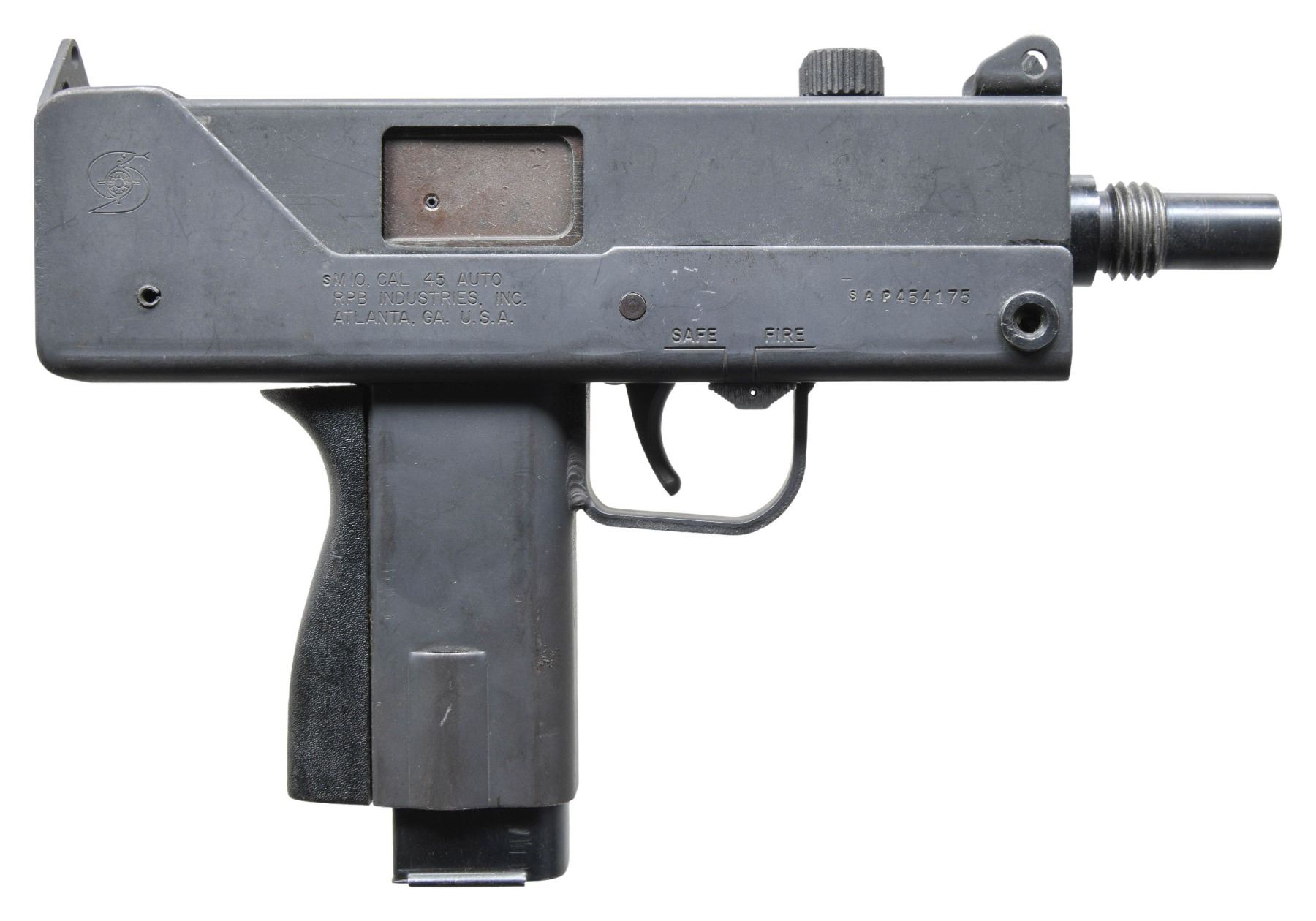 PISTOL. Cal. 45 ACP. S# SAP454175. Bbl. 6" threaded. The full-size MAC 10 semiautomatic pistol. There are very few firearms that conjure up the imagination of the general public more than the mere mention of the MAC 10. The Ingram Model 10 was originally designed in 1964. It would become the 1st of many small simplistic SMGs to contrast the expensive & labor intensive earlier variants such as the Thompson & Reising M50. Ingram's 2 basic guidelines while designing the Model 10 "simple & cheap" while remaining effective & reliable. Made famous mostly by Hollywood, the M10 had appearances on the silver screen & on television eventually earning the infamous title of "The Gun That Made The 80's Roar" starting w/ John Wayne utilizing a suppressed 9mm M10 in the 1974 movie "McQ". A favorite example used by the organized anti-gun movement, the Mac 10 was eventually, incorrectly & inaccurately synonymous w/ every crime committed for a long period of time. The semiautomatic M10 was originally offered as an open bolt system just like its predecessor the M10 SMG. The BATF determined that the open bolt semi autos met the criteria of a machine gun under the "readily restorable" clause & banned future manufacture, grandfathering those that were assembled and in commerce on or before June 21, 1982 under ATF ruling 82-8. Like everything else the Federal Government tells citizens they can not have, interest in these early originals immediately skyrocketed & they have been considered highly prized collectibles for over 40 years. This is an example of that early operating mechanism, before changes to a closed-bolt system were mandated. Complete & consistent dark parkerized finish on both upper & lower receivers. This is a factory 45ACP variant manufactured by RPB Industries in Atlanta, GA. These pistols are very similar to the SMG in both operation & aesthetics w/ only a few differences. Outwardly, the slots for the SMG shoulder stock are not milled in the backplate, and the selector lever on the left side is absent, since it is unnecessary. Sights consist of a fixed protected post front, and a fixed rear peep, consisting of a raised extension of the back plate. The slotted cocking knob is nestled between the sights. Safety is in the front, right section of the trigger guard. The cocking handle also functions as a safety, where rotating it 90º locks the action. The self-loading operating system is blowback operated and fires from an open bolt. It utilizes a fixed firing pin, integral to the bolt face. Right side of receiver is marked w/ the familiar Cobray snake & globe logo and the following stamping: "SM10. CAL 45 AUTO / RPB INDUSTRIES, INC. / ATLANTA, GA. U.S.A." as well as the selector markings; "SAFE" & "FIRE" above the trigger guard. MAGS: 1 Cobray 15 rd. CONDITION: Finish coverage remains quite complete, w/ some typical thinning, primarily on high spots & in areas of mechanical intervention. It also displays some typical drag lines often caused by stacked storage. Some scattered patina & pitting throughout, most pronounced on the left side, & bottom of lower receiver. Bore is bright w/ descent rifling. Fire control mechanism appears to function correctly when cycled by hand. PROVENANCE: Lifelong Collection of Terrence McCarty. (24-123/JZ). MODERN. $500-900..