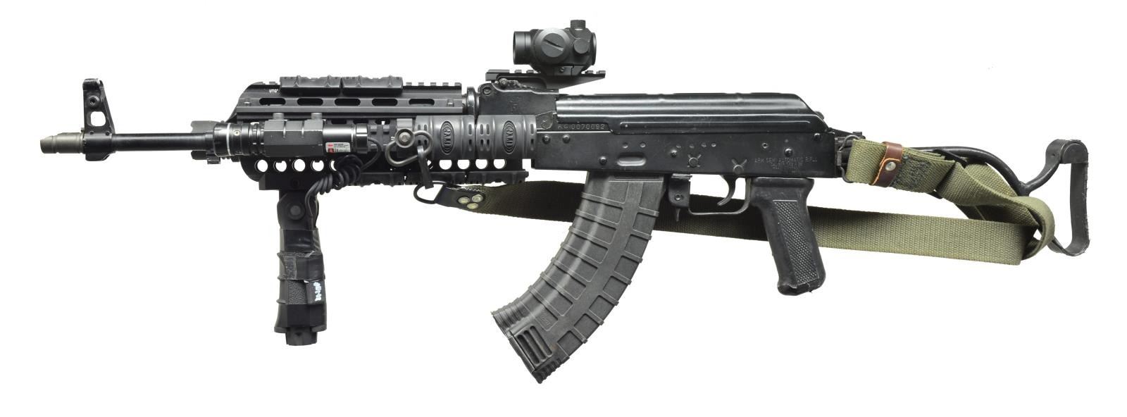 Cal. 7.62x39. S# AC0070092. Bbl. 16". An original MAADI ARM rifle accessorized by previous owner to now sport what appears to be a Romanian push button style right side folding stock complete w/ rubber silencer. Close inspection reveals that the checkering on the pistol grip is inletted which is indicative of Romanian grips typically made of Bakelite. This particular grip appears to have been dipped in a rubber plastic coat & may possibly be restored to its original condition. Correct slant muzzle break made by TAPCO unable to verify thread condition. Factory bayonet lug still retains a resemblance of its ears & is drilled to host an on board cleaning rod. Factory original forearm has been replaced w/ a UTG rail system which provides picatinny rail space all around. At 6:00 resides a UTG folding vertical grip containing pig tail pressure switches for a left side mounted green laser & a right side mounted weapon light. Rear sight has been replaced w/ a trunnion mounted Strike Industries rail section currently hosting a red dot Sig Sauer STS-081 sight. Front sight protected post has been replaced w/ a Trijicon luminous bead. Receiver markings indicate importer as A.C.C. INT/ INTRAC. of Knox, TN. Right side controls on stamped receiver. Left side mounted green canvas sling. MAGS: 1 TAPCO metal 30 rd. CONDITION: finish on exposed metal surfaces still illustrates complete coverage. Folding stock locks tightly. Laser, light & sight seem to function properly. Bore is clean w/ good rifling & fire control mechanism appears to function correctly when cycled by hand. (21-1456/JZ). MODERN. $500-700.
