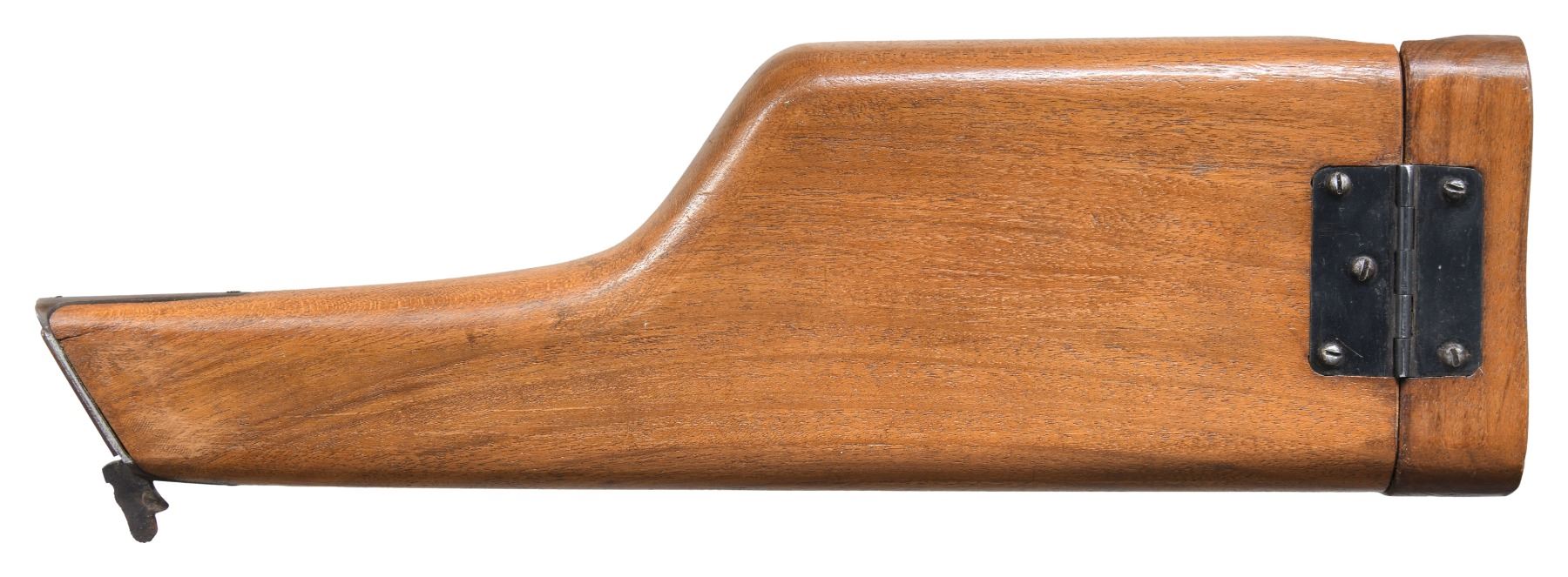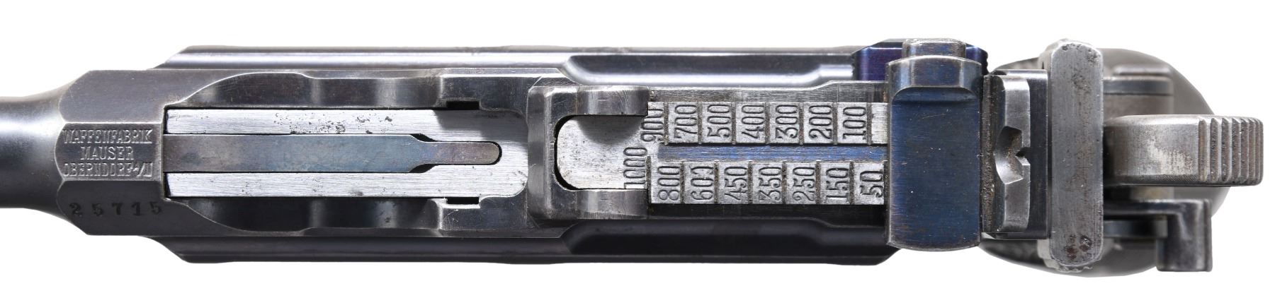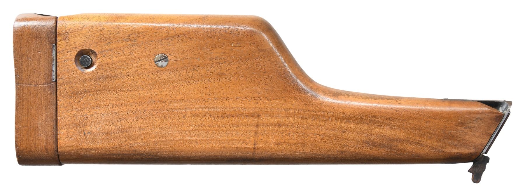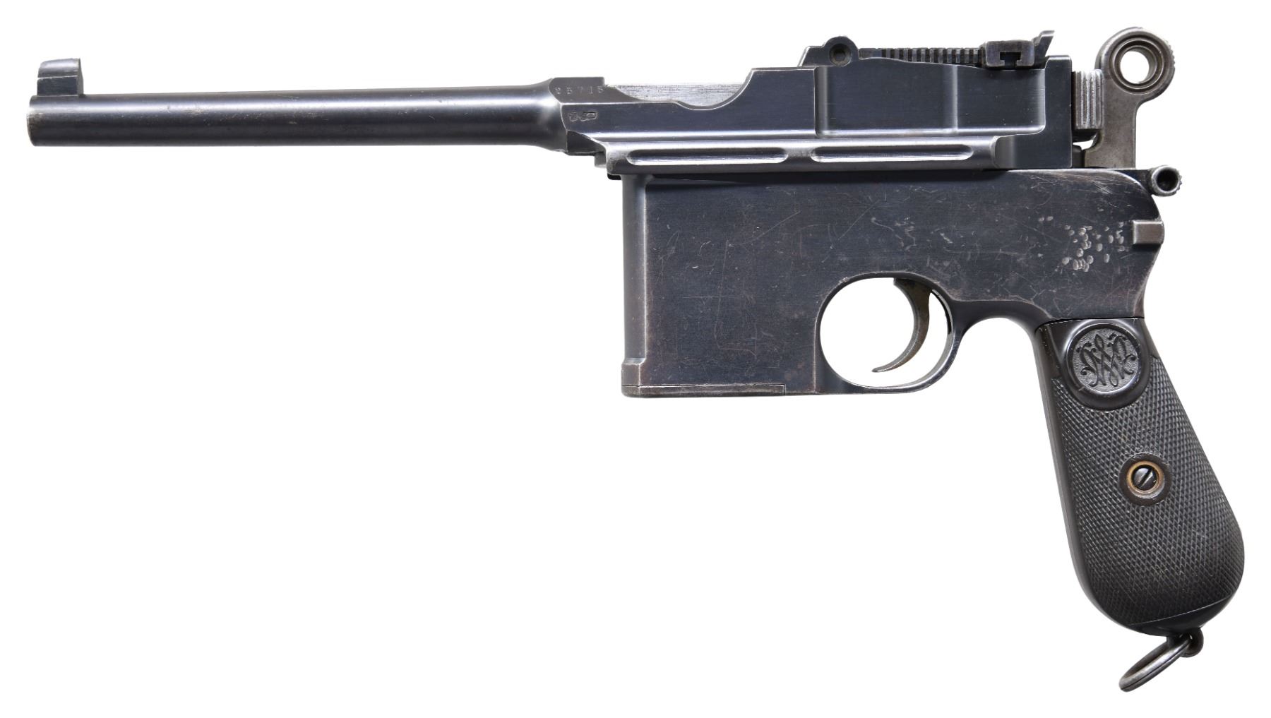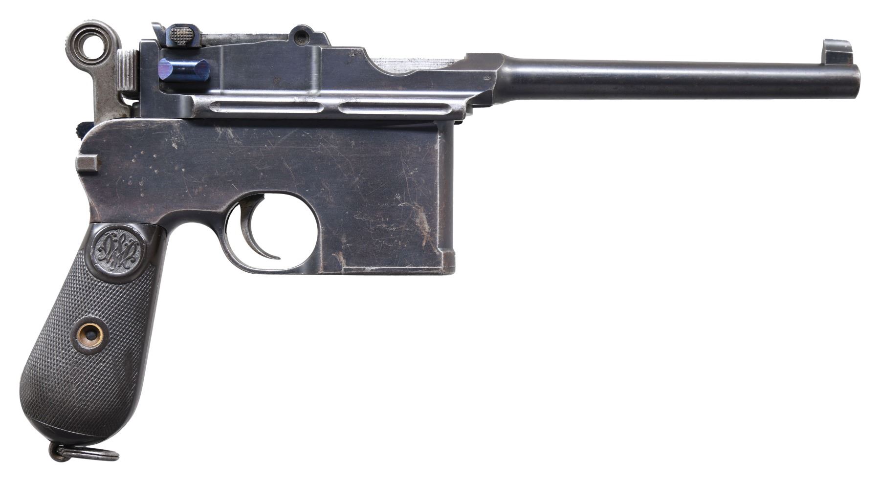 SEMI-AUTOMATIC PISTOL WITH STOCK. Cal. 7.63mm. S# 25715. Bbl. 5 1/2". C96 flatside semi-automatic pistol mfg. by Mauser for commercial sales. The top flat of the chamber is marked "WAFFENFABRIK/ MAUSER/ OBERNDORF A/N", with the S# marked on the left quarter flat, a double crowned "U" commercial proof on the left flat, and an Ulm Proof House antler marked on the right. Frame and bbl. extension exhibit a rust blue finish, with the trigger exhibiting a straw finish. Bolt is polished in-the-white. Frame is mounted with 2-piece "MW" monogram checkered brown hard rubber grips. Fixed blade front sight, with V-notch tangent sight, graduated 50-1000. Slotted flatside frame, with lanyard ring, long extractor, single lug firing pin, and large ring hammer. Nearly all serialized parts are matching and include the frame, floorplate, hammer, lock frame, transfer bar, sear, locking block, bbl. / bbl. extension, rear sight bar, rear sight cursor, as well as the firing pin. Grips are matching via the full S#, which is lightly inscribed on the interior of the panels. Bolt is numbered "2988" on the rear. Follower is a replacement, with the bolt stop also appearing to be a replacement. UNATTACHED ACCESSORIES: unmarked wood stock that has been sanded and revarnished at one time. Stock iron does not fit properly to frame. CONDITION: metal components retain the majority of their original factory rust blue finish, exhibiting some areas of light to mild wear and thinning that shows through to gray patina, with scattered superficial handling marks, some light surface oxidation, as well as some spots of dark mild surface oxidation overall. Left side of frame exhibits scattered dings at the rear. Trigger retains the majority of its straw finish, with the front face exhibiting wear through to gray patina. Nitre blue parts are very good, with some light to mild edge wear. In-the-white parts show scattered spots of age related discoloration, with the bolt exhibiting some scattered spots of light to mild pitting. Bright bore, exhibiting consistent light pitting, while retaining well defined rifling throughout. Grips show smoothing, as well as some superficial marks from handling and storage, but otherwise remain sturdy and serviceable. Stock is good, exhibiting some superficial handling marks and minor impressions, with a crack present on one side of the iron, and a large chip present on the other. A nice example of a desirable Mauser C96 flatside pistol. (25-512/MLW). CURIO. $2,500-3,500.