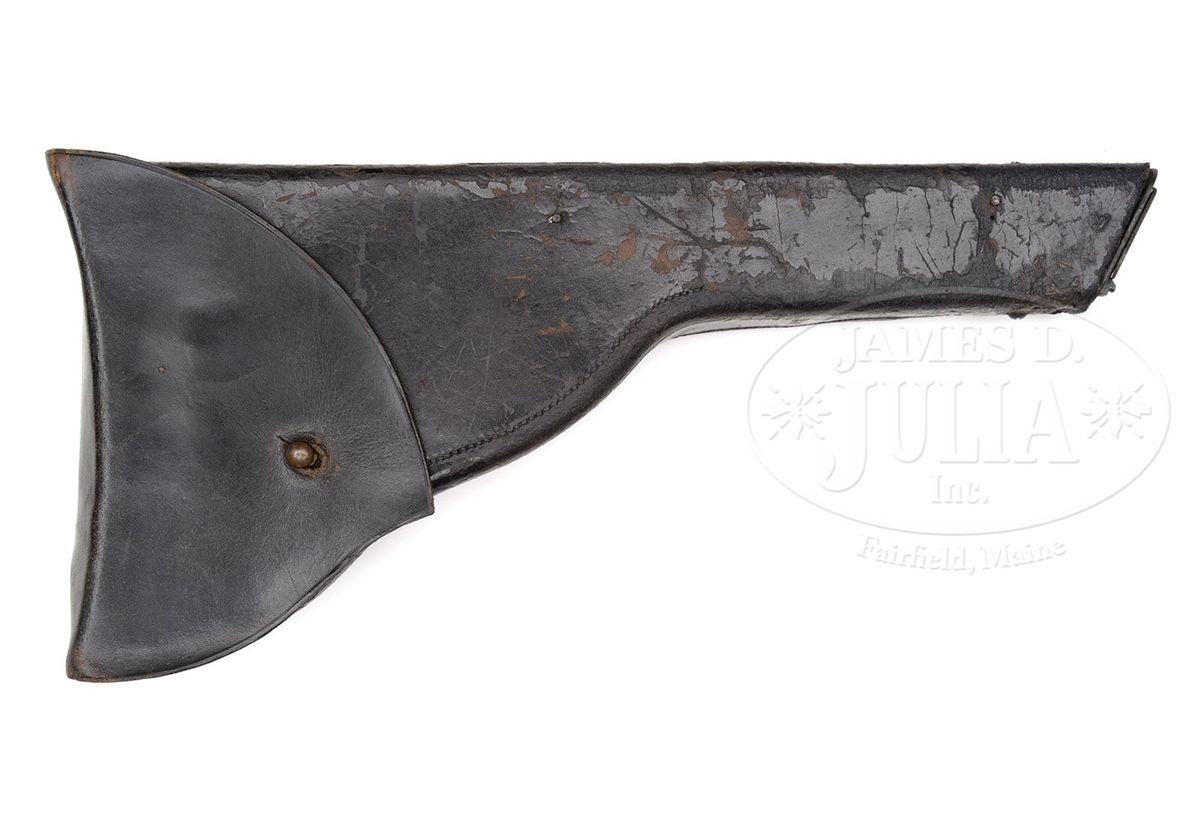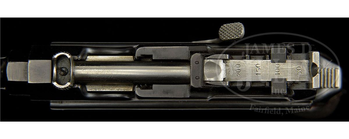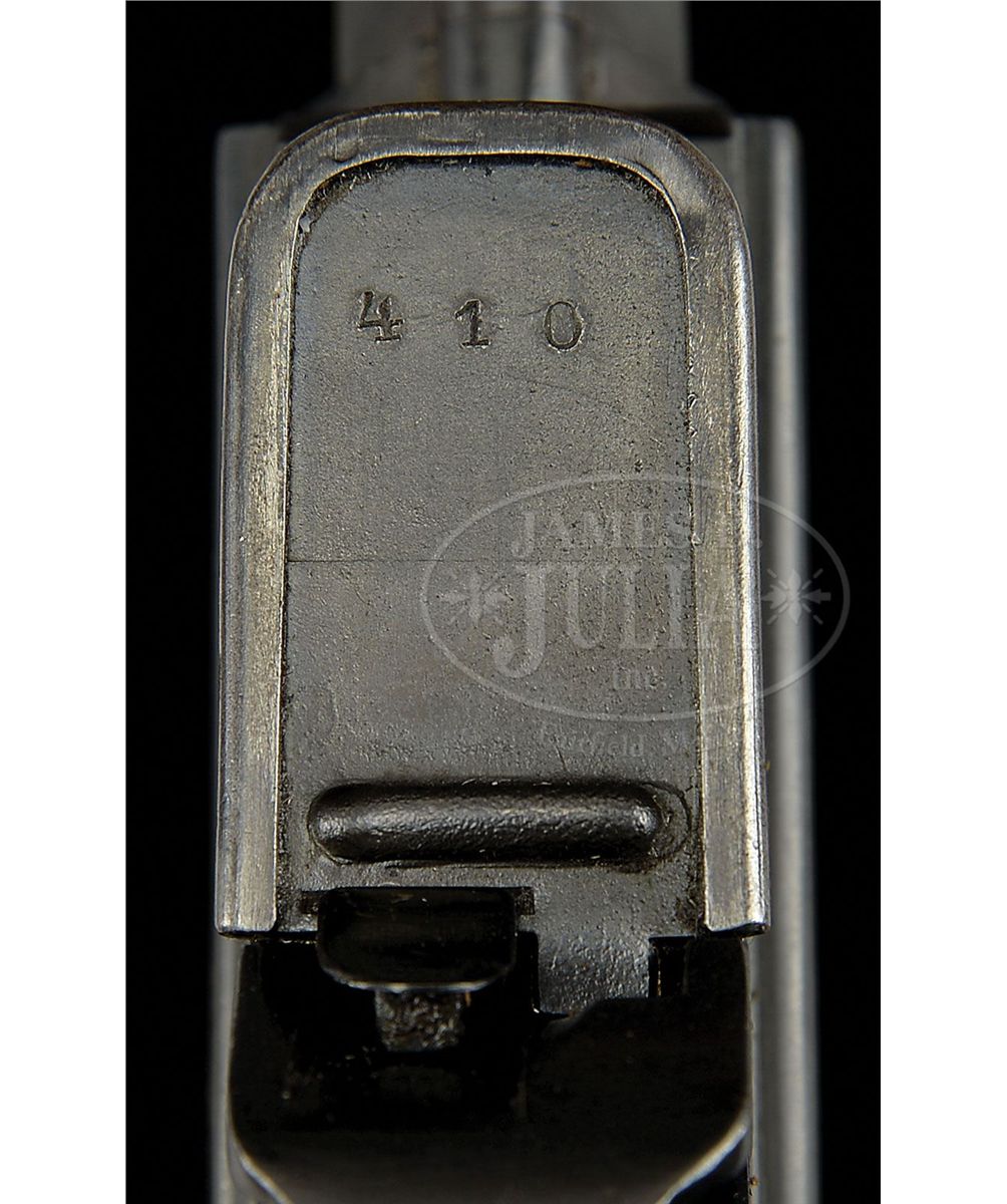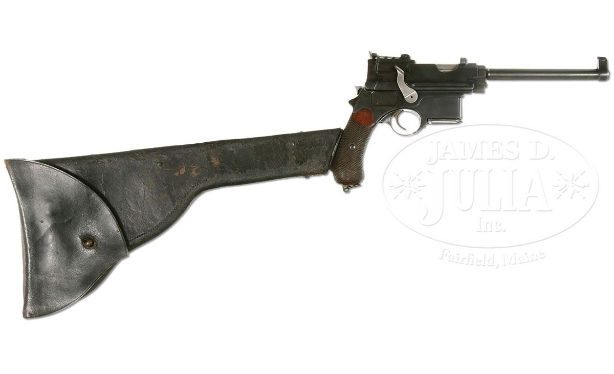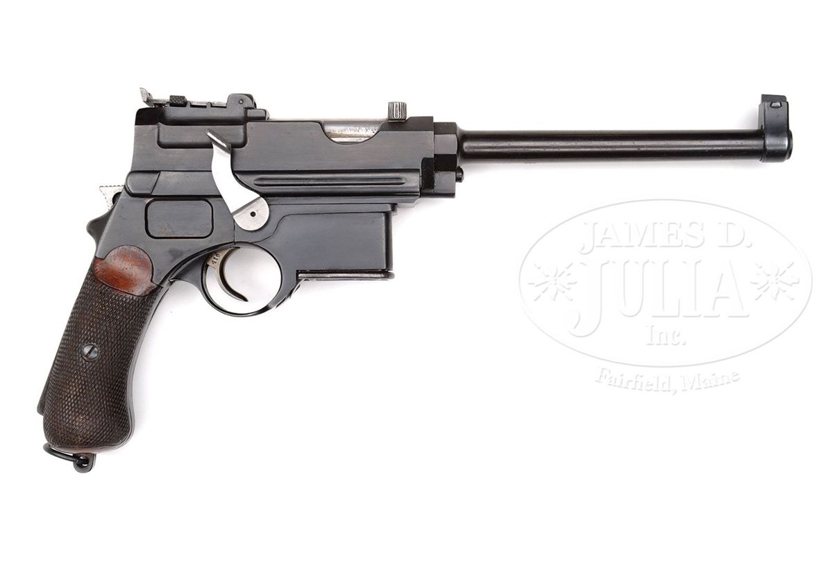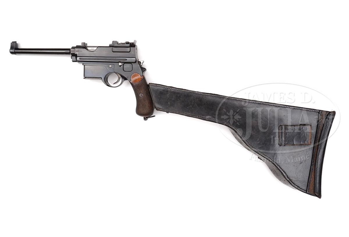 SN 410. Cal. 7.65mm. Mannlicher made very few pistol carbines with long bbl and tangent sight. This example has a 6" bbl with an elevated drift adjustable front sight and a tangent rear sight with four step gradations from 50-200. The SN 410 is repeated forward of the front sight base, on the left side of the chamber, the left side of the receiver, the right side of the trigger and on the bottom of the detachable magazine. Adjacent to the bbl and receiver numeration is a small Crown/Crown/U marking that is repeated on the left side of thellustr. Motz/Schuy bolt. "722" and "LLJ" are marked in small characters under the bbl. There is a large cocking lever on the right side of the frame. To operate, the bolt needs to be withdrawn and then released, similar in operation to a C96. Pulling the trigger will fire the pistol and allow the cocking lever to rotate forward. The small serrated projection over the tang is the safety. Moving the safety up blocks the cocking lever to prevent firing. Accompanying the pistol is an original black leather shoulder stock whose body is matched to the pistol with a "410" marked in the leather along the lower spine, just behind the stock lug screw. PROVENANCE: Dr. Geoffrey Sturgess Collection. Illustr. Motz/Schuy: "Vom Ursprung der Selbstladepistole" pp. 302,303. CONDITION: Expertly refinished with nearly 99% of restored blue. Edges are sharp and planes are flat though the numbering is somewhat shallow and the proofing weak. Old oxidative etching is faintly apparent on the bolt and safety. The sight bar is in-the-white as is the cocking lever. The trigger has had its straw refreshed over some oxidative toning. Grips appear original though the screw has been refinished. Bright bore with strong rifling and only minimal oxidative change. Perfect mechanics. Original shoulder stock with considerable crazing of the body that retains its original pull up strap. The numbering near the lug is original and undisturbed. Although the pistol has been restored, the work has been extremely well done and should pose little detriment to anyone who wishes to add this charismatic arm to their collection. 4-52057 LMA100