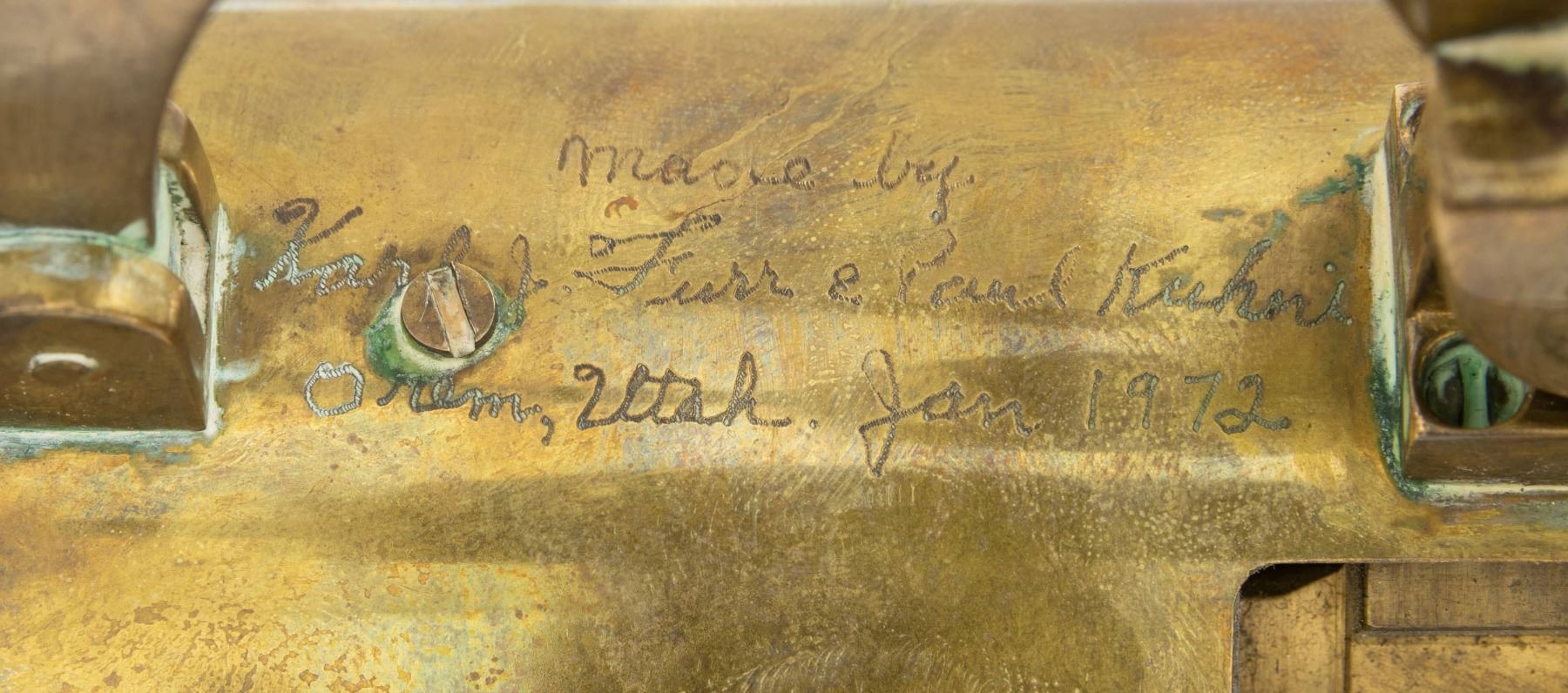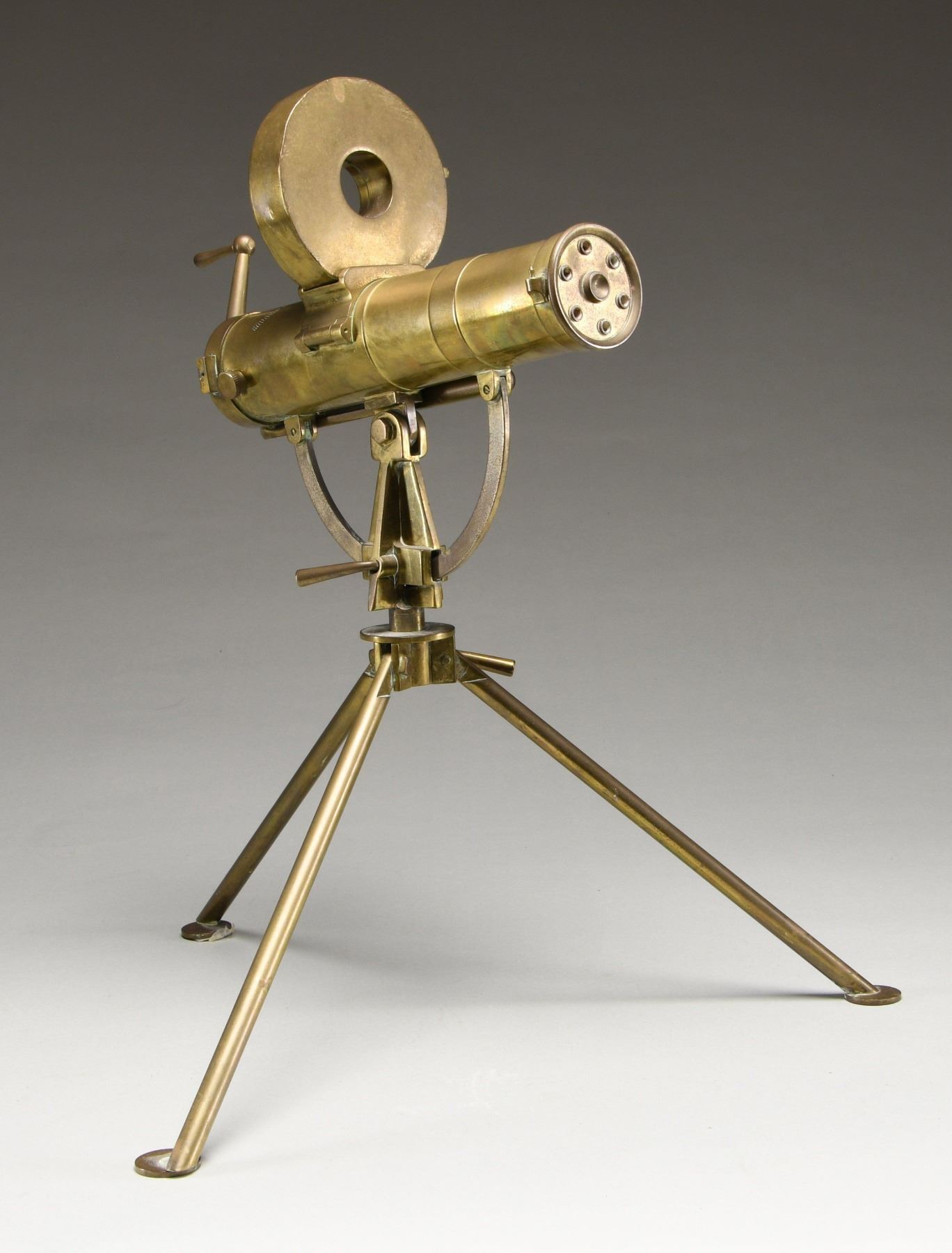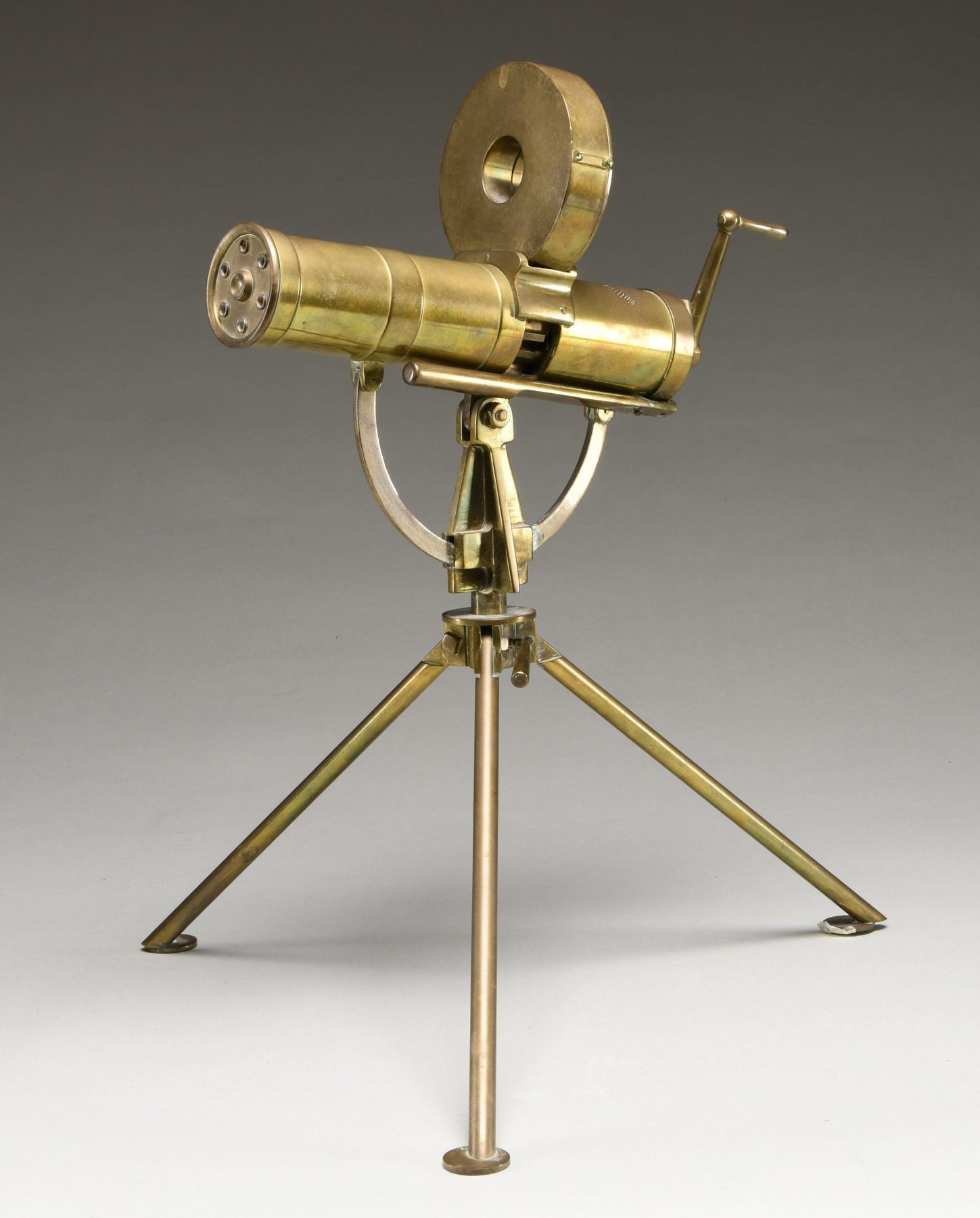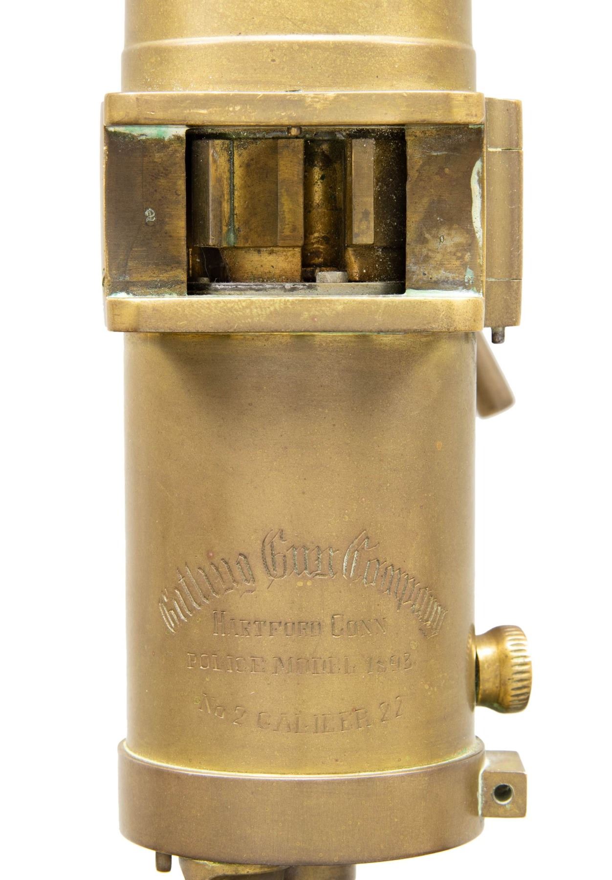 MODEL 1893 .22 RIMFIRE BRASS GATLING GUN WITH TRIPOD, MADE BY KARL FURR & PAUL KUHNI. Cal. 22. S# 2. Bbl. 6". Police Model 1893 miniature gatling gun chambered in .22 Rimfire mfg. by Karl Furr and Paul Kuhni. Top of the receiver is marked "Gatling Gun Company/ HARTFORD CONN/ POLICE MODEL 1893/ NO 2 CALIBER 22", with "made by/ Karl J. Furr & Paul Kuhni/ Orem, Utah Jan 1972" marked on the underside. Brass construction with full length brass bbl. cluster housing. Matching numbers are present on the receiver, feed tray, internal cyl., pintle, and elevator lever. Rear sight and bottom pintle screw are absent. MAGS: 1 matching Accles pattern "donut" 61-rd. drum mag. UNATTACHED ACCESSORIES: matching brass tripod with matching handle. CONDITION: brass retains a dull patina, exhibiting scattered spotting and areas of verdigris. Mirror bores, retaining strong rifling throughout. Proper manual mechanics, although action is stiff at approx. the 2 o'clock position. A very attractive, early, and desirable Furr miniature gatling gun. PROVENANCE: Norm Flayderman family collection. (25-2127/MLW). CURIO. $5,000-7,000